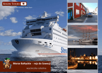 Wejdź w świat podróży z Bison Tours Morze Bałtyckie - rejs do Szwecji wycieczka szkolna Program ramowy Dzień 1. Toruń Zbiórka pod wybranym przez Państwa miejscu i wyjazd w kierunku Torunia– jednego z najstarszych polskich miast. Toruńskie Stare Miasto od 1997 roku znajduje się na Liście Światowego Dziedzictwa UNESCO. Miasto kojarzone jest przede wszystkim z osobą Mikołaja Kopernika oraz piernikami, których zapach towarzyszy turystom spacerującym uliczkami Starego Miasta. Spotkanie z przewodnikiem i rozpoczęcie zwiedzania toruńskiego Starego Miasta. Uczestnicy będą mieli okazję zobaczyć: Dwór Bractwa św. Jerzego, Ruiny zamku krzyżackiego, Rynek Nowomiejski, Kościół św. Jakuba, Gospoda Pod Modrym Fartuchem, Apteka Pod Lwem, ul. Św. Katarzyny i tzw. kamienica Gutenberga, ul. Małe Garbary, Most Pauliński, przyziemia kościoła św. Mikołaja, Towarzystwo Naukowe; Zwiedzanie z przewodnikiem Fortu IV, który jest zabytkowym fragmentem toruńskiej twierdzy. Zbudowany w XIX w, chronił toruńskie dworce kolejowe. Fort mógł przetrwać półroczne oblężenie. Razem z przewodnikiem dzieci zwiedzą forteczne zabudowania, które niegdyś służyły żołnierzom; Przyjazd do hotelu, położonego niedaleko Starówki. Zakwaterowanie w pokoje 2,3 os. z pełnym węzłem sanitarnym), obiadokolacja (dwudaniowa z napojem) w miejscu zakwaterowania. Możliwy wieczorny spacer po toruńskim Starym Mieście i podziwianie pięknie podświetlonego miasta nocą. Dzień 2. Malbork – Szymbark Śniadanie w miejscu zakwaterowania, następnie wykwaterowanie i wyjazd w kierunku Malborka; Przyjazd do Malborka – dawnej siedziby zakonu krzyżackiego – wraz z przewodnikiem dzieci przemierzą ścieżki dawnych komturów i mistrzów zakonnych, obejrzą imponujące wnętrza i poznają historię Zakonu. Wyjazd w kierunku Szymbarka :pobyt w Centrum Edukacji i Promocji Regionu w Szymbarku. W tym wyjątkowym miejscu uczestnicy poznają historię związaną z Kaszubami oraz II wojną światową. Rekonstrukcje drewnianej zabudowy (Dom Sybiraka, Dom Trapera Kaszubskiego czy Dom Powstańca polskiego) zaskakujący Dom do Góry Nogami czy Największy Fortepian , na którym grane są prawdziwe koncerty – to wszystko uczestnicy zobaczą podczas pobytu w Szymbarku. OPCJONALNIE: Przejazd i zwiedzanie Kaszubskiego Muzeum Etnograficznego – wiernie odwzorowanej osady kaszubskiej. Zwiedzanie trwa ok 3 h. Przyjazd do miejsca zakwaterowania, obiadokolacja (dwudaniowa z napojem), zakwaterowanie, nocleg. 32-005 Niepołomice, ul. Stefana Batorego 39a, tel. 511775513, 692803305 Email: [email protected], www.bisontours.pl Dzień 3. Gdańsk – Gdynia - Sopot Śniadanie w miejscu zakwaterowania (serwowane); Spotkanie z przewodnikiem i rozpoczęcie zwiedzania Trójmiasta. Podczas całodniowego spaceru dzieci odwiedzą najważniejsze miejsca w Trójmieście oraz zobaczą m.in.: – gdański Długi Targ wraz z charakterystycznymi kupieckimi kamienicami, zobaczą słynnego Żurawia nad Motławą; w Sopocie przespacerują się po najdłuższym molo w Polsce, a w Gdyni – zwiedzą „Dar Pomorza” - jeden z najpiękniejszych zachowanych żaglowców na świecie. Podczas zwiedzania istnieje możliwość zorganizowania czasu na zakup pamiątek; Obiadokolacja (dwudaniowa z napojem); Wejście na statek wycieczkowy, którym uczestnicy dotrą do portu w Karlskrone w Szwecji; Na statku uczestnicy zostaną zakwaterowani w kabinach dwuosobowych typu Comfort bez okna z łazienką z łóżkami naprzeciw siebie. Wyposażenie: 2 łóżka, radio, łazienka, ręczniki. Wieczorem wypłynięcie z portu w Gdyni; Dzień 4. Karlskrone Śniadanie w formie bufetu na statku; Przybycie do portu w Karlskrona, przejazd do centrum miasta, które położone jest na 33 wyspach, od XVII wieku jest głównym portem szwedzkiej marynarki wojennej. Miasto zostało założone z rozkazu króla Karola XI w 1680 roku i świadczy o ówczesnych ambicjach Szwecji. Dzięki dobrze zachowanej zabudowie wojskowej części miasta, Karlskrona została wpisana na listę Światowego Dziedzictwa UNESCO; Zwiedzanie w towarzystwie przewodnika miasta w programie m.in.: Nabrzeże Królewskie z Bastionem Aurora i widokiem na port wojenny, Kościół Admiralicji, rynek, Targ Rybny, dzielnica Björkholmen. Przejazd do Kalmaru miejscowości, która w średniowieczu była trzecim co do wielkości miastem w Szwecji, z zachowanym renesansowym zamkiem na wyspie, drewnianą starówką i monumentalną katedrą z XVII wieku. Ciekawym punktem będzie przystanek na wyspie Svinö z widokiem na Most Olandzki (niegdyś najdłuższy most w Europie). Przejazd mostem na Olandię, gdzie na uczestników czekać będą widoki na cieśninę Kalmarską. Jednym z elementów w trakcie wycieczki będzie wizyta w „Krainie Szkła” czyli Hucie Pukeberg, gdzie uczestnicy obejrzą m.in. jak wygląda dmuchania szkła, poznają wszelkie techniki dzięki, którym hutnik tworzy szklane dzieła sztuki. Kolejnym ciekawym punktem wizyty na ziemi szwedzkiej będzie wizyta w parku łosi Grönåsens lub Nybro: spacer po parku, spotkanie z łosiami i okazja do zakupu pamiątek. Powrót do terminalu na odprawę biletową przed powrotem do Polski; Kolacja na promie (danie dnia + bar sałatkowy); Zabawy i animacje/muzyka na żywo; Dzień 5. Gdynia Przypłynięcie do Gdyni; Śniadanie w restauracji; Powrót do domu w godzinach wieczornych. 32-005 Niepołomice, ul. Stefana Batorego 39a, tel. 511775513, 692803305 Email: [email protected], www.bisontours.pl Świadczenia Cena obejmuje: Przejazd komfortowym autokarem klasy lux - klimatyzacja, TV,DVD, WC Opiekę licencjonowanego pilota w trakcie trwania całego wyjazdu; Ubezpieczenie NNW do 5 000 zł; 1x Nocleg w pokojach 2 – 3 osobowych z pełnym węzłem sanitarnym w Toruniu; 1x Nocleg w Gdańsku; 2x Nocleg na promie; 5x Śniadanie – bufet oraz serwowane; 5x Obiadokolacja – dwudaniowa z napojem Bilety wstępu na Zamek w Malborku oraz zwiedzanie wraz z prz