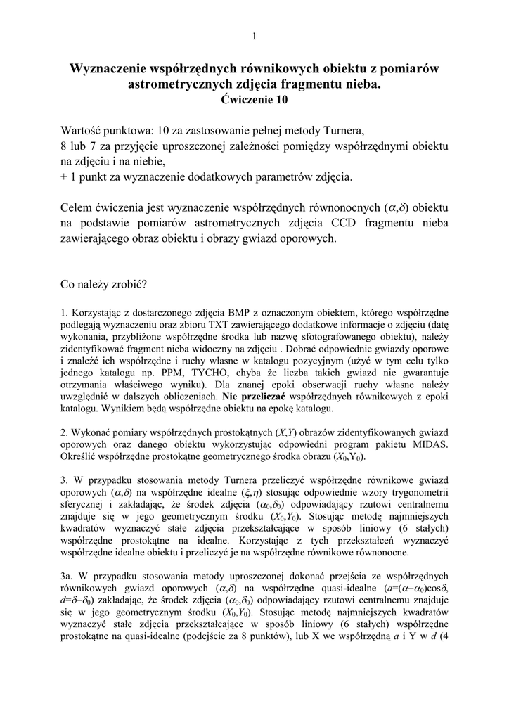 1 Wyznaczenie współrzędnych równikowych obiektu z pomiarów astrometrycznych zdjęcia fragmentu nieba. Ćwiczenie 10 Wartość punktowa: 10 za zastosowanie pełnej metody Turnera, 8 lub 7 za przyjęcie uproszczonej zaleŜności pomiędzy współrzędnymi obiektu na zdjęciu i na niebie, + 1 punkt za wyznaczenie dodatkowych parametrów zdjęcia. Celem ćwiczenia jest wyznaczenie współrzędnych równonocnych (α,δ) obiektu na podstawie pomiarów astrometrycznych zdjęcia CCD fragmentu nieba zawierającego obraz obiektu i obrazy gwiazd oporowych. Co naleŜy zrobić? 1. Korzystając z dostarczonego zdjęcia BMP z oznaczonym obiektem, którego współrzędne podlegają wyznaczeniu oraz zbioru TXT zawierającego dodatkowe informacje o zdjęciu (datę wykonania, przybliŜone współrzędne środka lub nazwę sfotografowanego obiektu), naleŜy zidentyfikować fragment nieba widoczny na zdjęciu . Dobrać odpowiednie gwiazdy oporowe i znaleźć ich współrzędne i ruchy własne w katalogu pozycyjnym (uŜyć w tym celu tylko jednego katalogu np. PPM, TYCHO, chyba Ŝe liczba takich gwiazd nie gwarantuje otrzymania właściwego wyniku). Dla znanej epoki obserwacji ruchy własne naleŜy uwzględnić w dalszych obliczeniach. Nie przeliczać współrzędnych równikowych z epoki katalogu. Wynikiem będą współrzędne obiektu na epokę katalogu. 2. Wykonać pomiary współrzędnych prostokątnych (X,Y) obrazów zidentyfikowanych gwiazd oporowych oraz danego obiektu wykorzystując odpowiedni program pakietu MIDAS. Określić współrzędne prostokątne geometrycznego środka obrazu (X0,Y0). 3. W przypadku stosowania metody Turnera przeliczyć współrzędne równikowe gwiazd oporowych (α,δ) na współrzędne idealne (ξ,η) stosując odpowiednie wzory trygonometrii sferycznej i zakładając, Ŝe środek zdjęcia (α0,δ0) odpowiadający rzutowi centralnemu znajduje się w jego geometrycznym środku (X0,Y0). Stosując metodę najmniejszych kwadratów wyznaczyć stałe zdjęcia przekształcające w sposób liniowy (6 stałych) współrzędne prostokątne na idealne. Korzystając z tych przekształceń wyznaczyć współrzędne idealne obiektu i przeliczyć je na współrzędne równikowe równonocne. 3a. W przypadku stosowania metody uproszczonej dokonać przejścia ze współrzędnych równikowych gwiazd oporowych (α,δ) na współrzędne quasi-idealne (a=(α−α0)cosδ, d=δ−δ0) zakładając, Ŝe środek zdjęcia (α0,δ0) odpowiadający rzutowi centralnemu znajduje się w jego geometrycznym środku (X0,Y0). Stosując metodę najmniejszych kwadratów wyznaczyć stałe zdjęcia przekształcające w sposób liniowy (6 stałych) współrzędne prostokątne na quasi-idealne (podejście za 8 punktów), lub X we współrzędną a i Y w d (4 2 stałe) (podejście za 7 punktów). Korzystając z tych przekształceń wyznaczyć współrzędne quasi-idealne obiektu i przeliczyć je na współrzędne równikowe równonocne. 4. Dokonać oszacowania błędu uzyskanego wyniku. W tym celu mając stałe kliszy dokonać przeliczenia współrzędnych prostokątnych (X,Y) dla kolejnych gwiazd oporowych na współrzędne idealne lub quasi-idealne (w zaleŜności od uŜytego podejścia) i ostatecznie na współrzędne równikowe (α`,δ `) (nieco inne niŜ współrzędne katalogowe). Znaleźć róŜnice pomiędzy wyznaczonymi a katalogowymi współrzędnymi gwiazd (osobno dla rektascensji i deklinacji). Obliczyć średniokwadratowe odchyłki w α i δ zwane teŜ błędami odtworzenia. 5. Dodatkowo (za 1 punkt) moŜna znając stałe zdjęcia, wyznaczyć skalę obrazu, kąt jego obrotu względem współrzędnych równikowych oraz kąt nieprostopadłości osi X,Y. 6. Dodatkowo dla ambitnych (ale juŜ gratis) moŜna zbadać zaleŜność uzyskanego wyniku od przyjętego połoŜenia środka zdjęcia.