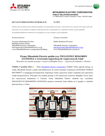 MITSUBISHI ELECTRIC CORPORATION PUBLIC RELATIONS DIVISION 7-3, Marunouchi 2-chome, Chiyoda-ku, Tokyo, 100-8310 Japan DO NATYCHMIASTOWEJ PUBLIKACJI Nr 3073 Niniejszy tekst jest tłumaczeniem oficjalnej angielskiej wersji komunikatu prasowego i został zamieszczony wyłącznie dla wygody i jako tekst pomocniczy. W celu uzyskania szczegółowych informacji prosimy o zaznajomienie się z oryginalnym tekstem w języku angielskim. W przypadku jakichkolwiek rozbieżności rozstrzygająca jest wersja oryginału w języku angielskim. Pytania klientów Pytania od mediów Overseas Marketing Division Building System Group Mitsubishi Electric Corporation [email protected] www.MitsubishiElectric.com/products/building Public Relations Division Mitsubishi Electric Corporation [email protected] www.MitsubishiElectric.com/news Firma Mitsubishi Electric pobiła trzy ŚWIATOWE REKORDY GUINESSA w tworzeniu najszybszych i najwyższych wind Wszystkie trzy modele pracują w wieżowcu Shanghai Tower — najwyższym budynku w Chinach TOKIO, 9 grudnia 2016 r. — firma Mitsubishi Electric Corporation (TOKIO: 6503) ogłosiła dzisiaj, że windy Mitsubishi Electric zostały zakwalifikowane do trzech rekordów Guinnessa (GUINNESS WORLD RECORDS®) w następujących kategoriach: Najszybsza winda, najwyższa winda w budynku oraz najszybsza winda dwupoziomowa. Wszystkie trzy modele pracują w 632-metrowym wieżowcu Shanghai Tower, który jest najwyższym budynkiem w Chinach. Firma Mitsubishi Electric odebrała trzy certyfikaty ŚWIATOWYCH REKORDÓW GUINNESSA podczas ceremonii, która odbyła się 8 grudnia w siedzibie głównej firmy, w Tokio. Ceremonia wręczenia certyfikatów 1/3 Windy Mitsubishi Electric uzyskały następujące certyfikaty rekordów przyznane przez Guinness World Records Ltd.: - Najszybsza winda: winda poruszająca się z prędkością 1230 metrów w minutę (73,8 kilometrów na godzinę); dociera bezpośrednio z drugiej kondygnacji podziemnej na taras widokowy znajdujący się na 119. piętrze już w około 53 sekundy. - Najwyższa winda — w budynku: dwie windy ewakuacyjne pokonujące wysokość 578,55 metra między trzecią kondygnacją podziemną a 121. piętrem. - Najszybsza winda dwupoziomowa: osiem wind poruszających się z prędkością 600 metrów na minutę (36,0 kilometrów na godzinę), bezpośrednio między parterem a hotelową restauracją na 101. piętrze. Windy dostarczone przez Mitsubishi Electric do wieżowca Shanghai Tower (rekordy wyróżniono pogrubioną czcionką) Budynek Właściciel Windy Producenci Instalator Shanghai Tower (Shanghai Zhongxin Dasha) Shanghai Tower Construction and Development Co., Ltd. Łącznie 114 wind: - 3 wahadłowe windy o ultrawysokiej prędkości, docierające na taras widokowy, w tym 1 poruszająca się do góry z prędkością 1230 m/min (prędkość jest regulowana w zależności od natężenia ruchu) i 2 o prędkości 1080 m/min - 64 windy o średniej i wysokiej prędkości, od 150 do 480 m/min, w tym 2 windy ewakuacyjne pokonujące łączną wysokość 578,55 m - 20 wind dwupoziomowych, w tym 8 poruszających się z prędkością 600 m/min - 27 wind o niskiej prędkości poruszających się z prędkością do 105 m/min Inazawa Works, Mitsubishi Electric Corporation Shanghai Mitsubishi Elevator Co., Ltd. Mitsubishi Electric Shanghai Electric Elevator Co., Ltd. Shanghai Mitsubishi Elevator Co., Ltd. Shanghai Tower to 632-metrowy wieżowiec położony w centrum finansowo-handlowym Lujiazui w dzielnicy Pudong, w Szanghaju. Mieści on biura, hotel, sklepy, sale konferencyjne i wystawowe, obiekty kulturalne i turystyczne oraz restauracje. Firma Mitsubishi Electric była pierwszą japońską firmą, która zaczęła dostarczać windy na rynek chiński. Miało to miejsce w 1950 roku. We współpracy z Shanghai Electric (Group) Corp. założyła w 1987 roku firmę Shanghai Mitsubishi Elevator Co., Ltd. (SMEC) i została pierwszą japońską firmą produkującą, sprzedającą, instalującą i konserwującą windy oraz schody ruchome w Chinach. W 2002 roku założono firmę Mitsubishi Electric Shanghai Electric Elevator Co., Ltd. (MESE). Obecnie firma SMEC dostarcza na rynek chiński produkty ze średniego przedziału cenowego, a MESE najnowocześniejsze windy serii MAXIEZ. Plany Mitsubishi Electric zakładają dalsze poszerzanie działalności w Chinach — największym rynku na świecie — poprzez zacieśnienie współpracy z firmami SMEC i MESE. 2/3 ### Informacje o firmie Mitsubishi Electric Corporation Mając za sobą ponad 90 lat doświadczenia w dostarczaniu niezawodnych, wysokiej jakości produktów, firma Mitsubishi Electric Corporation (TOKIO: 6503) znana jest jako światowy lider w produkcji, marketingu i sprzedaży sprzętu elektrycznego i elektronicznego wykorzystywanego do przetwarzania informacji, komunikacji, rozwiązań w branży kosmicznej i komunikacji satelitarnej, elektroniki użytkowej, technologii przemysłowych, energetyki oraz sprzętu transportowego i budowlanego. W myśl motto naszej firmy „Changes for the Better” — czyli zmiany na lepsze — oraz polityki Eco Changes firma Mitsubishi Electric podjęła wyzwanie, aby zostać wiodącą firmą na świecie w dziedzinie ochrony środowiska, wzbogacając społeczeństwo o nowe technologie. Roczne łączne przychody firmy ze sprzedaży za rok fiskalny zakończony 31 marca 2016 r. wynoszą 4.394,3 miliarda jenów (38,8 miliarda USD*). Więcej informacji można znaleźć pod adresem: www.MitsubishiElectric.com *Kurs wymiany walut: 113 jenów za dolara amerykańskiego, kurs według Tokyo Foreign Exchange Market na dzień 31 marca 2016 r. 3/3