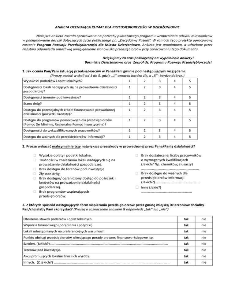 ANKIETA OCENIAJĄCA KLIMAT DLA PRZEDSIĘBIORCZOŚCI W DZIERŻONIOWIE Niniejsza ankieta została opracowana na potrzeby pilotażowego programu wzmacniania udziału mieszkańców w podejmowaniu decyzji dotyczących życia publicznego pn. „Decydujmy Razem”. W ramach tego projektu opracowany zostanie Program Rozwoju Przedsiębiorczości dla Miasta Dzierżoniowa. Ankieta jest anonimowa, a udzielone przez Państwa odpowiedzi umożliwią uwzględnienie stanowiska przedsiębiorców przy opracowaniu tego dokumentu. Dziękujemy za czas poświęcony na wypełnienie ankiety! Burmistrz Dzierżoniowa oraz Zespół ds. Programu Rozwoju Przedsiębiorczości 1. Jak ocenia Pan/Pani sytuację przedsiębiorców w Pana/Pani gminie pod następującymi względami: (Proszę ocenić w skali od 1 do 5, gdzie „1” oznacza bardzo źle, a „5”- bardzo dobrze.) Wysokości podatków i opłat lokalnych? 1 2 3 4 5 Dostępności lokali nadających się na prowadzenie działalności gospodarczej? 1 2 3 4 5 Dostępności terenów pod inwestycje? 1 2 3 4 5 Stanu dróg? 1 2 3 4 5 Dostępu do potencjalnych źródeł finansowania prowadzonej działalności (pożyczki, kredyty)? 1 2 3 4 5 Dostępu do programów pomocowych dla przedsiębiorców (Pomoc De Minimis, Regionalna Pomoc Inwestycyjna)? 1 2 3 4 5 Dostępności do wykwalifikowanych pracowników? 1 2 3 4 5 Dostępu do ważnych dla przedsiębiorców informacji? 1 2 3 4 5 2. Proszę wskazać maksymalnie trzy największe przeszkody w prowadzonej przez Pana/Panią działalności? Wysokie opłaty i podatki lokalne. Trudności w znalezieniu lokali nadających się na prowadzenie działalności gospodarczej. Brak dostępu do terenów pod inwestycje. Zły stan dróg. Brak dostępu/ ograniczony dostęp do pożyczek i kredytów na prowadzenie działalności gospodarczej. Brak programów wspierających przedsiębiorców. Brak dostatecznej liczby pracowników o wymaganych kwalifikacjach (Jakich? Np. chemików, ślusarzy) ………………………………………………......... Brak dostępu do ważnych dla przedsiębiorców informacji (Jakich?)............................................. Inne (Jakie?) ................................................... 3. Z których spośród następujących form wspierania przedsiębiorców przez gminę miejską Dzierżoniów chciałby Pan/chciałaby Pani skorzystać? (Proszę o zaznaczenie znakiem X odpowiedź „tak” lub „nie”) Obniżenia stawek podatków i opłat lokalnych. tak nie Wsparcia finansowego (poręczenia i pożyczki). tak nie Lokali udostępnianych na preferencyjnych warunkach. tak nie Punktu obsługi przedsiębiorców, oferującego porady prawne, finansowo-księgowe itp. tak nie Szkoleń. (Jakich?)............................................................................................................................. tak nie Terenów pod inwestycje. tak nie Akcji promujących lokalne firm i ich wyroby. tak nie Innych. (Z jakich?) .................................................................................................................... tak nie 4. Czy planuje Pan/ Pani przeniesienie swojej działalności (w części lub w całości) poza teren miasta Dzierżoniowa? Tak Nie Jeżeli TAK, to co skłania Pana/Panią do zmiany lokalizacji firmy? (Proszę podać maksymalnie trzy powody): 1........................................................................................................................................................................... 2........................................................................................................................................................................ 3......................................................................................................................................................................... 5. Które z poniższych instytucji, działań i programów wspierających przedsiębiorczość są Panu/Pani znane i z których Pan/Pani korzystał lub właśnie korzysta? Proszę o postawienie znaku „x” w odpowiednich wierszach tabeli. Instytucje, działania, programy: Znam: Korzystam/Korzystałem(łam): Fundusz Poręczeń Kredytowych Powiatu Dzierżoniowskiego Inkubator przedsiębiorczości Dzierżoniowskie Centrum Biznesu Punkt Informacji Funduszy Europejskich Gminne Centrum Informacji Powiatowy Urząd Pracy Społeczna Rada Przedsiębiorców Ulgi w podatku od nieruchomości (Pomoc de Minimis/ Regionalna Pomoc Inwestycyjna) Inne (jakie?)................................... 6. Czy polecił(a)by Pan/Pani Dzierżoniów jako dobre miejsce do prowadzenia własnej firmy? tak, dlaczego?................................................................................................................................................ …. nie, dlaczego?................................................................................................................................................ 7. Jakiego rodzaju działalność prowadzi Pana/Pani firma? Proszę opisać główne produkty i/lub usługi? ……………………………………………………………………………………………………………………………………………………………………………………… …………………………………………………………………………………………………………………………………………………………………………………….... 8. Ilu pracowników zatrudnia firma? (proszę zaznaczyć właściwe) 1-9 50 - 249 10 - 49 250 i więcej 9. Jak długo Pana/Pani firma istnieje na rynku? Do 12 m-cy 1-5 lat 6-10 lat 10. Forma organizacyjno-prawna: spółka prawa handlowego, spółka prawa cywilnego, spółdzielnia, 11-15 lat Powyżej 15 lat działalność gospodarcza prowadzona przez osobę fizyczną, inna. (Jaka? Np. fundacje, stowarzyszenia.) ………………………………………………………………. 11. Jak ocenia Pan/Pani działania sam