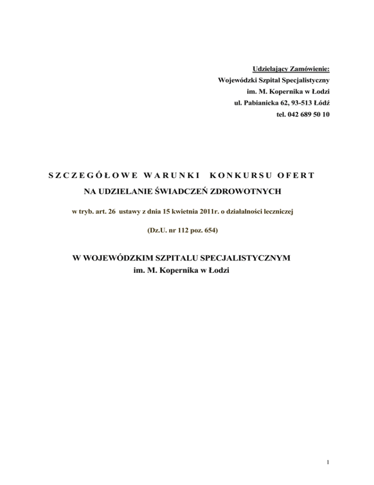 Udzielający Zamówienie: Wojewódzki Szpital Specjalistyczny im. M. Kopernika w Łodzi ul. Pabianicka 62, 93-513 Łódź tel. 042 689 50 10 SZCZEGÓŁOWE WARUNKI KONKURSU OFERT NA UDZIELANIE ŚWIADCZEŃ ZDROWOTNYCH w tryb. art. 26 ustawy z dnia 15 kwietnia 2011r. o działalności leczniczej (Dz.U. nr 112 poz. 654) W WOJEWÓDZKIM SZPITALU SPECJALISTYCZNYM im. M. Kopernika w Łodzi Zatwierdził : ................................................. Dokument wraz z załącznikami zawiera ogółem ………….. kolejno ponumerowanych stron 1 Ogłoszenie o konkursie zamieszczono: - na tablicy ogłoszeń w siedzibie Szpitala, - na stronie internetowej Szpitala INFORMACJA OGÓLNA §1 Szczegółowe warunki konkursu ofert określają wymagania, jakie powinna spełniać oferta, sposób jej przygotowania oraz tryb składania ofert przez Oferentów, a także zasady przeprowadzenia konkursu. Organizatorem konkursu ofert jest §2 Wojewódzki Szpital Specjalistyczny im. M. Kopernika w Łodzi z siedzibą przy ul. Pabianickiej 62, zwany dalej Udzielającym Zamówienia. §3 I. Przedmiot konkursu 1. Przedmiotem konkursu ofert jest wykonywanie angiografii okulistycznej, usg oka oraz tomografia komputerowa oka OCT. 2. Świadczenia o których mowa w pkt 1 wykonywane będą zgodnie z wymaganiami określonymi w zarządzeniu Nr 81/2011/DSOZ Prezesa Narodowego Funduszu Zdrowia z dnia 4 listopada 2011 r. 3. Udzielający zamówienia określa szacunkową liczbę osób ubezpieczonych i innych osób uprawnionych do opieki zdrowotnej z danego terenu na 180 000 osób. 2 II. Warunki jakie muszą spełniać Oferenci 1. Warunkiem przystąpienia do konkursu jest: a) spełnienie wymagań określonych w Zarządzeniu Nr 81/2011/DSOZ Prezesa Narodowego Funduszu Zdrowia z dnia 4 listopada 2011 r. b) złożenie Udzielającemu zamówienia oferty w formie pisemnej. 2. Określenie stałości cen w okresie obowiązywania umowy. 3. Wyznaczenie terminu płatności nie krótszego niż 30 dni od daty otrzymania przez zamawiającego faktury za wykonane badania. 4. Oferty zgłoszone do konkursu powinny być sporządzone wg załączonych wzorów zawartych w formularzu ofertowym, stanowiącym załącznik do niniejszych „Szczegółowych warunków konkursu”. 5. Dopuszcza się składanie ofert częściowych na wybrany zakres świadczeń. Konkurs będzie ważny jeśli wpłynie przynajmniej jedna oferta, która spełnia wymagania udziału w konkursie. III. Umowa zostanie zawarta: na okres 35 miesięcy od dnia 1 lutego 2012r. IV. Przyjmujący zamówienie udziela świadczeń zdrowotnych osobom ubezpieczonym bezpłatnie i innym osobom uprawnionym do świadczeń w publicznych zakładach opieki zdrowotnej z obszaru działania udzielającego zamówienie. §4 Miejsce udzielania świadczeń zdrowotnych Wojewódzki Szpital Specjalistyczny im. M. Kopernika Łodzi. PRZYJMUJĄCY ZAMÓWIENIE (OFERENT) §5 1. Do konkursu mogą przystąpić podmioty wykonujące działalność leczniczą, lub osoby legitymujące się nabyciem fachowych kwalifikacji do udzielania świadczeń zdrowotnych w określonym zakresie lub określonej dziedzinie medycyny, zwanym dalej "przyjmującym 3 zamówienie". 2. Zakres wymagań został określony w szczegółowych warunkach konkursu ofert. §6 1. Oferent w celu prawidłowego przygotowania i złożenia oferty powinien zapoznać się ze wszystkimi informacjami zawartymi w szczegółowych warunkach konkursu ofert. 2. Warunkiem przystąpienia do konkursu ofert jest złożenie Udzielającemu Zamówienia oferty oraz innych dokumentów, zgodnie z wymogami ustalonymi przez Udzielającego Zamówienie. Oferent składa w jednej kopercie ofertę na wybrany lub wybrane rodzaje świadczeń zdrowotnych oraz inne wymagane dokumenty. 3. Oferent ponosi wszelkie koszty związane z przygotowaniem i złożeniem oferty. WYMAGANE WARUNKI FORMALNE SKŁADANIA OFERTY §7 1. Ofertę należy złożyć w terminie do 20 stycznia 2012r. do godz. 12.00 w Kancelarii Szpitala w siedzibie Udzielającego Zamówienia przy ul. Pabianickiej 62 w Łodzi 2. Składana oferta powinna zawierać formularz ofertowy zgodnie z załącznikiem nr 1/1a w zamkniętej kopercie. 3. Do oferty należy dołączyć następujące dokumenty: a) oświadczenie oferenta o zapoznaniu się z treścią ogłoszenia o konkursie i z treścią szczegółowych warunków konkursu oraz oświadczenie oferenta, że zapoznał się z istotnymi postanowieniami umowy i wyraża zgodę na zawarcie umowy zgodnie z tymi warunkami w przypadku wybrania jego oferty, b) kopię dokumentu wydanego przez właściwy organ stwierdzający wpis do właściwego rejestru, c) oświadczenie, że Sprzęt używany do wykonania badań jest ZGODNY z wymaganiami określonymi w Zarządzeniu Nr 81/2011/DSOZ Prezesa Narodowego Funduszu Zdrowia z dania 4 listopada 2011 r. 4 d) oświadczenie, że Kwalifikacje zawodowe personelu ZGODNE z wymaganiami określonymi w Zarządzenia Nr 81/2011/DSOZ Prezesa Narodowego Funduszu Zdrowia z dania 4 listopada 2011 r. Kopie muszą zostać poświadczone „za zgodność z oryginałem" przez Oferenta lub przez notariusza. d) wpis do Ewidencji Działalności Gospodarczej lub odpis wpisu do KRS, NIP, REGON. e) pełnomocnictwo w przypadku, gdy oferta jest sporządzana przez pełnomocnika, f) zobowiązanie do przedstawienia kopii umowy ubezpieczenia (najpóźniej w dniu podpisania umowy) od odpowiedzialności cywilnej za szkody wyrządzone przy udzielaniu oferowanego świadczenia medycznego poświadczoną „za zgodność z oryginałem" przez Oferenta lub przez notariusza. OPIS SPOSOBU PRZYGOTOWANIA OFERTY §8 1. Oferent przystępujący do konkursu zobowiązany jest złożyć Udzielającemu Zamówienie ofertę w formie pisemnej (pod rygorem nieważności) na formularzu ofertowym stanowiącym załącznik nr 1 do szczegółowych warunków konkursu ofert. Oferent wypełnia ofertę tylko na wybrane przez siebie rodzaje świadczeń. 2. Oferta powinna być czytelna, sporządzona w języku polskim, napisana na ma