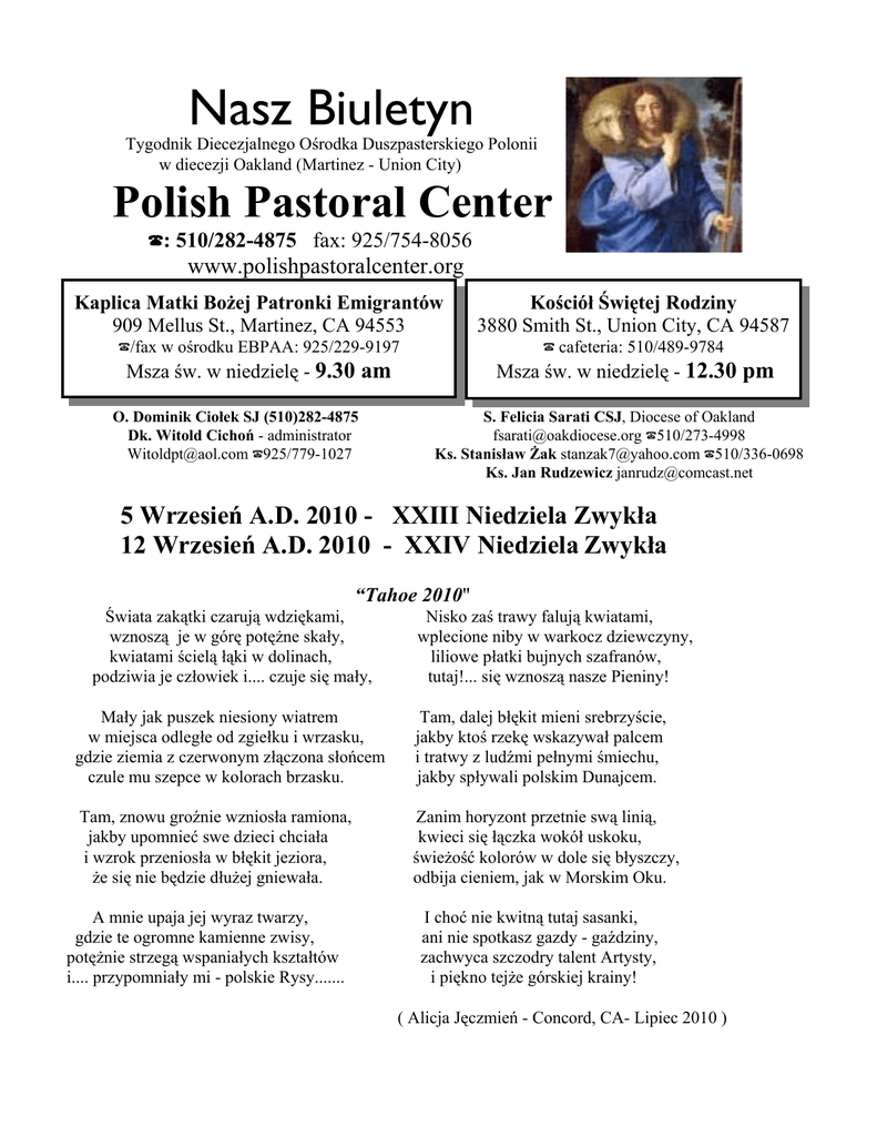Nasz Biuletyn Tygodnik Diecezjalnego Ośrodka Duszpasterskiego Polonii w diecezji Oakland (Martinez - Union City) Polish Pastoral Center ?: 510/282-4875 fax: 925/754-8056 www.polishpastoralcenter.org Kaplica Matki Bożej Patronki Emigrantów 909 Mellus St., Martinez, CA 94553 Kościół Świętej Rodziny 3880 Smith St., Union City, CA 94587 ?/fax w ośrodku EBPAA: 925/229-9197 ? cafeteria: 510/489-9784 Msza św. w niedzielę - 9.30 am Msza św. w niedzielę - 12.30 pm O. Dominik Ciołek SJ (510)282-4875 Dk. Witold Cichoń - administrator [email protected] ?925/779-1027 S. Felicia Sarati CSJ, Diocese of Oakland [email protected] ?510/273-4998 Ks. Stanisław Żak [email protected] ?510/336-0698 Ks. Jan Rudzewicz [email protected] 5 Wrzesień A.D. 2010 - XXIII Niedziela Zwykła 12 Wrzesień A.D. 2010 - XXIV Niedziela Zwykła “Tahoe 2010" Świata zakątki czarują wdziękami, wznoszą je w górę potężne skały, kwiatami ścielą łąki w dolinach, podziwia je człowiek i.... czuje się mały, Nisko zaś trawy falują kwiatami, wplecione niby w warkocz dziewczyny, liliowe płatki bujnych szafranów, tutaj!... się wznoszą nasze Pieniny! Mały jak puszek niesiony wiatrem w miejsca odległe od zgiełku i wrzasku, gdzie ziemia z czerwonym złączona słońcem czule mu szepce w kolorach brzasku. Tam, dalej błękit mieni srebrzyście, jakby ktoś rzekę wskazywał palcem i tratwy z ludźmi pełnymi śmiechu, jakby spływali polskim Dunajcem. Tam, znowu groźnie wzniosła ramiona, jakby upomnieć swe dzieci chciała i wzrok przeniosła w błękit jeziora, że się nie będzie dłużej gniewała. Zanim horyzont przetnie swą linią, kwieci się łączka wokół uskoku, świeżość kolorów w dole się błyszczy, odbija cieniem, jak w Morskim Oku. A mnie upaja jej wyraz twarzy, gdzie te ogromne kamienne zwisy, potężnie strzegą wspaniałych kształtów i.... przypomniały mi - polskie Rysy....... I choć nie kwitną tutaj sasanki, ani nie spotkasz gazdy - gaździny, zachwyca szczodry talent Artysty, i piękno tejże górskiej krainy! ( Alicja Jęczmień - Concord, CA- Lipiec 2010 ) Jak już informowałem naszą wspólnotę w ubiegłą niedzielę, otrzymaliśmy listy od Ks. Biskupa Salvatore Cordileone, w których informuje nas o decyzjach powziętych, dotyczących Polish Pastoral Center tak w Martinez jak i rownież w Union City. Z rozporządzeń wynika, iż od 1 Września 2010 r. wszystkie Sakramenty Święte będą udzielane przez regularne parafie naszej Diecezji. Również przygotowanie do Sakramentów Świętych będzie się odbywać w parafiach amerykańskich. Jeśli chodzi o dzieci pierwszo-komunijne i tą młodzież przygotowującą się do bierzmowania, mają oni uczęszczać na zajęcia katechetyczne CCD przy parafiach, na których terenie rodzice zamieszkują. Nauki dla rodziców chrzestnych, przygotowanie do małżeństwa oraz wypełnienie całej dokumentacji przedślubnej wg przepisów i opłat diecezjalnych, w parafiach tutejszej Diecezji. Nauki pobierane przez nasze dzieci w Szkołach języka polskiego i przygotowanie ich w naszym języku, jest zauważone i docenione przez Ks. Biskupa, jednakże przygotowanie ich do Sakramentów w języku angielskim jest od chwili obecnej obowiązkowe. Nadto, Ks. Biskup zarządza zakończenie działalności duszpasterskiej w Kościele Św. Rodziny z dniem 30 Grudnia 2010, ze względu na krytyczny stan budynków, zagrażający podstawowemu bezpieczeństwu wspólnoty. Dodatkowo, list informuje, że powaga sytuacji finansowej naszej Diecezji przekreśla możliwości napraw, czy też innych inwestycji. Z http://PolishPastoralCenter.org/sacraments Z Nauka religii i przygotowanie do I Komunii św. - w ramach zajęć regularnej parafii ( CCD ) Przygotowanie do bierzmowania - w ramach zajęć regularnej parafii( CCD ) Odwiedziny chorych - po uprzednim uzgodnieniu telefonicznym, a w sprawach nagłych w każdym czasie. Sakrament pojednania - przed lub po Mszy św. Chrzest - zgłosić miesiąc wcześniej w parafii regularnej. Małżeństwo - zgłosić co najmniej 6 miesięcy przed planowanym terminem w parafii regularnej tej Diecezji. Z Sponsorzy “Naszego Biuletynu” Z Ogłoszenia różne: Praca - Kupno - Sprzedaż - Usługi - Rozrywka Z . Pragnę podzielić się z Wami wspaniałą informacją. Otóż Ks. Bogdan Leśniak, SJ został powołany przez Generała Zakonu Jezuitów do Rzymu na pozycję Sekretarza Asystencji Słowiańskiej. Księdzu Bogdanowi gratulujemy takiego stanowiska, życzymy wiele Błogosławieństwa Bożego na następne lata pracy i zapewniamy go o naszej pamięci modlitewnej. . " Toczka “- tegoroczny zbiór sztuki : poetów, grafików, malarzy i fotografów ukaże się wkrótce. Całkowity dochód jak zwykle przeznaczony na pomoc polskim harcerzom w Kazachstanie. Prosimy o wsparcie tego pięknego przedsięwzięcia. . 11 września Katolicka Szkoła Języka Polskiego w Union City rozpoczyna nowy rok szkolny o godz. 9:00 am. i zaprasza rodziców z dziećmi już od 5-tego roku życia. Odnośnie zapisów i innych informacji prosimy o kontakt z p. Grażyna Koralewski (408) 866-6864 . 11 września Katolicka Szkoła Języka Polskiego im. Jana Pawła II w Walnut Creek, rozpoczyna nowy rok szkolny o godz. 9:00 am. . 12 września doroczny piknik jesienny “Pożegnanie lata” wraz z Mszą Św. polową ogodz 10:00 am tradycyjnie w Cowell Park w Concord. Tegoroczny dochód przeznaczony na podreperowanie budżetu EBPAA w związku z kosztami remontu, przebudowy i modernizacji siedziby organizacji i Kaplicy. . 2 Października 2010 tj Sobota, obchodzimy uroczystości CHAUTAUQUA #16 od godz. 10:00 do 4:30 przy parafii Świętego Józefa Robotnika w Berkeley, 1640 Addison St ( at Jefferson). Msza Św. celebrowana przez Jego Excellencję Ks. Biskupa John’a S. Cummins, kaznodzieja: wikariusz generalny Rev. George Mockel. . Dom do wynajęcia w Bay Point. 3 sypialnie, 2 łazienki. Kontakt (925) 386-6279." . Pokój do wynajęcia w domu w Milpitas, um