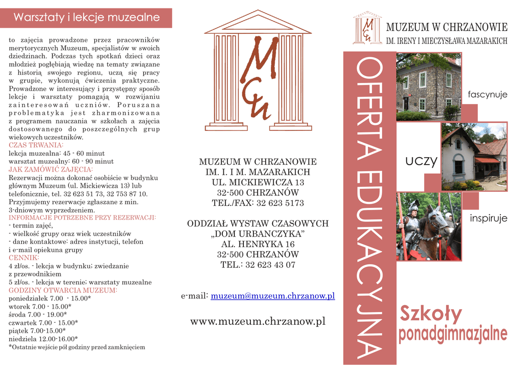 Warsztaty i lekcje muzealne INFORMACJE POTRZEBNE PRZY REZERWACJI: - termin zajęć, - wielkość grupy oraz wiek uczestników - dane kontaktowe: adres instytucji, telefon i e-mail opiekuna grupy CENNIK: 4 zł/os. - lekcja w budynku; zwiedzanie z przewodnikiem 5 zł/os. - lekcja w terenie; warsztaty muzealne GODZINY OTWARCIA MUZEUM: poniedziałek 7.00 - 15.00* wtorek 7.00 - 15.00* środa 7.00 - 19.00* czwartek 7.00 - 15.00* piątek 7.00-15.00* niedziela 12.00-16.00* *Ostatnie wejście pół godziny przed zamknięciem IM. IRENY I MIECZYSŁAWA MAZARAKICH MUZEUM W CHRZANOWIE IM. I. I M. MAZARAKICH UL. MICKIEWICZA 13 32-500 CHRZANÓW TEL./FAX: 32 623 5173 ODDZIAŁ WYSTAW CZASOWYCH „DOM URBANCZYKA” AL. HENRYKA 16 32-500 CHRZANÓW TEL.: 32 623 43 07 e-mail: [email protected] www.muzeum.chrzanow.pl OFERTA EDUKACYJNA to zajęcia prowadzone przez pracowników merytorycznych Muzeum, specjalistów w swoich dziedzinach. Podczas tych spotkań dzieci oraz młodzież pogłębiają wiedzę na tematy związane z historią swojego regionu, uczą się pracy w grupie, wykonują ćwiczenia praktyczne. Prowadzone w interesujący i przystępny sposób lekcje i warsztaty pomagają w rozwijaniu z a i n t e r e s o w a ń u c z n i ó w. P o r u s z a n a problematyka jest zharmonizowana z programem nauczania w szkołach a zajęcia dostosowanego do poszczególnych grup wiekowych uczestników. CZAS TRWANIA: lekcja muzealna: 45 - 60 minut warsztat muzealny: 60 - 90 minut JAK ZAMÓWIĆ ZAJĘCIA: Rezerwacji można dokonać osobiście w budynku głównym Muzeum (ul. Mickiewicza 13) lub telefonicznie, tel. 32 623 51 73, 32 753 87 10. Przyjmujemy rezerwacje zgłaszane z min. 3-dniowym wyprzedzeniem. MUZEUM W CHRZANOWIE fascynuje uczy inspiruje Szkoły ponadgimnazjalne warsztaty lekcje Wycinanka nie tylko żydowska. HISTORYCZNE Dawny Chrzanów i jego mieszkańcy wycieczki edukacyjne Udział mieszkańców ziemi chrzanowskiej w powstaniach narodowych Biżuteria patriotyczna Przyrodnicze ścieżki dydaktyczne w mieście i okolicy (czas zajęć: od 2 do 4 godzin) Zabytki Chrzanowa - spacer po naszym mieście Spacer po chrzanowskiej nekropolii Spacer po cmentarzu żydowskim Spacer po mieście śladami chrzanowskich Żydów Chrzanów i ziemia chrzanowska w czasie okupacji Chrzanów i ziemia chrzanowska na starej pocztówce W synagodze i w domu żydowskim Święta i obyczaje świąteczne u Żydów Narodziny, życie i śmierć w obyczajowości żydowskiej PRZYRODNICZE Geologia ziemi chrzanowskiej Ptaki i ssaki na przykładzie zbiorów muzealnych Świat owadów - motyle i chrząszcze Krótki spacer po królestwie grzybów Rozważania o ekologii INNE Co to jest muzeum? Tematy historyczne na zamówienie (opracowywane w nawiązaniu do programu nauczania zgodnie z zapotrzebowaniem) o muzeum Muzeum w Chrzanowie im. Ireny i Mieczysława Mazarakich to miejsce od ponad 50 lat wpisane w krajobraz kulturowy miasta. Głównym inicjatorem utworzenia w Chrzanowie instytucji muzealnej był prof. Mieczysław Mazaraki, rodowity chrzanowianin, nauczyciel i wychowawca młodzieży w Państwowym Gimnazjum i Liceum w Chrzanowie, zaangażowany w życie społeczne i ruch ochrony przyrody. Muzeum rozpoczęło działalność 21 lipca 1960 r. Od początku siedziba instytucji mieści się w najstarszym budynku w Chrzanowie, zabytkowym XVI w. lamusie dworskim, przebudowanym w XIX w. przez ostatnich właścicieli, Loewenfeldów. Tu obecnie zobaczyć można ekspozycje stałe, poświęcone historii, kulturze i przyrodzie ziemi chrzanowskiej. Muzeum w Chrzanowie posiada zbiory o znaczeniu ponadregionalnym, m.in: bogatą kolekcję judaiców, biżuterii żałobnej, naczyń i przedmiotów z cyny, szkła biedermeierowskiego oraz okazały zbiór guzów kontuszowych. Najcenniejszym obiektem jest XVI-wieczna rzeźba polichromowana o cechach późnogotyckich, prezentowana podczas kilku wystaw międzynarodowych na terenie Europy. W obszarze zainteresowań kolekcjonerskich Muzeum leżą dzieła artystów związanych z ziemią chrzanowską (Władysław Bakałowicz, Henryk Uziembło). Swoje miejsce w zbiorach muzealnych znalazła tzw. „kolekcja papieska” związana z osobą Ojca Świętego Jana Pawła II. Muzeum jest też swego rodzaju spadkobiercą spuścizny i opiekunem pamiątek związanych z niemal stuletnią historią pierwszej w Polsce fabryki lokomotyw FABLOK, działającej w Chrzanowie w latach 1919-2012. W 1985 r. Muzeum zyskało Oddział Wystaw Czasowych, mieszczący się w XIX-wiecznym budynku zlokalizowanym przy głównej alei miasta, znany jako „Dom Urbańczyka”. Dziś jest to miejsce ciekawych ekspozycji, cieszących się zainteresowaniem publiczności. Wystawom towarzyszą spotkania, wykłady i dyskusje.