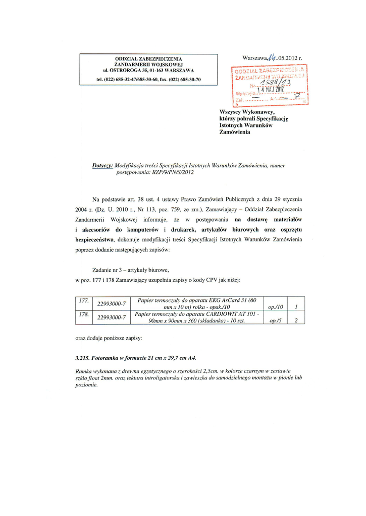 Zadanie nr 4 – niszczarki, laminatory Zamawiający dodaje następujące zapisy: 4.1. Urządzenie do niszczenia płyt CD – 1 sztuka. Specyfikacja (parametry minimalne): Szerokość wejścia: 225 mm; Wielkość ścinka: 3 x 10 mm; Ilość niszczonych kartek (A4/70g); 7, (A4/80g): 6; Poziom bezpieczeństwa DIN 4/Tajne/; Norma DIN 32757; Niszczy: zszywki, spinacze, karty plastikowe, płyty CD; Pojemność kosza 25 litrów; Oddzielny zespół tnący CD wraz z oddzielnym pojemnikiem – do separacji odpadów; Automatyczny start / stop wraz z funkcją cofania; Kontrolne diody LED ukazują stan urządzenia: gotowość do pracy, pełny kosz, zacięcie papieru, przegrzanie; Podgląd zapełnienia kosza przez okienko rewizyjne; Automatyczny stop w przypadku przepełnienia; Gwarancja: 2 lata na urządzenie. 4.2. Niszczarka dokumentów – V Stopień Tajności – 5 szt. Specyfikacja (parametry minimalne) dla V stopnia bezpieczeństwa – 5 szt. I. Wymagania dotyczące przeznaczenia Niszczarki dokumentów przeznaczone są dla jednostek organizacyjnych Żandarmerii Wojskowej celem niszczenia dokumentów. Wyposażenie jednostek organizacyjnych Żandarmerii Wojskowej związane jest z wypełnieniem zapisów normatywnych określonych w dokumentach a przede wszystkim: 1. Ustawy z dnia 5 sierpnia 2010r. o ochronie informacji niejawnych. (Dz. U. Nr 182, poz. 1228.); 2. zarządzenia nr 57/MON Ministra Obrony Narodowej z dnia 16.12.2011 r., w sprawie szczególnego sposobu organizacji i funkcjonowania kancelarii tajnych oraz innych niż kancelaria tajna komórek organizacyjnych odpowiedzialnych za przetwarzanie informacji niejawnych, sposobu i trybu przetwarzania informacji niejawnych oraz doboru i stosowania środków bezpieczeństwa fizycznego. II. Wymagania niezawodności. 1. Zdolność urządzenia do pracy bezpośrednio po włączeniu. 2. Niszczenie dokumentów przez pocięcie na paski ( o określonych wymiarach) jednorazowo w ilości do 7 arkuszy (80g/m²). 3. Niszczarka dokumentów powinna pracować niezawodnie bez przerwy jedna godzinę. 4. Niszczarki powinny pochodzić z produkcji nie wcześniej niż 2011r. i być fabrycznie nowe. III. Wymagania dotyczące eksploatacji, obsługi technicznej i napraw. 1. Niszczarki powinny posiadać min. 24 miesięczny okres gwarancji na całość urządzenia i 7 lat na noże tnące. 2. Producent powinien zapewnić naprawę gwarancyjną w miejscu wskazanym przez użytkownika na terenie RP w terminie 14 dni od daty zgłoszenia. 3. Producent przedstawi wraz z dokumentacją wykaz punktów serwisowych na terenie RP realizujących naprawy w okresie gwarancyjnym i pogwarancyjnym. 4. Dostarczenie niszczarek powinno zostać dokonane do Oddziału Zabezpieczenia ŻW w Warszawie ul. Ostroroga 35. IV. Wymagania dotyczące bezpieczeństwa. 1. Osoby pracujące na urządzeniu nie powinny mieć możliwości wciągnięcia górnych części ciała do części tnących. 2. Niszczarka powinna być zabezpieczona przed: - porażeniem użytkownika prądem elektrycznym, - przeciążeniem oraz posiadać funkcję stop w przypadku podania zbyt dużej ilości arkuszy. V. Wymagania konstrukcyjne. 1. Niszczarka powinna mieć parametry nie gorsze niż: - szerokość wlotu min. 300 mm - max. wymiary ścinania zgodne z klasą V wg normy DIN 32757; - pojemność pojemnika na ścinki min. 30 l - prędkość min. 0,1 m/s - posiadać funkcję stand-by - zasilanie 230V/50Hz - automatyczny start/stop – fotokomórka, funkcja cofania - wskaźniki świetlne zacięć i przepełnienia kosza - zapobieganie zakleszczeniu papieru poprzez identyfikację ilości jednorazowo niszczonych kartek - niszczarka powinna niszczyć dokumenty jak również zszywki, małe spinacze biurowe oraz dyskietki - niszczarka dostarczona powinna być gotowa do podłączenia, opakowana w karton. - niszczarka powinna być wyposażona w 10 worków na ścinki, butelkę oleju dla mechanizmu tnącego, instrukcję obsługi w języku polskim, kabel do podłączenia do sieci. 4.3. Niszczarka dokumentów – IV Stopień Tajności – 5 szt. Specyfikacja (parametry minimalne) dla IV stopnia bezpieczeństwa – 5 szt. I. Wymagania dotyczące przeznaczenia Niszczarki dokumentów przeznaczone są dla jednostek organizacyjnych Żandarmerii Wojskowej celem niszczenia dokumentów. Wyposażenie jednostek organizacyjnych Żandarmerii Wojskowej związane jest z wypełnieniem zapisów normatywnych określonych w dokumentach normatywnych, a przede wszystkim: a. ustawy z dnia 5 sierpnia 2010r. o ochronie informacji niejawnych. (Dz. U. Nr 182, poz. 1228.); b. zarządzenia nr 57/MON Ministra Obrony Narodowej z dnia 16.12.2011r. w sprawie szczególnego sposobu organizacji kancelarii tajnych oraz innych niż kancelaria tajna komórek organizacyjnych odpowiedzialnych za przetwarzanie informacji, sposobu i trybu przetwarzania informacji niejawnych, sposobu i trybu przetwarzania informacji niejawnych oraz doboru i stosowania środków bezpieczeństwa fizycznego. II. Wymagania niezawodności. 1. Zdolność urządzenia do pracy bezpośrednio po włączeniu. 2. Niszczenie dokumentów przez pocięcie na paski ( o określonych wymiarach) jednorazowo w ilości do 7 arkuszy (80g/m²). 3. Niszczarka dokumentów powinna pracować niezawodnie bez przerwy jedna godzinę. 4. Niszczarki powinny pochodzić z produkcji nie wcześniej niż 2011r. i być fabrycznie nowe. III.Wymagania dotyczące eksploatacji, obsługi technicznej i napraw. 1. Niszczarki powinny posiadać min. 24 miesięczny okres gwarancji na całość urządzenia i 7 lat na noże tnące. 2. Producent powinien zapewnić naprawę gwarancyjną w miejscu wskazanym przez użytkownika na terenie RP w terminie 14 dni od daty zgłoszenia. 3. Producent przedstawi wraz z dokumentacją wykaz punktów serwisowych na terenie RP realizujących naprawy w okresie gwarancyjnym i pogwarancyjnym. 4. Dostarczenie niszczarek powinno zostać dokonane do Oddziału Zabezpieczenia ŻW w Warszawie ul. Ostroroga 35. IV. Wymagania dotycząc