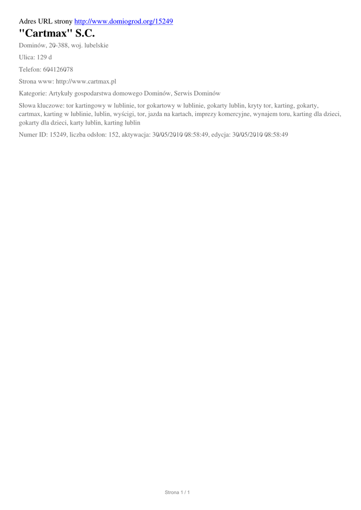 Adres URL strony http://www.domiogrod.org/15249 "Cartmax" S.C. Dominów, 20-388, woj. lubelskie Ulica: 129 d Telefon: 604126078 Strona www: http://www.cartmax.pl Kategorie: Artykuły gospodarstwa domowego Dominów, Serwis Dominów Słowa kluczowe: tor kartingowy w lublinie, tor gokartowy w lublinie, gokarty lublin, kryty tor, karting, gokarty, cartmax, karting w lublinie, lublin, wyścigi, tor, jazda na kartach, imprezy komercyjne, wynajem toru, karting dla dzieci, gokarty dla dzieci, karty lublin, karting lublin Numer ID: 15249, liczba odsłon: 152, aktywacja: 30/05/2010 08:58:49, edycja: 30/05/2010 08:58:49 Strona 1 / 1
