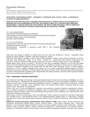 Kwartalnik Policyjny Źródło: http://kwartalnik.csp.edu.pl/kp/archiwum-1/2010/nr-42010/1244,WYPADEK-KOMUNIKACYJNY-DRAMAT-KTOREGO-NIE-LECZY-C ZAS-O-ZESPOLE-STRESU-POURAZOWEGO.html Wygenerowano: Czwartek, 2 marca 2017, 15:09 WYPADEK KOMUNIKACYJNY - DRAMAT, KTÓREGO NIE LECZY CZAS. O ZESPOLE STRESU POURAZOWEGO. Śledzenie danych KGP dotyczących wypadków komunikacyjnych w kolejnych latach może wskazywać na optymistyczny trend zmniejszania się ich liczby. Nie zmienia to faktu, że co roku ginie około 5000 osób – pozostawiając co najmniej drugie tyle swoich bliskich, dla których nagła informacja o śmierci najbliższych stanowi stresor traumatyczny, którego konsekwencją jest uraz psychiczny –TRAUMA. dr n. med. Agnieszka Popiel Szkoła Wyższa Psychologii Społecznej w Warszawie, Interdyscyplinarne Centrum Genetyki Zachowania Uniwersytetu Warszawskiego kierownik programu terapii stresu pourazowego psychiatra, psychoterapeuta dr n. hum. Ewa Pragłowska Interdyscyplinarne Centrum Genetyki Zachowania Uniwersytetu Warszawskiego specjalista psychologii klinicznej, psychoterapeuta i superwizor w programie terapii PTSD u ofiar wypadków komunikacyjnych zdj. Wojciech Pasieczny, WRD KSP 5000 osób, które zginęły w wypadku, to źródło traumy dla tych, którzy byli świadkami ich śmierci – policjantów, którzy przybyli na miejsce wypadku, strażaków, ratowników medycznych i lekarzy. 5000 osób, które zginęły w wypadku, to skutek około 50 000 wypadków, w których: ktoś prowadził samochód i w ostatnim momencie przed uderzeniem, myśląc, że „to koniec”, przeraził się – znieruchomiał albo wykonał niepotrzebny ruch kierownicą, a ktoś inny siedział na fotelu pasażera, przyszło mu na myśl, że z tego nie wyjdą, ale na nic nie miał wpływu. Według danych WHO corocznie na świecie 1 200 000 mln ludzi ginie w wypadkach drogowych, zaś 50 000 000 zostaje rannych. Szacunki Światowej Organizacji Zdrowia przewidują, że w najbliższych 20 latach te liczby wzrosną o około 65 proc. W Europie w wypadkach drogowych ginie rocznie około 127 000 osób, 2 400 000 zostaje rannych, a koszty wypadków szacuje się na 2 proc. produktu krajowego brutto. Ocenia się, że w krajach europejskich wypadki drogowe są szóstą z najczęstszych przyczyn inwalidztwa i trzynastą spośród najczęstszych przyczyn śmierci. Niektóre badania wykazują ponadto, że niemal u jednej piątej ofiar wypadków można zdiagnozować ostrą reakcję stresową, zaś jedna czwarta wykazuje problemy psychiczne w okresie roku od zdarzenia [1]. PTSD – ZABURZENIE STRESOWE POURAZOWE Opis zaburzenia stresowego pourazowego wymaga wprowadzenia pojęć: stresora traumatycznego oraz traumy, czyli urazu. Stresor traumatyczny – doświadczenie lub zagrożenie poważnym zranieniem, śmiercią lub zagrożenie integralności cielesnej własnej lub innych osób, na które człowiek był bezpośrednio narażony (co obejmuje uczestniczenie w wydarzeniu, ale także uzyskanie informacji o zagrożeniu życia, gwałtownej śmierci lub zranieniu bliskiej osoby) i przeżywał wówczas uczucie silnego strachu, bezradności lub przerażenia. Trauma, czyli uraz w sensie psychologicznym, obejmuje „stan psychiczny wywołany działaniem zagrażających zdrowiu i życiu czynników zewnętrznych, prowadzący do głębokich zmian w funkcjonowaniu człowieka” [2]. Rezultatem tego urazu mogą być utrwalone trudności w powrocie do poprzedniego funkcjonowania, czasem układające się w zespół objawów zwany zaburzeniem stresowym pourazowym. Często pojęcia: stresora traumatycznego, stresu traumatycznego i traumy używane są zamiennie na określenie zagrażającej życiu jednostki sytuacji i natychmiastowej reakcji na nią. Najpowszechniejsze rodzaje traumy to: uczestnictwo w wypadku komunikacyjnym, bycie ofiarą napadu, gwałtu, przemocy fizycznej, udział w działaniach militarnych, bycie świadkiem nagłej śmierci. Zaburzenie stresowe pourazowe (posttraumatic stress disorder, PTSD) można nazwać „stanem zawieszenia się” naturalnych mechanizmów radzenia sobie z traumą. Przeżycie traumy – urazu dotyczy większości osób – niemal 90% populacji. Z racji pełnionego zawodu szczególnie narażeni na traumę są jednak pracownicy służb ratunkowych – policjanci, strażacy, lekarze, ratownicy medyczni, technicy laboratoriów medycznych i kryminalistycznych. W pierwszych dniach i tygodniach od zadziałania stresora traumatycznego, mimo początkowej dolegliwości objawów, większość osób stopniowo wraca do dawnego funkcjonowania. W wypadku niektórych tak jednak się nie dzieje. U około 10% osób, które doznały urazu komunikacyjnego, a u 50% ofiar gwałtów i napaści, mimo upływu czasu intensywność dolegliwości nie maleje. Paradoksalnie zdarza się, że ten przewlekły stan odległego od normy funkcjonowania zaczyna być uważany za „nową normę” właśnie z powodu upływu czasu. Bliscy mówią często „to nie ten sam człowiek – zupełnie inny niż ten sprzed wypadku, ale trudno się dziwić, że tak się zmienił po takim przeżyciu”. Na czym ten stan polega? Zaburzenie stresowe pourazowe to zespół objawów, które występują łącznie i stanowią rodzaj błędnego koła. Jednym z głównych objawów są dręczące wspomnienia – jako obrazy z wypadku, które powracają znienacka, najczęściej wówczas, gdy człowiek próbuje zasnąć lub odpocząć, albo koszmarne sny o treści łączącej się z wypadkiem. Bywa, że nie są to koszmarne sny ani nawracające myśli, lecz przykre objawy fizyczne (np. bicie serca, zlanie potem, duszność czy silny dyskomfort), które pojawiają się nagle, gdy coś (dźwięk karetki, ten sam zapach, sygnał telefonu) przypomni o przeżytym wypadku. Te wspomnienia są wyrazem zmagania, jakie podejmuje mózg, aby przetworzyć – przetrawić i uporządkować doświadczenie traumatyczne. Nie jest to jednak łatwe, ponieważ przykra natura wspom