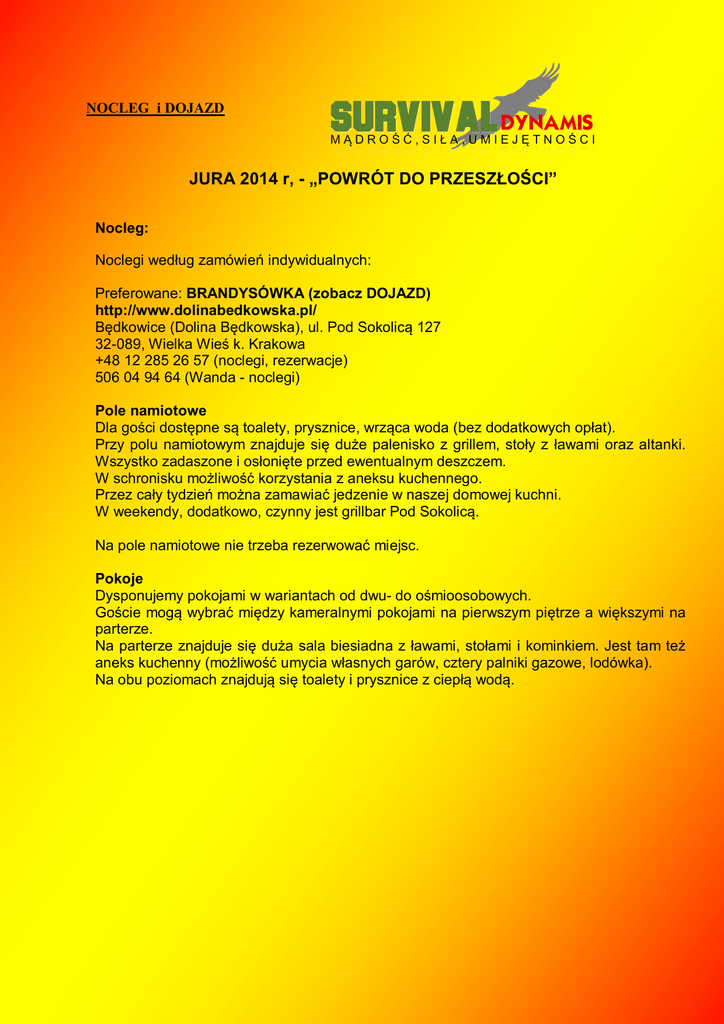 NOCLEG i DOJAZD JURA 2014 r, - „POWRÓT DO PRZESZŁOŚCI” Nocleg: Noclegi według zamówień indywidualnych: Preferowane: BRANDYSÓWKA (zobacz DOJAZD) http://www.dolinabedkowska.pl/ Będkowice (Dolina Będkowska), ul. Pod Sokolicą 127 32-089, Wielka Wieś k. Krakowa +48 12 285 26 57 (noclegi, rezerwacje) 506 04 94 64 (Wanda - noclegi) Pole namiotowe Dla gości dostępne są toalety, prysznice, wrząca woda (bez dodatkowych opłat). Przy polu namiotowym znajduje się duże palenisko z grillem, stoły z ławami oraz altanki. Wszystko zadaszone i osłonięte przed ewentualnym deszczem. W schronisku możliwość korzystania z aneksu kuchennego. Przez cały tydzień można zamawiać jedzenie w naszej domowej kuchni. W weekendy, dodatkowo, czynny jest grillbar Pod Sokolicą. Na pole namiotowe nie trzeba rezerwować miejsc. Pokoje Dysponujemy pokojami w wariantach od dwu- do ośmioosobowych. Goście mogą wybrać między kameralnymi pokojami na pierwszym piętrze a większymi na parterze. Na parterze znajduje się duża sala biesiadna z ławami, stołami i kominkiem. Jest tam też aneks kuchenny (możliwość umycia własnych garów, cztery palniki gazowe, lodówka). Na obu poziomach znajdują się toalety i prysznice z ciepłą wodą. Dojazd do Brandysówki Będkowice (Dolina Będkowska), ul. Pod Sokolicą 127 32-089, Wielka Wieś, ok. 20km od centrum Krakowa Koordynaty GPS: N 50°10'23.51" E 19°44'26.77" Samochodem (z Krakowa): 1. Droga na Zabierzów. Na rondzie Ofiar Katynia kierujemy się na Zabierzów (droga 7, 79). Po 4km zobaczymy estakadę, obok centrów handlowych, m.im. Leroy Merlin, którą pokonujemy prawym pasem (ok 300m, jest tam znak na Trzebinię). Na światłach za estakadą w prawo (ul. Kasztanowa). Po 400m pierwsza w lewo, kierujemy się na Brzezie. Prosto przez 8,5 km, aż zobaczymy znak na Dolinę Będkowską (miejscowść Brzezinka). Tam w prawo i jadąc Doliną po 4km dotrzemy do Brandysówki. Przejazd Doliną jest dozwolony dla mieszkańców i gości Brandysówki. 2. Droga na Olkusz. Na rondzie Ofiar Katynia kierunek na Olkusz (droga 94). Po 15km w lewo, na Bębło i Będkowice. Po ok. 5km mijamy drogowskaz informujący o zjeździe do Doliny Będkowskiej (jest to droga przez Czarcie wrota obecnie nieprzejezdna), jedziemy dalej prosto, przez centrum Będkowic, po 2,5km skręcamy w prawo (przy kolejnym znaku na Dolinę; koordynaty - 50° 9' 4.42", 19° 44' 48.82"), w wiodącą w dół asfaltową dróżkę. Po 500m dojedziemy do kapliczki, przy której znów w prawo. Stamtąd po 2,5km dojedziemy do Brandysówki. Autobusem – przy pętli w Bronowicach Nowych wsiadamy w autobus 210 i wysiadamy po ok. 30min na przystanku Będkowice-Borynia. Znak na Dolinę wskazuję drogę szutrową, w którą powinniśmy się udać. Na dole w lewo. Uwaga! Przy Brandysówce odbierają wszystkie sieci telefoniczne, ale w innych zakątkach Doliny może nie być zasięgu.