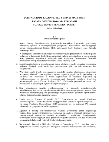 UCHWAŁA RADY KRAJOWEJ SLD Z DNIA 21 MAJA 2016 r. ZASADY GOSPODAROWANIA FINANSAMI SOJUSZU LEWICY DEMOKRATYCZNEJ (tekst jednolity) §1 Postanowienia ogólne 1. Sojusz Lewicy Demokratycznej gospodaruje majątkiem i prowadzi gospodarkę finansową zgodnie z obowiązującymi przepisami powszechnie obowiązującego prawa, postanowieniami Statutu SLD, uchwałami Rady Krajowej oraz Zarządu Krajowego SLD. 2. W szczególnie uzasadnionych przypadkach możliwe jest przekazanie z funduszy partii będących w dyspozycji Rady Krajowej dotacji radom wojewódzkim w celu wsparcia pracy partyjnej organizacji słabszych pod względem finansowym. Warunki przekazania dotacji każdorazowo określa Zarząd krajowy SLD. 3. Majątek partii stanowią nieruchomości, prawa użytkowe, środki pieniężne oraz rzeczy ruchome. Majątek partii może być przeznaczony tylko na cele statutowe lub charytatywne. 4. Wszystkie środki trwałe oraz rzeczowe składniki majątku obrotowego, stanowiące bezsporną własność poszczególnych ogniw organizacyjnych partii (pochodzące z zakupów lub darowizn), a także użytkowane na zasadach użyczenia są ewidencjonowane w księgach inwentarzowych (księgach środków trwałych), prowadzonych przez Zarząd Krajowy SLD. Ewidencja pomocnicza może być prowadzona w pozostałych ogniwach organizacyjnych. 5. Stan posiadanego majątku ewidencjonowany w księgach inwentarzowych, weryfikowany jest raz w ciągu każdego roku kalendarzowego spisem z natury. Spis inwentarza potwierdzający stan posiadanego majątku stanowi podstawę ujawnienia w bilansie Sojuszu Lewicy Demokratycznej. 6. Partia tworzy Fundusz Ekspercki SLD. Gromadzone w ramach Funduszu Eksperckiego SLD środki finansowe mogą pochodzić jedynie z wpłat własnych SLD. Na rzecz Funduszu Eksperckiego SLD przekazuje się co najmniej 5% rocznej subwencji otrzymywanej z budżetu państwa. 7. Zgodnie z zasadą samofinansowania wydatki ponoszone przez organizacje wojewódzkie mogą być finansowane wyłącznie ze środków własnych określonych w zatwierdzonych ramowych planach przychodów i wydatków. Podejmowanie zobowiązań wykraczających poza planowane wydatki możliwe jest pod warunkiem posiadania dodatkowych realnych źródeł ich finansowania. 8. Na wniosek Skarbnika SLD albo Sekretarza Generalnego SLD możliwe jest – wyłącznie na szczeblu krajowym – zaciąganie kredytów bankowych na cele statutowe, niezbędnych do sfinansowania wydatków, wykraczających poza przyjęty na dany rok plan finansowy. Decyzja w tej sprawie każdorazowo wymaga uchwały Zarządu Krajowego SLD. 9. Nabycie lub zbycie nieruchomości oraz nabycie lub zbycie obligacji Skarbu Państwa i bonów skarbowych Skarbu Pastwa wymaga uchwały Zarządu Krajowego SLD. 10. Środki finansowe będące w posiadaniu partii mogą być gromadzone jedynie na rachunkach bankowych. 11. Rachunki bankowe prowadzone są pod nazwą Sojusz Lewicy Demokratycznej z określeniem nazwy funduszu, którego dotyczą (Fundusz Statutowy, Fundusz Wyborczy, Fundusz Ekspercki). 12. Decyzje o utworzeniu rachunku bankowego oraz ustanowieniu pełnomocników uprawnionych do dysponowania rachunkiem, podejmują Sekretarz Generalny SLD i Skarbnik SLD. §2 Darowizny Darowizny pieniężne oraz niepieniężne mogą być przekazywane jedynie przez osoby fizyczne będące obywatelami polskimi, przy zachowaniu przepisów ustawy o partiach politycznych. §3 Składki członkowskie 1. Ustala się wpisowe w wysokości 10 złotych dla osób składających deklarację przynależności do SLD. Emeryci, renciści, uczniowie, studenci i bezrobotni wpłacają wpisowe w wysokości 5 złotych. 2. Opłata z tytułu wpisowego jest dochodem Rady Krajowej SLD. 3. Miesięczna składka członkowska wynosi 9 złotych. Emeryci, renciści, uczniowie, studenci i bezrobotni wpłacają comiesięczna składkę nie mniejszą niż 3 złoty. 4. Opłacanie wyższej od minimalnej kwoty składki określonej uchwałą Rady Krajowej SLD może nastąpić tylko na podstawie indywidualnej, dobrowolnej deklaracji członka SLD. 5. Członkowie kół SLD działających poza granicami Rzeczypospolitej Polskiej zwolnieni są z obowiązku opłacania składki członkowskiej. 6. Składka członkowska jest opłacana przez każdego członka w jego macierzystym kole. 7. Ewidencję i rozliczenie wpisowego oraz składek członkowskich prowadzi skarbnik koła w rejestrze składek członkowskich. Wzór rejestru określa Zarząd Krajowy SLD. 8. Zasady wykorzystania i podziału środków finansowych uzyskanych ze składek członkowskich określają w drodze uchwały zarządy powiatowe SLD. 2 §4 Składki specjalne 1. Członek SLD pełniący z jej poręczenia funkcje we władzach publicznych wszystkich szczebli, oprócz składki członkowskiej opłaca składkę specjalną. 2. Składka specjalna wynosi 7% przychodu z tytułu pełnionej funkcji brutto. 3. Składka specjalna płatna jest z dołu do 15 dnia każdego miesiąca. 4. Składki specjalne wnoszone przez parlamentarzystów europejskich i krajowych będących członkami SLD są dochodami Rady Krajowej SLD, a pozostałe składki specjalne opłacane przez członków SLD z tytułu pełnienia mandatu i funkcji we władzach publicznych wszystkich szczebli są dochodami organizacji wojewódzkich. Zasady gospodarowania i podziału funduszy pozyskanych z tych źródeł określają rady wojewódzkie SLD, w drodze uchwały. 5. Wysokość miesięcznej składki specjalnej dla członka SLD pełniącego mandat parlamentarzysty RP wynosi 700 złotych w przypadku parlamentarzysty zawodowego, 170 złotych w przypadku parlamentarzysty niezawodowego. 6. Wysokość miesięcznej składki specjalnej dla członka SLD pełniącego mandat parlamentarzysty RP, który pełni funkcję wiceprzewodniczącego komisji parlamentarnej wynosi 800 złotych. 7. Wysokość miesięcznej składki specjalnej dla członka SLD pełniącego mandat parlamentarzysty RP, który pełni funkcję przewodniczącego komisji parlamentarnej,