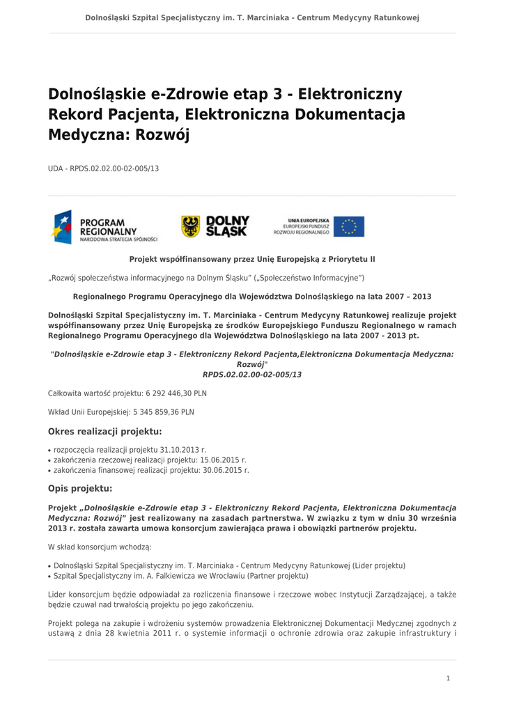 Dolnośląski Szpital Specjalistyczny im. T. Marciniaka - Centrum Medycyny Ratunkowej Dolnośląskie e-Zdrowie etap 3 - Elektroniczny Rekord Pacjenta, Elektroniczna Dokumentacja Medyczna: Rozwój UDA - RPDS.02.02.00-02-005/13 Projekt współfinansowany przez Unię Europejską z Priorytetu II „Rozwój społeczeństwa informacyjnego na Dolnym Śląsku” („Społeczeństwo Informacyjne”) Regionalnego Programu Operacyjnego dla Województwa Dolnośląskiego na lata 2007 – 2013 Dolnośląski Szpital Specjalistyczny im. T. Marciniaka - Centrum Medycyny Ratunkowej realizuje projekt współfinansowany przez Unię Europejską ze środków Europejskiego Funduszu Regionalnego w ramach Regionalnego Programu Operacyjnego dla Województwa Dolnośląskiego na lata 2007 - 2013 pt. "Dolnośląskie e-Zdrowie etap 3 - Elektroniczny Rekord Pacjenta,Elektroniczna Dokumentacja Medyczna: Rozwój" RPDS.02.02.00-02-005/13 Całkowita wartość projektu: 6 292 446,30 PLN Wkład Unii Europejskiej: 5 345 859,36 PLN Okres realizacji projektu: ● ● ● rozpoczęcia realizacji projektu 31.10.2013 r. zakończenia rzeczowej realizacji projektu: 15.06.2015 r. zakończenia finansowej realizacji projektu: 30.06.2015 r. Opis projektu: Projekt „Dolnośląskie e-Zdrowie etap 3 - Elektroniczny Rekord Pacjenta, Elektroniczna Dokumentacja Medyczna: Rozwój” jest realizowany na zasadach partnerstwa. W związku z tym w dniu 30 września 2013 r. została zawarta umowa konsorcjum zawierająca prawa i obowiązki partnerów projektu. W skład konsorcjum wchodzą: ● ● Dolnośląski Szpital Specjalistyczny im. T. Marciniaka - Centrum Medycyny Ratunkowej (Lider projektu) Szpital Specjalistyczny im. A. Falkiewicza we Wrocławiu (Partner projektu) Lider konsorcjum będzie odpowiadał za rozliczenia finansowe i rzeczowe wobec Instytucji Zarządzającej, a także będzie czuwał nad trwałością projektu po jego zakończeniu. Projekt polega na zakupie i wdrożeniu systemów prowadzenia Elektronicznej Dokumentacji Medycznej zgodnych z ustawą z dnia 28 kwietnia 2011 r. o systemie informacji o ochronie zdrowia oraz zakupie infrastruktury i 1 Dolnośląski Szpital Specjalistyczny im. T. Marciniaka - Centrum Medycyny Ratunkowej oprogramowania niezbędnych do prowadzenia dokumentacji medycznej w formie elektronicznej. Projekt zakłada również integracje z powstającą w ramach projektu pn. „Dolnośląskie e-Zdrowie etap 2 - Elektroniczna Dokumentacja Medyczna” regionalną platformą wymiany danych oraz stworzenie możliwości udostępniania informacji o zdarzeniach medycznych do platformy P1. W ramach projektu zaplanowano wdrożenie oprogramowania medycznego klasy HIS umożliwiającego prowadzenie EDM, zakup sprzętu serwerowego, oprogramowania systemowego i bazodanowego dla serwerów oraz stworzenie lokalnego repozytorium elektronicznej dokumentacji medycznej wraz z integracją z platformą regionalną. Projekt pn. „Dolnośląskie e-Zdrowie etap 3 - Elektroniczny Rekord Pacjenta, Elektroniczna Dokumentacja Medyczna: Rozwój” będzie oddziaływał przede wszystkim na społeczność województwa dolnośląskiego. Wśród korzyści należy wymienić: ● ● ● ● zmniejszenie kosztów funkcjonowania podmiotów leczniczych - realizowany projekt umożliwi sprawniejszą pracę personelu medycznego, a także zwiększy jego efektywność, co będzie miało wpływ na świadczone przez niego usługi. Świadczenie usług medycznych na wysokim poziomie, wymaga poza kompetentnym personelem oraz wykorzystaniem nowoczesnego sprzętu również dostępu do informacji dotyczących choroby pacjenta. wzrost jakości obsługi pacjenta - wdrożenie projektu umożliwi Szpitalom znaczną poprawę oferowanych dotychczas usług w zakresie opieki zdrowotnej, a także skróci czas na realizację poszczególnych czynności związanych z obsługą procesu leczniczego. Krótszy czas hospitalizacji będzie możliwy dzięki wczesnej diagnozie i podjęciu właściwego leczenia oraz umożliwi pacjentom szybszy powrót do aktywności zawodowej. poprawę dostępności do danych medycznych, dzięki czemu zmniejszą się koszty leczenia oraz nastąpi wzrost skuteczności leczenia poprzez bieżący, ciągły dostęp do dokumentacji medycznej pacjentów, możliwy dzięki świadczeniu opieki zdrowotnej z wykorzystaniem nowoczesnych technologii im. in. wdrożenia systemu EDM i lokalnego repozytorium oraz integracji z szyną integracyjną na poziomie regionalnym. uruchomienie dodatkowego repozytorium oraz szyfrowanie danych i kanałów transmisji, konieczność autoryzacji użytkowników i nadzorowany, selektywny dostęp do danych a także automatyczne zarządzanie retencją danych oraz przechowywanie wersji dokumentów znacznie wpłynie na wzrost bezpieczeństwa informacji. Korzyści wynikające z realizacji projektu są niemierzalne. 2
