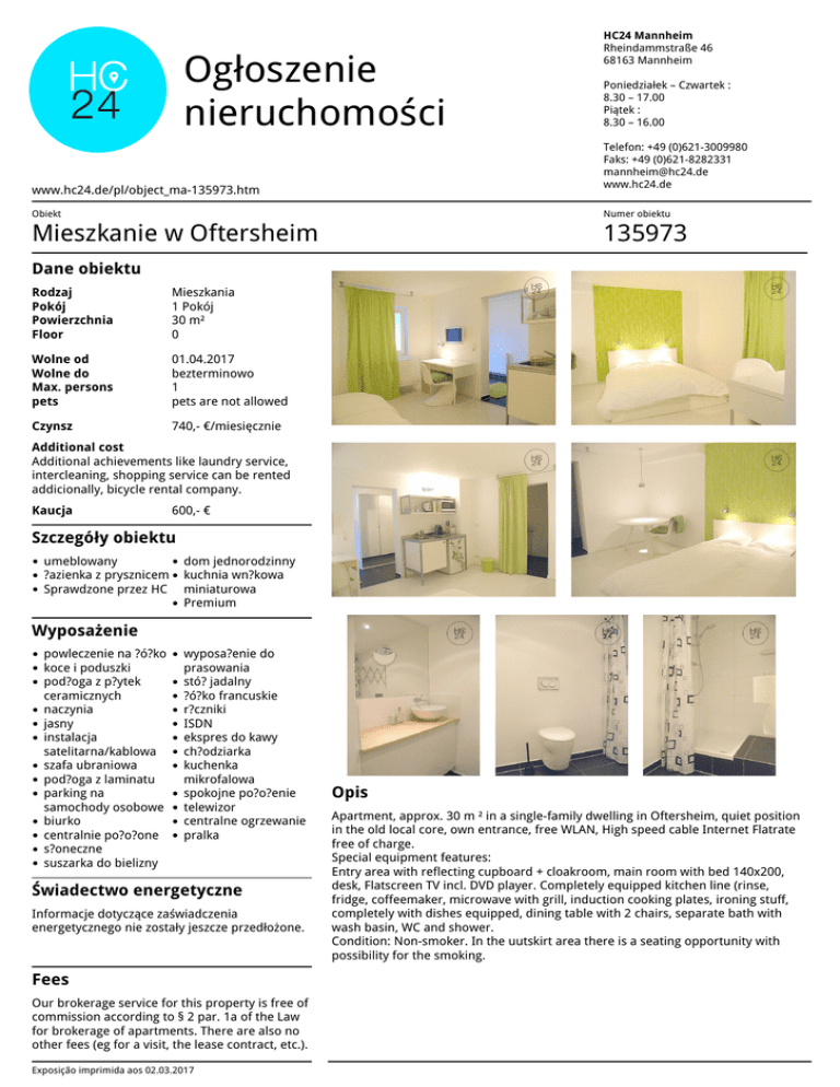 Ogłoszenie nieruchomości HC24 Mannheim Rheindammstraße 46 68163 Mannheim Poniedziałek – Czwartek : 8.30 – 17.00 Piątek : 8.30 – 16.00 Telefon: +49 (0)621-3009980 Faks: +49 (0)621-8282331 [email protected] www.hc24.de www.hc24.de/pl/object_ma-135973.htm Obiekt Numer obiektu Mieszkanie w Oftersheim 135973 Dane obiektu Rodzaj Pokój Powierzchnia Floor Mieszkania 1 Pokój 30 m² 0 Wolne od Wolne do Max. persons pets 01.04.2017 bezterminowo 1 pets are not allowed Czynsz 740,- €/miesięcznie Additional cost Additional achievements like laundry service, intercleaning, shopping service can be rented addicionally, bicycle rental company. Kaucja 600,- € Szczegóły obiektu umeblowany ?azienka z prysznicem Sprawdzone przez HC dom jednorodzinny kuchnia wn?kowa miniaturowa Premium Wyposażenie powleczenie na ?ó?ko koce i poduszki pod?oga z p?ytek ceramicznych naczynia jasny instalacja satelitarna/kablowa szafa ubraniowa pod?oga z laminatu parking na samochody osobowe biurko centralnie po?o?one s?oneczne suszarka do bielizny wyposa?enie do prasowania stó? jadalny ?ó?ko francuskie r?czniki ISDN ekspres do kawy ch?odziarka kuchenka mikrofalowa spokojne po?o?enie telewizor centralne ogrzewanie pralka Świadectwo energetyczne Informacje dotyczące zaświadczenia energetycznego nie zostały jeszcze przedłożone. Fees Our brokerage service for this property is free of commission according to § 2 par. 1a of the Law for brokerage of apartments. There are also no other fees (eg for a visit, the lease contract, etc.). Exposição imprimida aos 02.03.2017 Powered by TCPDF (www.tcpdf.org) Opis Apartment, approx. 30 m ² in a single-family dwelling in Oftersheim, quiet position in the old local core, own entrance, free WLAN, High speed cable Internet Flatrate free of charge. Special equipment features: Entry area with reflecting cupboard + cloakroom, main room with bed 140x200, desk, Flatscreen TV incl. DVD player. Completely equipped kitchen line (rinse, fridge, coffeemaker, microwave with grill, induction cooking plates, ironing stuff, completely with dishes equipped, dining table with 2 chairs, separate bath with wash basin, WC and shower. Condition: Non-smoker. In the uutskirt area there is a seating opportunity with possibility for the smoking.