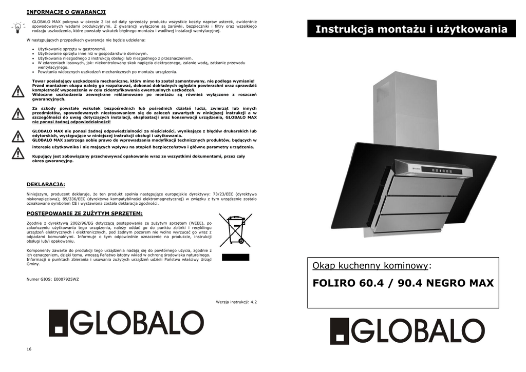 INFORMACJE O GWARANCJI GLOBALO MAX pokrywa w okresie 2 lat od daty sprzedaży produktu wszystkie koszty napraw usterek, ewidentnie spowodowanych wadami produkcyjnymi. Z gwarancji wyłączone są żarówki, bezpieczniki i filtry oraz wszelkiego rodzaju uszkodzenia, które powstały wskutek błędnego montażu i wadliwej instalacji wentylacyjnej. Instrukcja montażu i użytkowania W następujących przypadkach gwarancja nie będzie udzielana: Użytkowanie sprzętu w gastronomii. Użytkowanie sprzętu inne niż w gospodarstwie domowym. Użytkowania niezgodnego z instrukcją obsługi lub niezgodnego z przeznaczeniem. W zdarzeniach losowych, jak: niekontrolowany skok napięcia elektrycznego, zalanie wodą, zatkanie przewodu wentylacyjnego. Powstania widocznych uszkodzeń mechanicznych po montażu urządzenia. Towar posiadający uszkodzenia mechaniczne, który mimo to został zamontowany, nie podlega wymianie! Przed montażem okapu należy go rozpakować, dokonać dokładnych oględzin powierzchni oraz sprawdzić kompletność wyposażenia w celu zidentyfikowania ewentualnych uszkodzeń. Widoczne uszkodzenia zewnętrzne reklamowane po montażu są również wyłączone z roszczeń gwarancyjnych. Za szkody powstałe wskutek bezpośrednich lub pośrednich działań ludzi, zwierząt lub innych przedmiotów, spowodowanych niestosowaniem się do zaleceń zawartych w niniejszej instrukcji a w szczególności do uwag dotyczących instalacji, eksploatacji oraz konserwacji urządzenia, GLOBALO MAX nie ponosi żadnej odpowiedzialności! GLOBALO MAX nie ponosi żadnej odpowiedzialności za nieścisłości, wynikające z błędów drukarskich lub edytorskich, występujące w niniejszej instrukcji obsługi i użytkowania. GLOBALO MAX zastrzega sobie prawo do wprowadzania modyfikacji technicznych produktów, będących w interesie użytkownika i nie mających wpływu na stopień bezpieczeństwa i główne parametry urządzenia. Kupujący jest zobowiązany przechowywać opakowanie wraz ze wszystkimi dokumentami, przez cały okres gwarancyjny. DEKLARACJA: Niniejszym, producent deklaruje, że ten produkt spełnia następujące europejskie dyrektywy: 73/23/EEC (dyrektywa niskonapięciowa); 89/336/EEC (dyrektywa kompatybilności elektromagnetycznej) w związku z tym urządzenie zostało oznakowane symbolem CE i wystawiona została deklaracja zgodności. POSTĘPOWANIE ZE ZUŻYTYM SPRZĘTEM: Zgodnie z dyrektywą 2002/96/EG dotyczącą postępowania ze zużytym sprzętem (WEEE), po zakończeniu użytkowania tego urządzenia, należy oddać go do punktu zbiórki i recyklingu urządzeń elektrycznych i elektronicznych, pod żadnym pozorem nie wolno wyrzucać go wraz z odpadami komunalnymi. Informuje o tym odpowiednie oznaczenie na produkcie, instrukcji obsługi lub/i opakowaniu. Komponenty zawarte do produkcji tego urządzenia nadają się do powtórnego użycia, zgodnie z ich oznaczeniem, dzięki temu, wnoszą Państwo istotny wkład w ochronę środowiska naturalnego. Informacji o punktach zbierania i usuwania zużytych urządzeń udzieli Państwu właściwy Urząd Gminy. Okap kuchenny kominowy: FOLIRO 60.4 / 90.4 NEGRO MAX Numer GIOS: E0007925WZ Wersja instrukcji: 4.2 16 Spis treści Wymiary i dane techniczne: Serwis 4 Ilustracja urządzenia Wskazania bezpieczeństwa 5 5 Obsługa okapu Panel obsługi Jaki stopień wydajności należy wybrać? Sterowanie elektroniczne dotykowe-obsługa Włączanie i wyłączanie silnika okapu Regulacja prędkości Automatyka wyłączania okapu (TIMER) Włączanie i wyłączanie oświetlenia Komunikat „C” wyświetlaczu Napięcie: 220 – 240 V Częstotliwość: 50 Hz 6 6 6 6 6 6 6 6 6 Moc silnika: 200 W Ilość stopni prędkości 4 Moc maksymalna: 240 W Konserwacja i czyszczenie Okresy międzykonserwacyjne Czyszczenie okapu Czyszczenie metalowego filtra tłuszczowego 7 7 7 7 Klasa bezpieczeństwa: I Wydajność: 820 m3/h* Wymiana filtra z węglem aktywnym Wymiana lampy halogenowej 8 8 Jak radzić sobie z problemami w eksploatacji ? Okap w ogóle nie funkcjonuje Wydajność jest niewystarczająca / 9 9 Podwyższony szum eksploatacyjny Jedna lampa halogenowa nie działa Wszystkie lampy halogenowe nie działają 9 9 9 Tryb pracy z wyciągiem lub z wewnętrznym obiegiem powietrza Rysunek wymiarowy urządzenia 10 10 Wskazówki dla poprawnej instalacji okapu Przyłącze elektryczne 11 11 Zestawienie dostarczonych części 12 Wykonanie wewnętrznych połączeń elektrycznych Montaż ścienny 13 13 Montaż przewodu odprowadzającego Wykonanie przyłącza sieciowego Montaż maskownicy Montaż szyby Uruchomienie 14 14 14 14 14 Wymiary i dane techniczne 15 Informacje o gwarancji Deklaracja Postępowanie ze zużytym sprzętem 16 16 16 2 Oświetlenie: 2 x 20 W (Żarówka halogenowa 12V/20W/G4) Średnica wylotu: Ø 150 mm + redukcja Ø 120 mm *Błędne podłączenie przewodu wentylacyjnego powoduje spadek wydajności urządzenia, każde załamanie rury o 90 stopni powoduje spadek wydajności o około 10%. Każdy dodatkowy metr rury lub płaskiego kanału powoduje spadek wydajności o kolejne 5%. Zredukowanie średnicy przewodu poprzez redukcję pola przekroju poprzecznego - powoduje spadek wydajności urządzenia. Aby zachować fabryczne parametry urządzenia, należy tak planować montaż aby nie zmniejszać pola powierzchni wylotu turbiny okapu. Zamontowanie filtra węglowego w okapie obniża jego wydajność o około 25-30%. Każde stłumienie pracy silnika, spowoduje jego przyśpieszenie oraz zwiększenie głośności pracy! W ekstremalnych przypadkach, przy długotrwałej pracy na najwyższym stopniu prędkości i przy znacznie stłumionym ciągu, może doprowadzić nawet do spalenia silnika elektrycznego okapu. 15 Montaż przewodu odprowadzającego (tylko w wyciągowym trybie pracy) Szanowni Klienci, Do połączenia z otworem wentylacyjnym w ścianie, należy zastosować rurę z tworzywa sztucznego lub giętki przewód odprowadzający średnicy Ø 150 mm (min. 120 mm) (nie znajduje się
