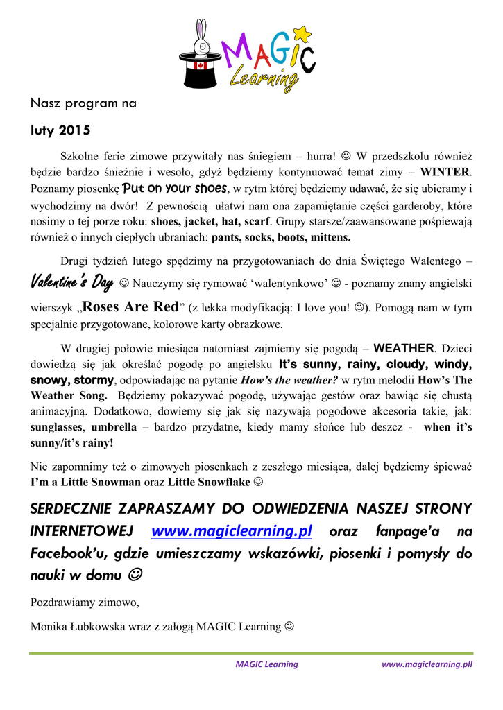 Nasz program na luty 2015 Szkolne ferie zimowe przywitały nas śniegiem – hurra!  W przedszkolu również będzie bardzo śnieżnie i wesoło, gdyż będziemy kontynuować temat zimy – WINTER. Poznamy piosenkę Put on your shoes, w rytm której będziemy udawać, że się ubieramy i wychodzimy na dwór! Z pewnością ułatwi nam ona zapamiętanie części garderoby, które nosimy o tej porze roku: shoes, jacket, hat, scarf. Grupy starsze/zaawansowane pośpiewają również o innych ciepłych ubraniach: pants, socks, boots, mittens. Drugi tydzień lutego spędzimy na przygotowaniach do dnia Świętego Walentego – Valentine’s Day  Nauczymy się rymować ‘walentynkowo’  - poznamy znany angielski wierszyk „Roses Are Red” (z lekka modyfikacją: I love you! ). Pomogą nam w tym specjalnie przygotowane, kolorowe karty obrazkowe. W drugiej połowie miesiąca natomiast zajmiemy się pogodą – WEATHER. Dzieci dowiedzą się jak określać pogodę po angielsku It’s sunny, rainy, cloudy, windy, snowy, stormy, odpowiadając na pytanie How’s the weather? w rytm melodii How’s The Weather Song. Będziemy pokazywać pogodę, używając gestów oraz bawiąc się chustą animacyjną. Dodatkowo, dowiemy się jak się nazywają pogodowe akcesoria takie, jak: sunglasses, umbrella – bardzo przydatne, kiedy mamy słońce lub deszcz - when it’s sunny/it’s rainy! Nie zapomnimy też o zimowych piosenkach z zeszłego miesiąca, dalej będziemy śpiewać I’m a Little Snowman oraz Little Snowflake  SERDECZNIE ZAPRASZAMY DO ODWIEDZENIA NASZEJ STRONY INTERNETOWEJ www.magiclearning.pl oraz fanpage’a na Facebook’u, gdzie umieszczamy wskazówki, piosenki i pomysły do nauki w domu  Pozdrawiamy zimowo, Monika Łubkowska wraz z załogą MAGIC Learning  MAGIC Learning www.magiclearning.pll Dodatkowo, dla najstarszej grupy, będziemy realizować materiał z podręcznika (zakres słownictwa oraz piosenki poniżej): Here’s Patch the Puppy 2” – kontynuujemy rozdział 3: I like (the park)-Lubię..(park) (The ball) goes-Piłka robi… (The teddy) says-Miś mówi… Bounce-odbijać się Hug-przytulać Fly-latać Ride-jechać (na rowerze/hulajnoga) Sail-żeglować Great! Let’s go/take-Fajnie! Chodźmy… Are you OK?-czy wszystko w porządku? Ball-piłka Kite-latawiec Teddy-miś Boat-łódka Scooter-hulajnoga Up/down-do góry/na dół Brown/pink-brązowy/różowy How many are there? –ile jest? Who’s got..?-kto ma…? Which one’s different?-który jest inny? Count!-licz Where’s…?-gdzie jest…? How are you?-jak się masz? What’s the weather like?-jaka jest pogoda? Sunny/cloudy/windy/raining-słonecznie/pochmurno/wietrznie/pada deszcz Blue/yellow/red/green-niebieski/żółty/czerwony/zielony Piosenki: My blue scooter; Sail the boat; Let’s go! Story song MAGIC Learning www.magiclearning.pll