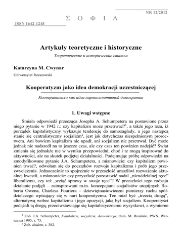 N R12/2012 7 /20 07 NR Σ IS S N 16 42 - 1 2 48 Ο Φ Ι Α ISSN 1642-1248 Artykuły teoretyczne i historyczne Теоретические и исторические статьи Katarzyna M. Cwynar Uniwersytet Rzeszowski Kooperatyzm jako idea demokracji uczestniczącej Кооперативизм как идея партисипативной демократии 1. Uwagi wstępne Śmiała odpowiedź przecząca Josepha A. Schumpetera na postawione przez niego pytanie w 1942 r.: czy kapitalizm może przetrwać?1, a także jego teza, iż porządek kapitalistyczny wykazuje tendencję do samozagłady, a jego następcą stanie się centralistyczny socjalizm2, jest jak dotychczas niespełnionym proroctwem. Ani bowiem kapitalizm nie upadł, ani socjalizm nie przetrwał. Być może jednak nie nadszedł na to jeszcze czas, ale czy czas ten powinien nadejść? Świat zmienia się jednakże nie w wyniku przepowiedni, choć i te mogą inspirować do aktywności, ale na skutek podjętej działalności. Podejmując próbę odpowiedzi na zmodyfikowane pytanie J.A. Schumpetera, a mianowicie: czy kapitalizm powinien trwać?, odwołam się do początków rozwoju kapitalizmu i prób jego przezwyciężenia. Jednocześnie to spojrzenie w przeszłość umożliwi rozważenie aktualnej kwestii, a mianowicie: czy przyszłość pozostawić nadal „niewidzialnej ręce” liberalizmu, czy też „wziąć sprawy w swoje ręce”? W przeszłości tego rodzaju działanie podjęli – zainspirowani m.in. koncepcjami socjalistów utopijnych Roberta Owena, Charlesa Fouriera – dziewiętnastowieczni pionierzy ruchu spółdzielczego wpisujący się w nurt kooperatyzmu. Ten miał być „trzecią drogą”, alternatywą wobec kapitalizmu i jego opozycji, jaką był socjalizm. Kooperatyści podążali tą drogą, przeciwstawiając się kapitalistycznemu wyzyskowi, a wymierne 1 Zob. J.A. Schumpeter, Kapitalizm, socjalizm, demokracja, tłum. M. Rusiński, PWN, Warszawa 1995, s. 75. 2 Zob. ibidem, s. 382. 96 Katarzyna M. Cwynar efekty ich działań dały wzór społeczeństwom XIX i XX-wiecznej Europy oraz Stanów Zjednoczonych Ameryki Północnej. Podstawy ładu gospodarczego XIX-wiecznej Europy, jakim stał się kapitalizm, kształtowały się wraz ze zmianami technologicznymi XVIII w., szczególnie w Anglii, zmianami demograficznymi – wzrost liczby ludności – oraz zmianami struktury społeczeństwa: z feudalnego na społeczeństwo przemysłowe. Przyczyn ówczesnej rewolucji przemysłowej i rozwijającego się kapitalizmu dopatrywano się także w religii. To Max Weber dowodził, że duch kapitalizmu ma swoje etyczne podłoże w protestantyzmie. Dla wyznawców tej religii, a w szczególności wyznawców kalwinizmu, praca miała być potwierdzeniem predestynacji do zbawienia. Człowiek swoje uzasadnienie bycia realizował poprzez pracę „na chwałę Boga” – in majorem gloriam Dei3, by w ten sposób – z obawy przed skazaniem na wieczne potępienie – zabezpieczyć sobie przynależność do tych, którzy zostali naznaczeni przez Boga dostąpieniem zbawienia. Wiara w przeznaczenie była motywacją dla potwierdzenia przynależności do wybranych. Potwierdzeniem tym miała być pracowitość i pomnażanie bogactwa jako moralny nakaz przy jednoczesnym ascetyzmie codziennego życia. Na ówczesne postrzeganie człowieka i jego pracy miał poniekąd także wpływ maltuzjanizm. Thomas R. Malthus, duchowny anglikański, dowodząc swej tezy o nieuchronnym przeludnieniu świata, w pracy z 1798 roku An Essay on the Principle of Population4, i w związku z tym koniecznością ograniczenia populacji, proponował nie tylko ograniczenie przyrostu naturalnego ale także m.in. ograniczanie praw oraz opieki ze strony państwa wobec ubogich warstw społeczeństwa. Miało to zapewnić nie tylko równowagę między tempem wzrostu ludności a tempem wzrostu produkcji żywności, ale adekwatnie do zasad religijnych, aby bogaty (co znaczyło pracowity) mógł być zbawiony, biedny, a więc leniwy, winien być stracony. Bogaci mieli więc w pierwszej kolejności prawo życia5. Racjonalność działania homo oeconomicus, sumienność w pracy mająca swe pierwotne podłoże w religii – uznanie pracy jako boskiego powołania; prowadząc z jednej strony do dobra ogólnego, przyczyniała się do rozwoju cywilizacyjnego, bowiem – jak pisze J.A. Schumpeter – „kapitalizm stał się (...) siłą napędową racjonalizacji ludzkiego postępowania”6. W konsekwencji prowadziło to jednak do negacji pierwotnych wartości. Ich miejsce zastąpił utylitaryzm, egoizm i chęć 3 Zob. M. Weber, The Protestant Ethic and the Spirit of Capitalism, translated by T. Parsons, ed. 3, London 1950, s. 108. 4 W latach 1798–1826 ukazało się sześć wydań. W języku polskim w roku 1925. Zob. T. Malthus, Prawo ludności, tłum. K. Stein, oprac. A. Krzyżanowski, nakł. Gebethnera i Wolffa, Warszawa 1925, ss. 184. 5 Zob. T. Malthus, An Essay on the Pronciple of Population, vol. III, ed. 5, London 1817, s. 154–157 oraz G.J. Holyoake, The History of Co-operation, vol. I, Pioneer Period 1812–1844, London 1875, s. 9 i n. 6 J.A. Schumpeter, op. cit., s. 154. Kooperatyzm jako idea demokracji uczestniczącej 97 nieograniczonego pomnażania bogactwa na krzywdzie ludzkiej, w myśl reguły „nabywać i pomnażać”. Wraz z zanikiem starej, feudalnej gospodarki wprawdzie wyzwolono się od panowania szlachty (klasy próżniaczej, do której także zaliczane jest duchowieństwo)7, jednakże jej miejsce zajęła burżuazja. Ta dzięki kapitałowi ma możliwość nie tylko oferowania pracy najemnej na własnych warunkach ale poprzez dysponowanie kapitałem możliwość panowania nad rozwojem społeczno-gospodarczym, mając także wpływ na politykę. Pozytywna rola gospodarki kapitalistycznej w postępie cywilizacyjnym naznaczona została odhumanizowaniem i uprzedmiotowieniem człowieka i sprowadzeniem go do roli zautomatyzowanego trybu kapitalistycznej maszyny. Wy