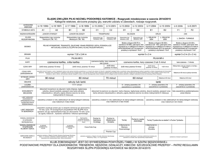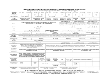 ŚLĄSKI ZWIĄZEK PIŁKI NOŻNEJ PODOKRĘG KATOWICE - Rozgrywki młodzieżowe w sezonie 2014/2015 Kategorie wiekowe, skrócone przepisy gry, warunki udziału w zawodach, rodzaje rozgrywek. KATEGORIA WIEKOWA U-19 1996r U-18 1997r U-17 1998r U-16 1999r U-15 2000r U-14 2001r U-13 2002r U-12 2003r U-11 2004r U-10 2005r U-9 2006r U-8 2007r SYMBOLE UEFA A1 A2 B1 B2 C1 C2 D1 D2 E1 E2 F1 F2 Wojewódzka Liga Młodzików 2003 L. ORLIKÓW 2004 NAZWA KATEGORII JUNIOR STARSZY JUNIOR MŁODSZY KLASA ROZGRYWKOWA Wojewódzka Liga Juniorów Starszych (’96, ’97) Wokewódzka Liga Juniorów Młodszych (’98. ’99) TRAMPKARZ Wojewódzka Liga Trampkarzy 2000 Wojewódzka Liga Trampkarzy 2001 MŁODZIK Wojewódzka Liga Młodzików 2002 ORLIK ŻAK L. ORLIKÓW 2005 L. ŻAKÓW - TURNIEJE BOISKO PEŁNO WYMIAROWE, TRAWIASTE, ZALECANE 105x68 (PRZEPISY UEFA), POSIADAJĄCE AKTUALNĄ LICENCJĘ ŚLZPN NA DANĄ KLASĘ ROZGRYWKOWĄ Boisko o długości 60-76 m, Boisko o długości 50-60m, szerokości 40-56m, pole karne: linie szerokości 26 - 40m ,pole karne: linie wyznacza się w odległości 9 metrów wyznacza się w odległości 9 metrów od linii bramkowej i po 5 na zewnątrz - od linii bramkowej i po 5 na zewnątrz prostokąt o wymiarach 16x9 • prostokąt o wymiarach 15x9 Boisko o długości 24-40m, szerokości 18-20m ,pole karne: linie wyznacza się w odległości 6 metrów od linii bramkowej i po 4 na zewnątrz prostokąt o wymiarach 11x6 BRAMKI wymiar 7,32 x 2,44 m wymiar 5 x 2 m wymiar 3 x 2 m (5 x 2 m) PIŁKI PIŁKA NR 5 czerwona kartka, KARY CZAS GRY CZAS GRY ZAWODNIKÓW WYMIAR CZASU GRY 2x45 minut, przerwa 15 minut PIŁKA NR 4 czerwona kartka, kary czasowe 3 żółta kartka lub 5 minut 2x35 minut, 2x40 minut, przerwa 15 minut przerwa 15 minut 2x30 minut, przerwa 10 minut 2x30 minut, przerwa 10 minut kara czasowa – 1 minuta. Maksymalny czas gry zespołu w turnieju – 60 minut 1x20 minut zawodnik do lat 18 (senior, Junior, trampkarz) może w tym samym terminie uczestniczy ć w różnych (nie wiece) niż dwóch ) zawodach swojego klubu w wymiarze czasu odpowiadającym jednym zawodom w klasie rozgrywkowej do której został zgłoszony . Zawodnik może uczestniczyć w spotkaniu Innej drużyny swojego klubu, w tym samym terminie, jeżeli w pierwszym spotkaniu grał nie więcej niż połowę czasu gry. Przepis ten nie dotyczy bramkarzy, którzy mogą rozegrać 2 pełne mecze oraz młodzików, żaków, orlików, Jeśli pierwsze zawody rozegrali w meczu w którym obowiązywały zmiany hokejowe lub nie rozegrali więcej niż połowę zawodów w kategorii wiekowej w której nie obowiązują zmiany hokejowe. 90 minut 80 minut OBUWIE wkręty lub lanki LICZBA ZAWODNIKÓW 11+7 zmian dokument tożsamości ze zdjęciem: karta chipowa, legitymacja szkolna, dowód osobisty, paszport oraz karta zdrowia indywidualna z aktualną zgodą lekarza (ważna na okres maksymalnie 6 miesięcy]. LIMIT WIEKOWY ZAWODNIKÓW UPRAWNIONYCH DO UCZESTNICTWA W ROZGRYWKACH zawodnicy urodzeni w roku adekwatnym do danej kategorii wiekowej oraz maksimum 3 lata młodsi LIMIT WIEKOWY W SENIORACH zawodnik uzyskuje prawo gry w zespole seniorów po ukończeniu 16 roku życia. W szczególnych przypadkach WG ŚLZPN może uprawnić do gry reprezentanta kraju po ukończenia 15 roku życia za zgodą rodziców , wydziału szkolenia i lekarza sportowego. RODZAJ ZAWODÓW W KATEGORII REPREZENTACJI Ogólnopolska Olimpiada Młodzieży, Puchar Im. Kazimierza Deyny KLUBOWE MISTRZOSTWA POLSKI KLUBOWE MISTRZOSTWA POLSKI 70 minut 60 minut Maksimum 60 minut Maksimum 60 minut w jednym terminie. Maksimum 60 minut lanki 9 – zmiany powrotne (18 zawodników w protokole) DOKUMENTY MECZOWE RODZAJ ZAWODÓW W KATEGORII KLUBÓW I SZKÓŁ czerwona kartka, kary czasowe 2 lub 5 minut 7 – zmiany powrotne (18 zawodników w protokole) 7 – zmiany powrotne (18 zawodników w protokole) dokument tożsamości ze zdjęciem: karta chipowa, legitymacja szkolna, dowód osobisty, paszport oraz karta zdrowia indywidualna z aktualną zgodą lekarza (ważna na okres maksymalnie 6 miesięcy). zawodnicy urodzeni w roku adekwatnym do danej kategorii wiekowej oraz maksimum 2 lata młodsi Puchar im. Kazimierza Górskiego Puchar im. Włodzimierza Smolarka Turniej X Memoriał im. Mariana Kozenackiego Coca-Cola Cup Puchar im. Leszka Jezierskiego lista zawodników podstemplowana przez lekarza zawodnicy urodzeni w roku adekwatnym do danej kategorii wiekowej oraz maksimum rok młodsi Turniej "Z podwórka na stadion" o Puchar Tymbarku II Mermoriał im. Jerzego Wyrobka Premier Cup SZKOLENIE DZIECI I MŁODZIEŻY szkolenie centralne w Śląskim Ośrodku Szkolenia Sportowego Młodzieży: klasy I, II, III liceum, szkolenie w klubach sportowych , promocja zawodników do reprezentacji kraju i klubów seniorskich szkolenie centralne w Śląskim Ośrodku Szkolenia Sportowego Młodzieży: klasy l,II, III gimnazjum szkolenie w klubach sportowych. promocja uzdolnionej młodzieży do szkolenia w ośrodku oraz reprezentacji wojewódzkiej szkolenie w klubach sportowych KLUB ZOBOWIĄZANY JEST DO WYWIESZENIA POWYŻSZEJ TABELI W SZATNI SĘDZIOWSKIEJ. PODSTAWOWE PRZEPISY DLA ZAWODNIKÓW, TRENERÓW, SĘDZIÓW, DZIAŁACZY, KIBICÓW. SZCZEGÓŁOWE PRZEPISY – PATRZ REGULAMIN ROZGRYWEK ŚLZPN PODOKRĘG KATOWICE NA SEZON 2014/2015