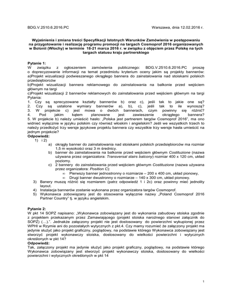BDG.V.2510.6.2016.PC Warszawa, dnia 12.02.2016 r. Wyjaśnienia i zmiana treści Specyfikacji Istotnych Warunków Zamówienia w postępowaniu na przygotowanie i realizację programu promocji na targach Cosmoprof 2016 organizowanych w Bolonii (Włochy) w terminie 18-21 marca 2016 r. w związku z objęciem przez Polskę na tych targach statusu kraju partnerskiego Pytanie 1: W związku z ogłoszeniem zamówienia publicznego: BDG.V.2510.6.2016.PC proszę o doprecyzowanie informacji na temat przedmiotu kryterium oceny jakim są projekty bannerów: a)Projekt wizualizacji podwieszanego okrągłego bannera do zainstalowania nad stoiskami polskich przedsiębiorców b)Projekt wizualizacji bannera reklamowego do zainstalowania na balkonie przed wejściem głównym na targi c)Projekt wizualizacji 2 bannerów reklamowych do zainstalowania przed wejściem głównym na targi Pytania: 1. Czy są sprecyzowane kształty bannerów b) oraz c), jeśli tak to jakie one są? 2. Czy są ustalone wymiary bannerów a), b), c), jeśli tak to ile wynoszą? 3. W projekcie c) jest mowa o dwóch bannerach, czym powinny się różnić? 4. Pod jakim kątem planowane jest zawieszenie okrągłego bannera? 5. W projekcie b) należy umieścić hasło: „Polska jest partnerem targów Cosmoprof 2016”, ma ono widnieć wyłącznie w języku polskim czy również włoskim i angielskim? Jeśli we wszystkich trzech to należy przedłożyć trzy wersje językowe projektu bannera czy wszystkie trzy wersje hasła umieścić na jednym projekcie? Odpowiedź: 1) i 2) a) okrągły banner do zainstalowania nad stoiskami polskich przedsiębiorców ma rozmiar 1,5 m wysokości oraz 3 m średnicy. b) banner do zainstalowania na balkonie przed wejściem głównym Costituzione (nazwa używana przez organizatora: Transversal stairs balcony) rozmiar 400 x 120 cm, układ poziomy. c) 2 bannery do zainstalowania przed wejściem głównym Costituzione (nazwa używana przez organizatora: Position C): • Pierwszy banner jednostronny o rozmiarze – 200 x 400 cm, układ pionowy, • Drugi banner dwustronny o rozmiarze – 140 x 300 cm, układ pionowy. 3) Banery muszą różnić się rozmiarem (patrz odpowiedź 1 i 2c) oraz powinny mieć jednolity layout. 4) Instalacja bannerów zostanie wykonana przez organizatora targów Cosmoprof. 5) Wykonawca zobowiązany jest do stosowania wyłącznie nazwy „Poland Cosmoprof 2016 Partner Country” tj. w języku angielskim. Pytanie 2: W pkt 14 SOPZ napisano: „Wykonawca zobowiązany jest do wykonania zabudowy stoiska zgodnie z projektem przekazanym przez Zamawiającego (projekt stoiska narożnego stanowi załącznik do SOPZ) (…).”. Jednakże załączony projekt nie jest dostosowany do powierzchni wykupionej przez WPHI w Rzymie ani do pozostałych wytycznych z pkt.4. Czy mamy rozumieć że załączony projekt ma jedynie służyć jako projekt graficzny, poglądowy, na podstawie którego Wykonawca zobowiązany jest stworzyć projekt wykonawczy stoiska, dostosowany do wielkości powierzchni i wytycznych określonych w pkt 14? Odpowiedź: Tak, załączony projekt ma jedynie służyć jako projekt graficzny, poglądowy, na podstawie którego Wykonawca zobowiązany jest stworzyć projekt wykonawczy stoiska, dostosowany do wielkości powierzchni i wytycznych określonych w pkt 14 1 Pytanie 3: Z informacji uzyskanych od organizatora targów wynika, iż w przestrzeni International Buyers Lounge, w której ma się odbyć spotkanie opisane w pkt 25 SOPZ, zmieści się maksymalnie 200 osób. Dodatkowo wykupiony już został catering od oficjalnego dostawcy targów – i jeśli miałyby tam być serwowane polskie produkty, włoski catering powinien zostać anulowany, ponieważ włoska firma nie chce brać odpowiedzialności za serwowanie niezakupionych przez siebie produktów. Czy Wykonawca ma zgodnie z wytycznymi w pkt 26 SOPZ zapewnić polski catering i tym samym włoski catering ma zostać anulowany? Czy też zrezygnować należy z zakupu polskich produktów i korzystamy z opłaconej włoskiej firmy? Czy zmniejszyć catering 200 osób? Czy ma być przygotowane tylko 200 toreb podarunkowych dla uczestników spotkania – w pkt 9 SOPZ mowa o 100 torbach, a w pkt 10 o 200 torbach, razem o 300 torbach? Odpowiedź: Zamawiający rezygnuje z realizacji usługi cateringu, o której mowa w pkt 25 SOPZ. Tym samym treść: „zapewnienie przez całe spotkanie polskiego poczęstunku dla 300 osób biorących udział w spotkaniu, w ramach którego zapewnione zostaną polskie wędliny, polskie sery, polskie pieczywo, polskie ciasta/ciastka, miody pitne typu czwórniak, woda, kawa, herbata (polskie sery i wędliny, chleb oraz ciasta/ciastka do degustacji powinny posiadać jeden z certyfikatów: Chroniona Nazwa Pochodzenia, Chronione Oznaczenie Geograficzne lub Gwarantowana Tradycyjna Specjalność lub być polskimi produktami tradycyjnymi bądź regionalnymi). Poczęstunek powinien być podany w formie szwedzkiego stołu. Wykonawca zobowiązany jest do zapewnienia estetycznych naczyń do degustacji posiłków, napojów oraz wina, które zapewnione zostanie przez Wydział Promocji Handlu i Inwestycji w Rzymie a także obsługi kelnerskiej do podawania napojów oraz odbierania naczyń – minimum 10 osób.” zostaje wykreślona z pkt 25 SOPZ. Wykonawca zobowiązany jest przygotować łącznie 300 toreb podarunkowych. niewykorzystane, Wykonawca zobowiązany jest dostarczyć na polskie stoisko informacyjne. Torby Pytanie 4: W pkt 21 SOPZ zapisano zadanie wykupienia 5 bannerów podwieszanych. W pkt 20 zapisano, iż 3 bannery zostały już wykupione przez WPHI. Ponieważ bannery można wieszać tylko w hali 29, wszystkie 8 bannerów musiałoby wisieć w hali 29, nad stoiskami polskich firm (nad 3 alejkami pomiędzy polskimi stoiskami). Czy nie doszło do omyłki w pkt 21? Dodatkowe 5 bannerów to znaczący koszt, stanowiący jeden z największych punktów w budżecie przedsięwzięcia (jeśli miałyby mieć wymiary takie same jak w pkt 