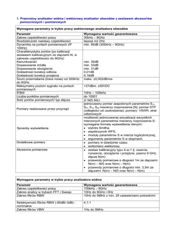 1. Przenośny analizator widma i wektorowy analizator obwodów z zestawem akcesoriów pomocniczych i pomiarowych Wymagane parametry w trybie pracy wektorowego analizatora obwodów Parametr Zakres częstotliwości pracy Rozdzielczość nastawy częstotliwości Dynamika na portach pomiarowych (IF 100Hz) Charakterystyka portów (po kalibracji zestawem kalibracyjnym ze złączami N, w zakresie częstotliwości do 9GHz) Kierunkowość Dopasowanie źródła Dopasowanie obciążenia Dokładność korekcji odbicia Dokładność korekcji przejścia Szum przemiatania (trace noise) od 300kHz do 9GHz Maksymalny poziom sygnału na portach pomiarowych IFBW Liczba punktów pomiarowych Ilość portów pomiarowych/ typ złącza Pomiary realizowane przez przyrząd Sposoby wyświetlania Dodatkowe pomiary Akcesoria pomiarowe Wymagana wartość gwarantowana 30kHz – 9GHz lepsza niż 2Hz min. 95dB (300kHz – 9GHz) min. 35dB min. 33dB min. 31dB 0,01dB 0,18dB maks. ±0,002dBrms +27dBm, ±50VDC 10Hz – 100kHz do 10001 2/ N(f) 50 jednoczesny pomiar zespolonych parametrów S11, S21, S12, S22 macierzy rozproszenia [S]; pomiar DTF (odległości od uszkodzenia); pomiary: VSWR, strat odbiciowych możliwość jednoczesnej wizualizacji wszystkich mierzonych parametrów macierzy rozproszenia S; wymagane formaty wyświetlania danych: wykres Smitha, współczynnik WFS, moduły parametrów S w mierze logarytmicznej, argumenty parametrów S w stopniach. pomiary w dziedzinie czasu woltomierz wektorowy zestaw kalibracyjny typu 4-w-1 tj. zwarcie, rozwarcie, obciążenie i przejście, pasmo 9 GHz, złącze N(m) przewody pomiarowe o długości 1m ze złączami: N(m) – N(f) oraz N(m) – N(m) przewody pomiarowe o długości min. 3,5m ze złączami: N(m) – N(f) oraz N(m) – N(m) Wymagane parametry w trybie pracy analizatora widma Parametr Zakres częstotliwości pracy Zakres analizy w trybach FFT i Sweep Zakres filtrów RBW Wymagana wartość gwarantowana 100kHz – 9GHz 10Hz do 9GHz i 0Hz 10Hz do 5MHz z min. 25 ustawieniami pośrednimi Selektywność filtrów RBW (-60dB/-3dB) nominalna Zakres filtrów VBW 4,1:1 1Hz do 5MHz Maksymalny poziom szumów własnych (DANL), w temp. -10°C - +55°C Szumy fazowe, CF=1GHz, w temp. -10°C +55°C Zakres pracy tłumika wejściowego Maksymalny, dopuszczalny poziom wejściowy: Ilość punktów pomiarowych Wyjście sygnału częstotliwości pośredniej Dodatkowe funkcje: Wbudowany przedwzmacniacz Wbudowany miernik mocy Akcesoria Typ i impedancja wyjścia 2MHz – 2,1GHz: -151dBm 2,1MHz – 2,8GHz: -147dBm 2,8GHz – 4,5GHz: -151dBm 4,5GHz – 7GHz: -147dBm 7GHz – 9GHz: -145dBm @10kHz, -106dBc/Hz @30kHz, -104dBc/Hz @100kHz, -99dBc/Hz @1MHz, -110dBc/Hz @5MHz, -120dBc/Hz 0 – 50dB, z krokiem 5dB +27dBm, ±50V DC do 10001 Częstotliwość środkowa: 33,75MHz, pasmo IF: 5MHz analizator interferencji i spektrogram oraz nagrywanie i odtwarzanie sygnałów nominalne wzmocnienie 20dB w paśmie 100kHz9GHz wraz z sondą mocy średniej i szczytowej na USB, pasmo pracy sondy mocy 50MHz – 18GHz, zakres mocy -30dBm do +20dBm, pasmo VBW = 30MHz tłumik regulowany, 11dB z krokiem 1dB, pasmo DC – 18GHz, maksymalna moc ciągła 1W, złącze N tłumik regulowany, 70dB z krokiem 10dB, pasmo DC – 18GHz, maksymalna moc ciągła 1W, złącze N tłumik stały, 40dB, DC – 8,5GHz, 50W, złącza N(m) – N(f) sztuczne obciążenie programowalne, Napięcie wejściowe 0-80VDC, Obciążalność prądowa 0600A, Moc przyłączeniowa ciągła 7.2kW, Napięcie zasilania 115/230VAC. N(f), 50 Cechy ogólne Interfejsy Waga Wyświetlacz Zakres temperatur pracy Czas pracy na baterii Termin dostawy Gwarancja Wymagania dodatkowe 2 x USB-A (Hi-speed USB 2.0), mini-USB (Hi-speed USB 2.0), LAN (100-baseT) 3kg łącznie z baterią Kolorowy 6,5” VGA-LED -10°C - 50°C powyżej 3 godzin do 3 miesięcy 12 miesięcy Sprzęt fabrycznie nowy Miernik mocy sygnałów mikrofalowych z wyposażeniem Zakres częstotliwości pracy Zakres dynamiki pomiarów Liczba kanałów pomiarowych 9kHz do 110GHz (zależy od dołączonych sond) -70dBm do +44dBm (zależy od dołączonych sond) 1 Prędkość pomiarów Interfejsy komunikacyjne Pomiary Wyświetlane jednostki 400 odczytów/s USB, LAN, GPIB Mocy średniej Bezwzględne: Watt i dBm, względne: % i dB Sondy w zestawie Sonda mocy średniej, pasmo pracy 9kHz – 18GHz, zakres mierzonych mocy -60dBm do +20dBm 2. Oscyloskop cyfrowy sygnałów mieszanych z zestawem akcesoriów pomocniczych i pomiarowych Parametr techniczny Pasmo pracy Liczba kanałów Impedancja wejścia analogowych kanałów pomiarowych Próbkowanie Szybkość odświeżania przebiegów Separacja międzykanałowa Pamięć Generator sygnałowy Woltomierz cyfrowy Dekodowanie sprzętowe/wyzwalanie dla interfejsów w standardach Oprogramowanie do analizy offline z funkcjonalnością dekodowania standardu Segmentacja pamięci Wbudowane funkcje matematyczne Pomiary mocy Pokrętła na panelu czołowym Ekran Interfejsy Oprogramowanie Oprogramowanie na PC Oprogramowanie dodatkowe Gwarancja Wymagania dodatkowe Akcesoria Wymagana wartość gwarantowana 1GHz 4 kanały analogowe + 16 kanałów cyfrowych 50 Ω/1 MΩ Nie mniej niż 5 GSa/s przy 2 kanałach aktywnych Nie mniej niż 2,5 GSa/s przy 4 kanałach aktywnych Max. szybkość nie mniejsza niż 1 000 000 razy/s W paśmie 200MHz – 1GHz: nie mniejsza niż 40dB Nie mniej niż 4 Megapunktów na kanał Wbudowany, dwukanałowy generator arbitralny: częstotliwość 20MHz dla podstawowych przebiegów funkcyjnych: sinus, prostokąt, szum Wbudowany, min. 3 cyfry RS-232/UART, MIL-1553, ARINC429, CAN, LIN, USB2.0 (full-speed and hi-speed), możliwość analizy min. 2 interfejsów jednocześnie Min. dla RS-232/UART Wbudowane, możliwość przeprowadzania testów z wykorzystaniem masek i limitów Operacje podstawowe, transformaty: FFT, wartość bezwzględna, Ax+B, logarytmy, przestrajalne filtry: DP, GP, wartość średnia, wizualizacja: trend pomiarowy, powiększenie, analiza ruchu dla magistral 