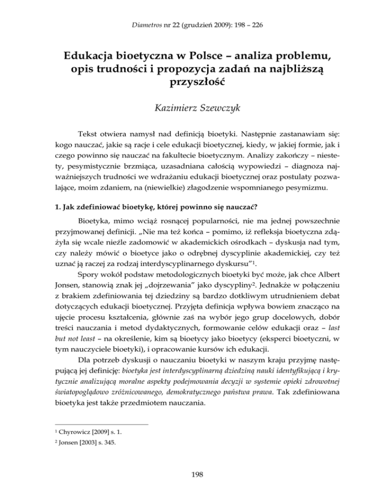 Diametros nr 22 (grudzień 2009): 198 – 226 Edukacja bioetyczna w Polsce – analiza problemu, opis trudności i propozycja zadań na najbliŜszą przyszłość Kazimierz Szewczyk Tekst otwiera namysł nad definicją bioetyki. Następnie zastanawiam się: kogo nauczać, jakie są racje i cele edukacji bioetycznej, kiedy, w jakiej formie, jak i czego powinno się nauczać na fakultecie bioetycznym. Analizy zakończy – niestety, pesymistycznie brzmiąca, uzasadniana całością wypowiedzi – diagnoza najwaŜniejszych trudności we wdraŜaniu edukacji bioetycznej oraz postulaty pozwalające, moim zdaniem, na (niewielkie) złagodzenie wspomnianego pesymizmu. 1. Jak zdefiniować bioetykę, której powinno się nauczać? Bioetyka, mimo wciąŜ rosnącej popularności, nie ma jednej powszechnie przyjmowanej definicji. „Nie ma teŜ końca – pomimo, iŜ refleksja bioetyczna zdąŜyła się wcale nieźle zadomowić w akademickich ośrodkach – dyskusja nad tym, czy naleŜy mówić o bioetyce jako o odrębnej dyscyplinie akademickiej, czy teŜ uznać ją raczej za rodzaj interdyscyplinarnego dyskursu”1. Spory wokół podstaw metodologicznych bioetyki być moŜe, jak chce Albert Jonsen, stanowią znak jej „dojrzewania” jako dyscypliny2. JednakŜe w połączeniu z brakiem zdefiniowania tej dziedziny są bardzo dotkliwym utrudnieniem debat dotyczących edukacji bioetycznej. Przyjęta definicja wpływa bowiem znacząco na ujęcie procesu kształcenia, głównie zaś na wybór jego grup docelowych, dobór treści nauczania i metod dydaktycznych, formowanie celów edukacji oraz – last but not least – na określenie, kim są bioetycy jako bioetycy (eksperci bioetyczni, w tym nauczyciele bioetyki), i opracowanie kursów ich edukacji. Dla potrzeb dyskusji o nauczaniu bioetyki w naszym kraju przyjmę następującą jej definicję: bioetyka jest interdyscyplinarną dziedziną nauki identyfikującą i krytycznie analizującą moralne aspekty podejmowania decyzji w systemie opieki zdrowotnej światopoglądowo zróŜnicowanego, demokratycznego państwa prawa. Tak zdefiniowana bioetyka jest takŜe przedmiotem nauczania. 1 Chyrowicz [2009] s. 1. 2 Jonsen [2003] s. 345. 198 Kazimierz Szewczyk Edukacja bioetyczna w Polsce W zaproponowanej definicji dokładniejszego omówienia wymagają: a. interdyscyplinarność bioetyki jako nauki, b. zwrócenie uwagi na podejmowanie decyzji w systemie opieki zdrowotnej i samo pojęcie tego systemu, c. zaakcentowanie w niej społeczno-ustrojowego otoczenia bioetyki. A. Interdyscyplinarność bioetyki jako nauki W tekście wprowadzającym do debaty stawiałem znak równości między „inter” i „wielodyscyplinarnością” bioetyki. Wypowiedź Barbary Chyrowicz uświadomiła mi problematyczność tego utoŜsamienia3. Obecnie przyjmuję, Ŝe termin „interdyscyplinarność” odsyła do zintegrowanej całości, w której granice między poszczególnymi dyscyplinami uległy zatarciu w trakcie ich łączenia, lub są postrzegane jako mniej istotne. Z pierwszą moŜliwością mamy do czynienia w bioetyce jako dziedzinie nauki powstałej z wielu dziedzin składowych. RównieŜ w zbiorowych ciałach bioetycznych granice między fakultetami ich członków mogą być postrzegane jako mniej istotne w porównaniu z celem pracy tych kolegiów, np. wspólnym ustalaniem dyrektyw etycznych. Jeśli tak właśnie będzie, wówczas moŜna nazwać takie gremia zespołami interdyscyplinarnymi. Natomiast za typowo wielodyscyplinarny (multiprofesjonalny) zespół uznam – w myśl zaproponowanej konwencji terminologicznej – ciało złoŜone z przedstawicieli wielu fakultetów jako ekspertów w swoich dziedzinach powołane, np. do opracowania prawnych, etycznych, społecznych, psychologicznych, itd. aspektów zapłodnienia zewnątrzustrojowego. Zaakcentowanie w ten sposób ujmowanej interdyscyplinarności bioetyki pokazuje, Ŝe wywodząc się z wielu nauk „macierzystych” zdolna jest do ich scalania, nie tracąc swojej odrębności i nie redukując się do fakultetów dających jej początek. Budowanie bioetyki przebiega w odwrotnym kierunku niŜ dotychczasowy proces wyłaniania się nauk szczegółowych z filozofii. Loretta Kopelman tak konstruowaną naukę nazywa „dyscypliną drugiego porządku”4. Definiowanie bioetyki jako interdyscyplinarnej nauki nie pozwala na jej dwojakie zawłaszczenie: a. przez filozofię/teologię; bioetyka nie jest aplikacją teorii filozoficznych bądź teologicznych do specyficznych problemów związanych z ludzkim Ŝyciem. Słowem, nie jest etyką szczegółową, b. przez medycynę; bioetyka nie stanowi części biomedycyny. 3 Chyrowicz [2009] s. 1-4. 4 Kopelman [2006] s. 620 i n. 199 Kazimierz Szewczyk Edukacja bioetyczna w Polsce W przeciwieństwie do tych redukcjonistycznych zakusów bioetyka – zgodnie z proponowaną definicją jako dziedzina interdyscyplinarna – jest metodologicznie odrębną nauką stanowiącą część systemu opieki zdrowotnej złączoną w funkcjonalną całość z pozostałymi jego składnikami. MoŜna ją nawet potraktować jako wyróŜnioną część systemu – element, poprzez który społeczeństwo jako suweren moralny wpływa na kształt i funkcjonowanie opieki zdrowotnej5. Podkreślanie, Ŝe bioetyka jest interdyscyplinarną nauką nieredukowalną do jej dziedzin macierzystych utrudnia takŜe jej „rozpuszczenie” się w wieloprofesjonalnym społecznym dyskursie bioetycznym. AngaŜuje on oprócz bioetyków równieŜ ekspertów z innych nauk, zawodów i profesji oraz szerokie kręgi społeczeństwa. WaŜne jest, aby nie sprowadzać bioetyki wyłącznie do takiego dyskursu i odróŜniać w nim bioetyków jako bioetyków od pozostałych uczestników debaty, przede wszystkim ze względu na funkcje, jakie w niej spełniają. Interdyscyplinarność „bio-etyki” w Ŝadnej mierze nie oznacza, Ŝe przestaje być „etyką”. Inaczej mówiąc, normatywnej podstawy „bio” powinno się szukać w treściowej