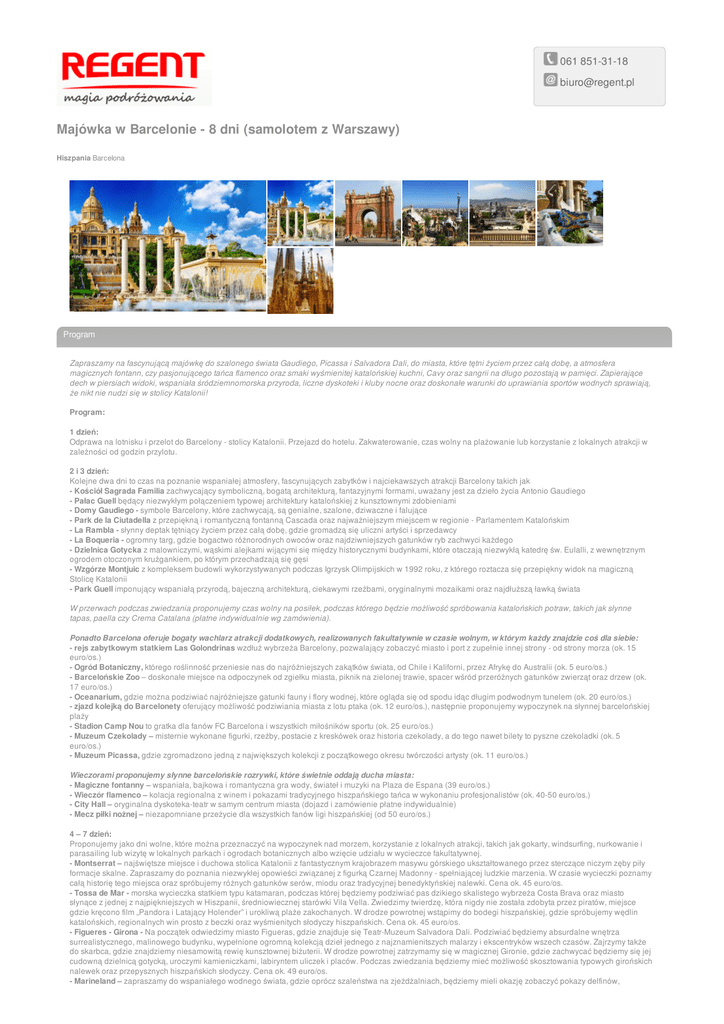 061 851-31-18 [email protected] Majówka w Barcelonie - 8 dni (samolotem z Warszawy) Hiszpania Barcelona Program Zapraszamy na fascynującą majówkę do szalonego świata Gaudiego, Picassa i Salvadora Dali, do miasta, które tętni życiem przez całą dobę, a atmosfera magicznych fontann, czy pasjonującego tańca flamenco oraz smaki wyśmienitej katalońskiej kuchni, Cavy oraz sangrii na długo pozostają w pamięci. Zapierające dech w piersiach widoki, wspaniała śródziemnomorska przyroda, liczne dyskoteki i kluby nocne oraz doskonałe warunki do uprawiania sportów wodnych sprawiają, że nikt nie nudzi się w stolicy Katalonii! Program: 1 dzień: Odprawa na lotnisku i przelot do Barcelony - stolicy Katalonii. Przejazd do hotelu. Zakwaterowanie, czas wolny na plażowanie lub korzystanie z lokalnych atrakcji w zależności od godzin przylotu. 2 i 3 dzień: Kolejne dwa dni to czas na poznanie wspaniałej atmosfery, fascynujących zabytków i najciekawszych atrakcji Barcelony takich jak - Kościół Sagrada Familia zachwycający symboliczną, bogatą architekturą, fantazyjnymi formami, uważany jest za dzieło życia Antonio Gaudiego - Pałac Guell będący niezwykłym połączeniem typowej architektury katalońskiej z kunsztownymi zdobieniami - Domy Gaudiego - symbole Barcelony, które zachwycają, są genialne, szalone, dziwaczne i falujące - Park de la Ciutadella z przepiękną i romantyczną fontanną Cascada oraz najważniejszym miejscem w regionie - Parlamentem Katalońskim - La Rambla - słynny deptak tętniący życiem przez całą dobę, gdzie gromadzą się uliczni artyści i sprzedawcy - La Boqueria - ogromny targ, gdzie bogactwo różnorodnych owoców oraz najdziwniejszych gatunków ryb zachwyci każdego - Dzielnica Gotycka z malowniczymi, wąskimi alejkami wijącymi się między historycznymi budynkami, które otaczają niezwykłą katedrę św. Eulalli, z wewnętrznym ogrodem otoczonym krużgankiem, po którym przechadzają się gęsi - Wzgórze Montjuic z kompleksem budowli wykorzystywanych podczas Igrzysk Olimpijskich w 1992 roku, z którego roztacza się przepiękny widok na magiczną Stolicę Katalonii - Park Guell imponujący wspaniałą przyrodą, bajeczną architekturą, ciekawymi rzeźbami, oryginalnymi mozaikami oraz najdłuższą ławką świata W przerwach podczas zwiedzania proponujemy czas wolny na posiłek, podczas którego będzie możliwość spróbowania katalońskich potraw, takich jak słynne tapas, paella czy Crema Catalana (płatne indywidualnie wg zamówienia). Ponadto Barcelona oferuje bogaty wachlarz atrakcji dodatkowych, realizowanych fakultatywnie w czasie wolnym, w którym każdy znajdzie coś dla siebie: - rejs zabytkowym statkiem Las Golondrinas wzdłuż wybrzeża Barcelony, pozwalający zobaczyć miasto i port z zupełnie innej strony - od strony morza (ok. 15 euro/os.) - Ogród Botaniczny, którego roślinność przeniesie nas do najróżniejszych zakątków świata, od Chile i Kaliforni, przez Afrykę do Australii (ok. 5 euro/os.) - Barcelońskie Zoo – doskonałe miejsce na odpoczynek od zgiełku miasta, piknik na zielonej trawie, spacer wśród przeróżnych gatunków zwierząt oraz drzew (ok. 17 euro/os.) - Oceanarium, gdzie można podziwiać najróżniejsze gatunki fauny i flory wodnej, które ogląda się od spodu idąc długim podwodnym tunelem (ok. 20 euro/os.) - zjazd kolejką do Barcelonety oferujący możliwość podziwiania miasta z lotu ptaka (ok. 12 euro/os.), następnie proponujemy wypoczynek na słynnej barcelońskiej plaży - Stadion Camp Nou to gratka dla fanów FC Barcelona i wszystkich miłośników sportu (ok. 25 euro/os.) - Muzeum Czekolady – misternie wykonane figurki, rzeźby, postacie z kreskówek oraz historia czekolady, a do tego nawet bilety to pyszne czekoladki (ok. 5 euro/os.) - Muzeum Picassa, gdzie zgromadzono jedną z największych kolekcji z początkowego okresu twórczości artysty (ok. 11 euro/os.) Wieczorami proponujemy słynne barcelońskie rozrywki, które świetnie oddają ducha miasta: - Magiczne fontanny – wspaniała, bajkowa i romantyczna gra wody, świateł i muzyki na Plaza de Espana (39 euro/os.) - Wieczór flamenco – kolacja regionalna z winem i pokazami tradycyjnego hiszpańskiego tańca w wykonaniu profesjonalistów (ok. 40-50 euro/os.) - City Hall – oryginalna dyskoteka-teatr w samym centrum miasta (dojazd i zamówienie płatne indywidualnie) - Mecz piłki nożnej – niezapomniane przeżycie dla wszystkich fanów ligi hiszpańskiej (od 50 euro/os.) 4 – 7 dzień: Proponujemy jako dni wolne, które można przeznaczyć na wypoczynek nad morzem, korzystanie z lokalnych atrakcji, takich jak gokarty, windsurfing, nurkowanie i parasailing lub wizytę w lokalnych parkach i ogrodach botanicznych albo wzięcie udziału w wycieczce fakultatywnej. - Montserrat – najświętsze miejsce i duchowa stolica Katalonii z fantastycznym krajobrazem masywu górskiego ukształtowanego przez sterczące niczym zęby piły formacje skalne. Zapraszamy do poznania niezwykłej opowieści związanej z figurką Czarnej Madonny - spełniającej ludzkie marzenia. W czasie wycieczki poznamy całą historię tego miejsca oraz spróbujemy różnych gatunków serów, miodu oraz tradycyjnej benedyktyńskiej nalewki. Cena ok. 45 euro/os. - Tossa de Mar - morska wycieczka statkiem typu katamaran, podczas której będziemy podziwiać pas dzikiego skalistego wybrzeża Costa Brava oraz miasto słynące z jednej z najpiękniejszych w Hiszpanii, średniowiecznej starówki Vila Vella. Zwiedzimy twierdzę, która nigdy nie została zdobyta przez piratów, miejsce gdzie kręcono film „Pandora i Latający Holender” i urokliwą plaże zakochanych. W drodze powrotnej wstąpimy do bodegi hiszpańskiej, gdzie spróbujemy wędlin katalońskich, regionalnych win prosto z beczki oraz wyśmienitych słodyczy hiszpańskich. Cena ok. 45 euro/os. - Figueres - Girona - Na początek odwiedzimy miasto Figueras, gdzie znajduje się 