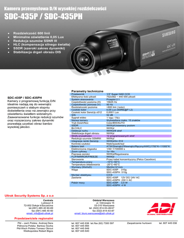 • • • • • • Rozdzielczość 600 linii Minimalne oświetlenie 0,05 Lux Redukcja szumów SSNR III HLC (kompensacja silnego światła) SSDR (szeroki zakres dynamiki) Stabilizacja drgań obrazu DIS Parametry techniczne SDC-435P / SDC-435PH Kamery z programową funkcją D/N idealnie nadają się do wewnątrz pomieszczeń o słabym stopniu doświetlenia oraz na zewnątrz przy oświetleniu światłem widzialnym. Zaawansowane funkcje redukcji szumów oraz rozszerzony zakres dynamiki pozwalają uzyskać obraz bardzo wysokiej jakości. Przetwornik Efektywna ilość pikseli System skanowania Częstotliwość pozioma (H) Częstotliwość pionowa (V) Rozdzielczość pozioma Czułość kolor Czułość kolor SensUp x512 S/N Sygnał wideo Nazwa kamery Tryb Dzień/Noc SSDR BLC/HLC Detekcja ruchu Stabilizacja drgań obrazu Strefy prywatności Redukcja szumów SSNRIII Integracja ramki SensUp Kontrola czułości Balans bieli Elektroniczna migawka Zoom cyfrowy Poprawa osrości FLIP/MIRROR/FREEZE Sterowanie Temperatura pracy Temperatura składowania Wymiary (WxHxD) Waga Montaż obiektywu Zasilanie Pobór mocy 1/3” Super HAD CCD 752x582 ~ 440 000 pikseli Przeplot 2:1 15625 Hz 50 Hz >600 linii ( kolor) 0,05 Lux (50IRE@F1,2) 0,0001 Lux 52 dB 1 Vpp / 75Ω Wyświetlana maks. 15 znaków Color/BW/AUTO Wł/Wył/Ustawiany poziom Wł/Wył Wł/Wył/8 stref Wł/Wył 12 programowanych stref Wł/Wył Wł/Wył/2x~512 Niski/wysoki/wył ATW/Zewnątrz/Wewnątrz/Ręczny/AWC(1700°K~11000°K 1/50~1/100000 s 1x~16x Wł/Wył/Regulowana Wł/Wył Przez kabel koncentryczny (Pelco Caoxitron) -10°C~50°C -20°C~60°C 58x52x121mm SDC-435P 310g SDC-435PH 510g C/CS SDC-435P 12V DC/ 24V AC SDC-435PH 230 V AC SDC-435P 3,5 W SDC-435PH 4 W Ultrak Security Systems Sp. z o.o Centrala Lubiszyn 8 72-002 Dołuje k/Szczecina tel.(091) 485 40 60-69 fax (091) 485 40 60 email: [email protected] Przedstawiciele regionalni www.ultrak.pl Płd – zach Polska Andrzej Dera Północna Polska Bartosz Socha Płd-Wsch Polska Tomasz Obrzut Wielkopolska Robert Bigos Oddział Warszawa ul. Odrowąża 15 03-310 Warszawa tel. (022) 814-53-46/47 fax (022) 814-53-87 email: [email protected] tel. 607 445 836 tel./fax (62) 7300 597 tel. 607 445 894 tel. 607 445 848 tel. 607 445 640 ADI INTERNATIONAL jest marką handlową firmy Ultrak Security Systems Sp. z o.o Zaopatrzenie hurtowni tel. 607 445 038