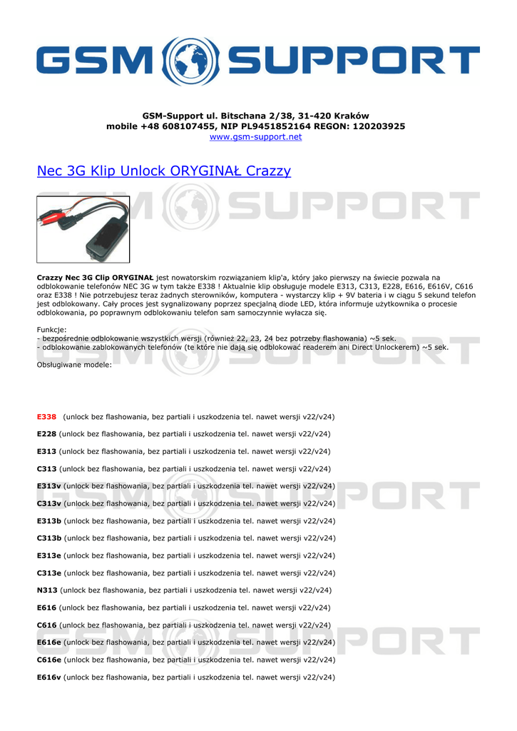 GSM-Support ul. Bitschana 2/38, 31-420 Kraków mobile +48 608107455, NIP PL9451852164 REGON: 120203925 www.gsm-support.net Nec 3G Klip Unlock ORYGINAŁ Crazzy Crazzy Nec 3G Clip ORYGINAŁ jest nowatorskim rozwiązaniem klip'a, który jako pierwszy na świecie pozwala na odblokowanie telefonów NEC 3G w tym także E338 ! Aktualnie klip obsługuje modele E313, C313, E228, E616, E616V, C616 oraz E338 ! Nie potrzebujesz teraz żadnych sterowników, komputera - wystarczy klip + 9V bateria i w ciągu 5 sekund telefon jest odblokowany. Cały proces jest sygnalizowany poprzez specjalną diode LED, która informuje użytkownika o procesie odblokowania, po poprawnym odblokowaniu telefon sam samoczynnie wyłacza się. Funkcje: - bezpośrednie odblokowanie wszystkich wersji (również 22, 23, 24 bez potrzeby flashowania) ~5 sek. - odblokowanie zablokowanych telefonów (te które nie dają się odblokować readerem ani Direct Unlockerem) ~5 sek. Obsługiwane modele: E338 (unlock bez flashowania, bez partiali i uszkodzenia tel. nawet wersji v22/v24) E228 (unlock bez flashowania, bez partiali i uszkodzenia tel. nawet wersji v22/v24) E313 (unlock bez flashowania, bez partiali i uszkodzenia tel. nawet wersji v22/v24) C313 (unlock bez flashowania, bez partiali i uszkodzenia tel. nawet wersji v22/v24) E313v (unlock bez flashowania, bez partiali i uszkodzenia tel. nawet wersji v22/v24) C313v (unlock bez flashowania, bez partiali i uszkodzenia tel. nawet wersji v22/v24) E313b (unlock bez flashowania, bez partiali i uszkodzenia tel. nawet wersji v22/v24) C313b (unlock bez flashowania, bez partiali i uszkodzenia tel. nawet wersji v22/v24) E313e (unlock bez flashowania, bez partiali i uszkodzenia tel. nawet wersji v22/v24) C313e (unlock bez flashowania, bez partiali i uszkodzenia tel. nawet wersji v22/v24) N313 (unlock bez flashowania, bez partiali i uszkodzenia tel. nawet wersji v22/v24) E616 (unlock bez flashowania, bez partiali i uszkodzenia tel. nawet wersji v22/v24) C616 (unlock bez flashowania, bez partiali i uszkodzenia tel. nawet wersji v22/v24) E616e (unlock bez flashowania, bez partiali i uszkodzenia tel. nawet wersji v22/v24) C616e (unlock bez flashowania, bez partiali i uszkodzenia tel. nawet wersji v22/v24) E616v (unlock bez flashowania, bez partiali i uszkodzenia tel. nawet wersji v22/v24) C616v (unlock bez flashowania, bez partiali i uszkodzenia tel. nawet wersji v22/v24) E616b (unlock bez flashowania, bez partiali i uszkodzenia tel. nawet wersji v22/v24) C616b (unlock bez flashowania, bez partiali i uszkodzenia tel. nawet wersji v22/v24) N616 (unlock bez flashowania, bez partiali i uszkodzenia tel. nawet wersji v22/v24) N616v (unlock bez flashowania, bez partiali i uszkodzenia tel. nawet wersji v22/v24) KLIP PODCZAS OPERACJI ZDJĘCIA SIMLOCK'A ZMIENIA IMEI ORAZ USTAWIA JĘZYKI W TELEFONIE NA JĘZYK ANGIELSKI/CHIŃSKI. PO OPERACJI UNLOCK'A NALEŻY AKTYWOWAĆ JĘZYKI SPECJALNYMI KOMENDAMI DOSTARCZONYMI W INSTRUKCJI !!! Zdjęcie klip'a Zestaw zawiera: - Crazzy Nec 3G Clip ORYGINAŁ - instrukcja - karte gwarancyjną ©2012 www.gsm-support.net Opis ten nie stanowi oferty w rozumieniu Kodeksu Cywilnego. GSM-Support zastrzega sobie prawo do możliwych błędów w opisie produktu. Prosimy o weryfikację z Państwa strony, a w razie wątpliwości o kontakt. GSM-Support ul. Bitschana 2/38 31-420 Kraków POLSKA tel. 608107455 e-mail: [email protected] Powered by TCPDF (www.tcpdf.org)