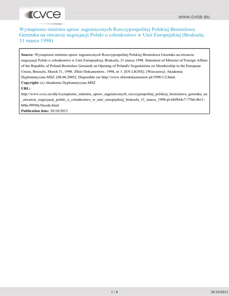 Wystapienie ministra spraw zagranicznych Rzeczypospolitej Polskiej Bronislawa Geremka na otwarcie negocjacji Polski o czlonkostwo w Unii Europejskiej (Bruksela, 31 marca 1998) Source: Wystapienie ministra spraw zagranicznych Rzeczypospolitej Polskiej Bronislawa Geremka na otwarcie negocjacji Polski o czlonkostwo w Unii Europejskiej, Bruksela, 31 marca 1998. Statement of Minister of Foreign Affairs of the Republic of Poland Bronislaw Geremek on Opening of Poland's Negotiations on Membership in the European Union, Brussels, March 31, 1998. Zbiór Dokumentów, 1998, nr 1. [EN LIGNE]. [Warszawa]: Akademia Dyplomatyczna MSZ, [08.06.2005]. Disponible sur http://www.zbiordokumentow.pl/1998/1/2.html. Copyright: (c) Akademia Dyplomatyczna MSZ URL: http://www.cvce.eu/obj/wystapienie_ministra_spraw_zagranicznych_rzeczypospolitej_polskiej_bronislawa_geremka_na _otwarcie_negocjacji_polski_o_czlonkostwo_w_unii_europejskiej_bruksela_31_marca_1998-pl-6bf844c7-770d-4b11b0fa-f9950c56eede.html Publication date: 20/10/2012 1/8 20/10/2012 Wystąpienie ministra spraw zagranicznych Rzeczypospolitej Polskiej Bronisława Geremka na otwarcie negocjacji Polski o członkostwo w Unii Europejskiej (Bruksela, 31 marca 1998) Część I Rząd Rzeczypospolitej Polskiej z ogromnym zadowoleniem powitał decyzję Rady Europejskiej w Luksemburgu o zaproszeniu Polski do negocjacji o członkostwo w Unii Europejskiej. Rozpoczynające się dziś negocjacje są momentem o znaczeniu historycznym, otwierają bowiem decydującą fazę procesu prowadzącego do ostatecznej eliminacji skutków podziałów w Europie. Polska przystępuje do negocjacji z przekonaniem, że członkostwo w Unii Europejskiej jest najkorzystniejszym wyborem z punktu widzenia bezpieczeństwa państwa, stabilności demokratycznego porządku, utrwalania podstaw szybkiego i zrównoważonego rozwoju gospodarczego i budowania nowoczesnego społeczeństwa obywatelskiego. Wyboru tego dokonujemy jako państwo w pełni suwerenne, w oparciu o jednomyślność sił politycznych i szeroką akceptację społeczeństwa polskiego i będąc przekonani, że przyjęcie Polski do Unii leży w ogólnym interesie europejskim. Zaproszenie Polski do negocjacji członkowskich było wynikiem konsekwentnych działań kolejnych rządów i wysiłków całego społeczeństwa polskiego. W ciągu 9 lat Polska przeobraziła się z kraju rządzonego w sposób niedemokratyczny i znajdującego się w głębokim kryzysie ekonomicznym w państwo oparte na rządach prawa, którego wzrost gospodarczy należy do najwyższych w Europie. Członkostwo w Unii Europejskiej będzie sprzyjać umacnianiu reform realizowanych od przełomu 1989 roku. Perspektywa bliskiej integracji z Unią Europejską przyspieszy zakończenie procesu transformacji. Sprawi to, że Polska wejdzie w XXI wiek jako państwo nowoczesne i zdolne konkurować na światowych rynkach. Członkostwo w Unii oznaczać będzie świadome podjęcie przez Polskę współodpowiedzialności za kształtowanie polityki europejskiej i światowej w większym wymiarze i w skuteczniejszy niż dotąd sposób. Dzięki temu Polska będzie mogła skuteczniej wpływać na stabilizację w regionie i promować zasady dobrego sąsiedztwa i współpracy w Europie i na świecie. Członkostwo w Unii Europejskiej jest dla Polski szansą i wyzwaniem. Zdajemy sobie sprawę z ogromu czekających nas zadań. Jesteśmy zarazem przekonani, że wyzwaniu temu zdołamy sprostać. Warunkiem efektywnego udziału Polski w integracji europejskiej jest zakończenie procesu reform. Dlatego Rząd Rzeczypospolitej Polskiej będzie kontynuował działania dostosowawcze, realizując politykę restrukturyzacji, modernizacji, reprywatyzacji i prywatyzacji, przeprowadzi reformę służby zdrowia i systemu ubezpieczeń społecznych oraz reformę administracyjną. Polska w pełni podziela wartości, będące fundamentem jedności Unii Europejskiej. Wierzymy, że demokratyczny system rządów, poszanowanie praw człowieka, społeczeństwo zbudowane na zasadach otwartości i pluralizmu oraz wolny rynek są najlepszą formą organizacji społeczeństwa. Dzielimy z Unią Europejską zarówno wartości oparte na wspólnym fundamencie dziedzictwa chrześcijańskiego jak i przekonanie, że u podstaw integracji europejskiej leżą zasady równości, solidarności i pomocniczości. Celem Unii Europejskiej zawsze było zwiększenie szans rozwoju poszczególnych państw członkowskich, regionów i grup społecznych. Z uwagą obserwujemy rosnące w praktyce Unii Europejskiej znaczenie zasady pomocniczości. Gwarantuje ona poszanowanie suwerenności narodowej, zapewnia realizację kompetencji kompetencje władz regionalnych i lokalnych oraz stwarza możliwości aktywnego udziału społeczności lokalnych w życiu społeczno-gospodarczym państw Unii. Łączy się ona w naszym rozumieniu z dążeniem do większej przejrzystości i demokratyzacji Unii Europejskiej, które powinny być czynnikami zachęcającymi obywateli do aktywnego udziału w integracji europejskiej. Polska pragnie wnieść swój wkład do współpracy kulturalnej. Stoimy na stanowisku, że zachowanie tożsamości i różnorodności kultury europejskiej powinno być jednym z zadań realizowanych w ramach Unii Europejskiej. Uważamy też, że integracja europejska otwiera szanse dla lepszego poznania się naszych 2/8 20/10/2012 narodów i przezwyciężeniapoprzez postawę dialogu dziedzictwa sztucznych podziałów politycznych. Polska będzie aktywnie uczestniczyć we wszystkich inicjatywach służących temu celowi. Polska podziela w pełni cele i zasady integracji europejskiej, które pół wieku temu zostały sformułowane w traktatach europejskich. Pragniemy też realizować te cele, które pojawiły się w trakcie procesu pogłębiania integracji europejskiej. Najważniejszymi krokami na tej drodze był Jednolity Akt Europejski, Traktat z Maastricht i Traktat z Amsterdamu. Będziemy gotowi do wypełnienia wynikających z nich zobo