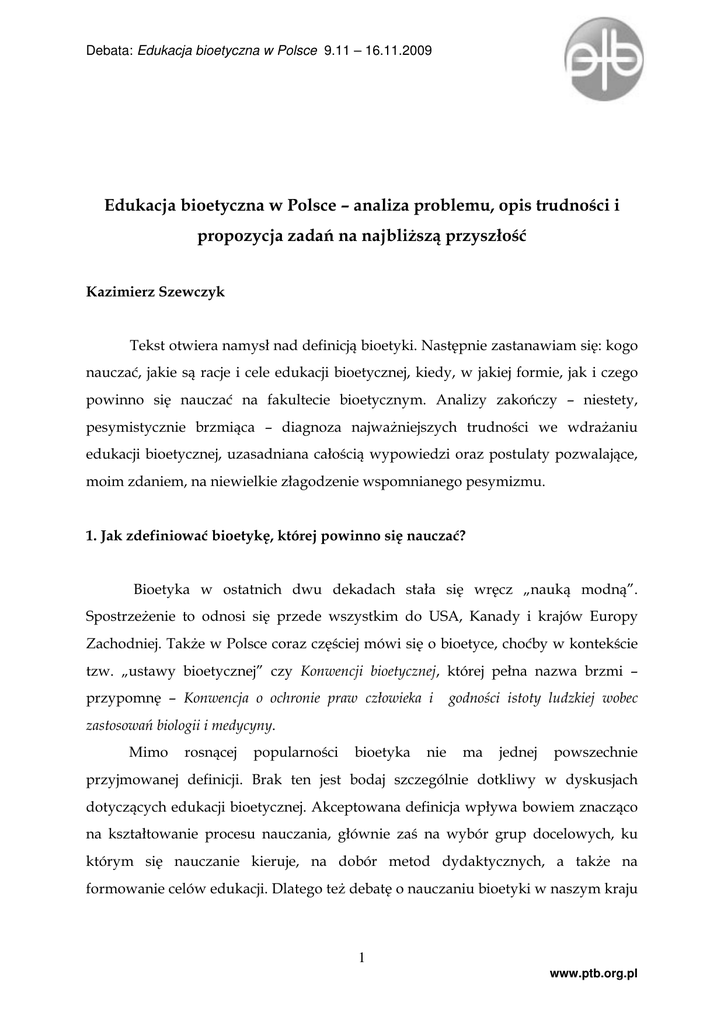 Edukacja bioetyczna w Polsce - Polskie Towarzystwo Bioetyczne