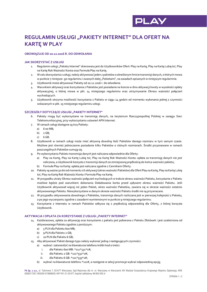 REGULAMIN USŁUGI „PAKIETY INTERNET” DLA OFERT NA KARTĘ W PLAY OBOWIĄZUJE OD 20.12.2016 R. DO ODWOŁANIA JAK SKORZYSTAĆ Z USŁUGI 1. 2. 3. 4. 5. Regulamin usługi „Pakiety Internet” skierowany jest do Użytkowników Ofert: Play na Kartę, Play na Kartę Lubię to!, Play na Kartę Rok Ważności Konta oraz Formuła Play na Kartę. W celu skorzystania z usługi, należy aktywować jeden z pakietów o określonym limicie transmisji danych, o których mowa w punkcie 7 niniejsze- go regulaminu i zwanych dalej „Pakietami”, na zasadach opisanych w niniejszym regulaminie. Użytkownik może aktywować Pakiety od 20.12.2016 r. do odwołania. Warunkiem aktywacji oraz korzystania z Pakietów jest posiadanie na koncie w dniu aktywacji kwoty w wysokości opłaty aktywacyjnej, o której mowa w pkt. 14 niniejszego regulaminu oraz utrzymywanie Okresu ważności połączeń wychodzących. Użytkownik otrzyma możliwość korzystania z Pakietu w ciągu 24 godzin od momentu wykonania jednej z czynności wskazanych w pkt. 15 niniejszego regulaminu usługi. SZCZEGÓŁY DOTYCZĄCE USŁUGI „PAKIETY INTERNET” 6. 7. 8. 9. 10. 11. 12. 13. Pakiety mogą być wykorzystane na transmisję danych, na terytorium Rzeczypospolitej Polskiej w zasięgu Sieci Telekomunikacyjnej, przy wykorzystaniu ustawień APN Internet. W ramach usługi dostępne są trzy Pakiety: a) 6 00 MB; b) 2 GB; c) 6 GB. Użytkownik w ramach usługi może mieć aktywną dowolną ilość Pakietów danego rozmiaru w tym samym czasie. Możliwe jest również jednoczesne posiadanie kilku Pakietów o różnych rozmiarach. Środki przyznawane w ramach poszczególnych Pakietów sumują się. Po wykorzystaniu Pakietu transmisja danych jest naliczana odpowiednio dla Oferty: a) Play na Kartę, Play na Kartę Lubię to!, Play na Kartę Rok Ważności Konta: opłata za transmisję danych nie jest naliczana, a Użytkownik korzysta z transmisji danych ze zmniejszoną prędkością do końca ważności pakietu; b) Formuła Play na Kartę: opłata jest naliczana zgodnie z Cennikiem Oferty. Pakiety są ważne 30 dni od momentu ich aktywacji (okres ważności Pakietów) dla Ofert Play na Kartę, Play na Kartę Lubię to!, Play na Kartę Rok Ważności Konta i Formuła Play na Kartę. W przypadku utraty Okresu ważności połączeń wychodzących w trakcie okresu ważności Pakietu, korzystanie z Pakietu możliwe będzie pod warunkiem dokonania Doładowania konta przed upływem okresu ważności Pakietu. Jeśli Użytkownik aktywował więcej niż jeden Pakiet, okres ważności Pakietów, zawiera się w okresie ważności ostatnio aktywowanego Pakietu. Niewykorzystane w danym okresie ważności Pakietu środki nie są przywracane. W przypadku aktywowania dowolnego z Pakietów, transmisja danych rozliczana jest w pierwszej kolejności z Pakietu, a po jego wyczerpaniu zgodnie z zasadami wymienionymi w punkcie 9 niniejszego regulaminu. Korzystanie z Internetu w ramach Pakietów odbywa się z prędkością odpowiednią dla Oferty, z której korzysta Użytkownik. AKTYWACJA I OPŁATA ZA KORZYSTANIE Z USŁUGI „PAKIETY INTERNET” 14. Każdorazowo, opłata za aktywację oraz korzystanie z pakietu jest pobierana z Pakietu Złotówek i jest uzależniona od aktywowanego Pakietu zgodnie z poniższym: a) 5 PLN dla Pakietu 600 MB; b) 9 PLN dla Pakietu 2 GB; c) 20 PLN dla Pakietu 6 GB; 15. Aby aktywować Pakiet danego typu należy wykonać jedną z następujących czynności: a) wybrać i zatwierdzić na klawiaturze telefonu krótki kod o treści: i. dla Pakietu 600 MB: *111*531*1#; ii. dla Pakietu 2 GB: *111*532*1#; iii. dla Pakietu 6 GB: *111*533*1#; b) wybrać na klawiaturze telefonu *111#, a następnie w sekcji promocje wybrać odpowiednią opcję; P4 Sp. z o.o., ul. Taśmowa 7, 02-677 Warszawa, Sąd Rejonowy dla m. st. Warszawy w Warszawie XIII Wydział Gospodarczy Krajowego Rejestru Sądowego, KRS 0000217207, REGON 015808609, NIP 951-21-20-077, kapitał zakładowy 48 856 500 zł STRONA 1 Z 2 c) Wysłać SMS pod numer 111, o treści: „START.531” dla Pakietu 600 MB; „START.532” dla Pakietu 2 GB; „START.533” dla Pakietu 6 GB; d) wejść do serwisu Play24 na stronie https://www.24.play.pl i następnie wybrać odpowiednią opcję w zakładce usługi. 16. Liczbę jednostek pozostałych do wykorzystania na transmisję danych można każdorazowo sprawdzić wybierając i zatwierdzając na klawiaturze telefonu krótki kod *108# dla Ofert (Play na Kartę, Play na Kartę Rok Ważności Konta, Formuła Play na Kartę) lub krótki kod *107# (dla Oferty Play na Kartę Lubię to!). 17. wyczerpaniu środków z Pakietu/Pakietów Użytkownik zostanie powiadomiony za pośrednictwem wiadomości. 18. Skorzystanie z niniejszej usługi nie wyklucza korzystania z innych Ofert Promocyjnych dostępnych łącznie z Ofertą, z której korzysta Użytkownik, chyba że warunki innych Ofert Promocyjnych stanowią inaczej. i. ii. iii. POSTANOWIENIA KOŃCOWE 19. Operator zastrzega sobie prawo do odwołania niniejszego regulaminu w każdym czasie bez podawania przyczyny, z zastrzeżeniem, że odwołanie nie wpływa na prawa i obowiązki uprzednio nabyte przez Użytkownika, co oznacza, że Użytkownik może korzystać ze środków przyznanych przed odwołaniem do końca okresu ich ważności, ale nie będzie miał możliwości aktywowania Pakietów na nowo. Informacja o odwołaniu usługi zostanie opublikowana na stronie internetowej www.play.pl lub w inny sposób podana do wiadomości publicznej. 20. Wszelkie wyrazy lub wyrażenia pisane w treści niniejszego regulaminu dużą literą, ale nie zdefiniowane w niniejszym regulaminie, należy rozumieć zgodnie z ich definicją zawartą odpowiednio w Regulaminie świadczenia Usług Telekomunikacyjnych przez P4 sp. z o.o. dla Użytkowników lub Cenniku Oferty, z której korzysta Użytkownik. 21. W sprawach nieuregulowanych treścią niniejszego regulaminu stosuje się odpowiednio postanowienia dokumentów wskazanych w pkt. 22 powyżej. 2