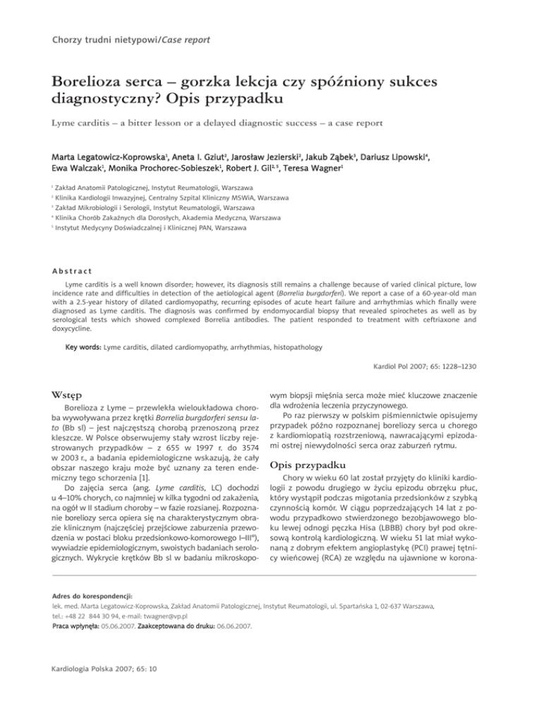 Chorzy trudni nietypowi/Case report Borelioza serca – gorzka lekcja czy spóźniony sukces diagnostyczny? Opis przypadku Lyme carditis – a bitter lesson or a delayed diagnostic success – a case report Marta Legatowicz-Koprowska1, Aneta I. Gziut2, Jarosław Jezierski2, Jakub Ząbek3, Dariusz Lipowski4, Ewa Walczak1, Monika Prochorec-Sobieszek1, Robert J. Gil2, 5, Teresa Wagner1 Zakład Anatomii Patologicznej, Instytut Reumatologii, Warszawa Klinika Kardiologii Inwazyjnej, Centralny Szpital Kliniczny MSWiA, Warszawa 3 Zakład Mikrobiologii i Serologii, Instytut Reumatologii, Warszawa 4 Klinika Chorób Zakaźnych dla Dorosłych, Akademia Medyczna, Warszawa 5 Instytut Medycyny Doświadczalnej i Klinicznej PAN, Warszawa 1 2 Abstract Lyme carditis is a well known disorder; however, its diagnosis still remains a challenge because of varied clinical picture, low incidence rate and difficulties in detection of the aetiological agent (Borrelia burgdorferi). We report a case of a 60-year-old man with a 2.5-year history of dilated cardiomyopathy, recurring episodes of acute heart failure and arrhythmias which finally were diagnosed as Lyme carditis. The diagnosis was confirmed by endomyocardial biopsy that revealed spirochetes as well as by serological tests which showed complexed Borrelia antibodies. The patient responded to treatment with ceftriaxone and doxycycline. Key words: Lyme carditis, dilated cardiomyopathy, arrhythmias, histopathology Kardiol Pol 2007; 65: 1228–1230 Wstęp Borelioza z Lyme – przewlekła wieloukładowa choroba wywoływana przez krętki Borrelia burgdorferi sensu lato (Bb sl) – jest najczęstszą chorobą przenoszoną przez kleszcze. W Polsce obserwujemy stały wzrost liczby rejestrowanych przypadków – z 655 w 1997 r. do 3574 w 2003 r., a badania epidemiologiczne wskazują, że cały obszar naszego kraju może być uznany za teren endemiczny tego schorzenia [1]. Do zajęcia serca (ang. Lyme carditis, LC) dochodzi u 4–10% chorych, co najmniej w kilka tygodni od zakażenia, na ogół w II stadium choroby – w fazie rozsianej. Rozpoznanie boreliozy serca opiera się na charakterystycznym obrazie klinicznym (najczęściej przejściowe zaburzenia przewodzenia w postaci bloku przedsionkowo-komorowego I–III°), wywiadzie epidemiologicznym, swoistych badaniach serologicznych. Wykrycie krętków Bb sl w badaniu mikroskopo- wym biopsji mięśnia serca może mieć kluczowe znaczenie dla wdrożenia leczenia przyczynowego. Po raz pierwszy w polskim piśmiennictwie opisujemy przypadek późno rozpoznanej boreliozy serca u chorego z kardiomiopatią rozstrzeniową, nawracającymi epizodami ostrej niewydolności serca oraz zaburzeń rytmu. Opis przypadku Chory w wieku 60 lat został przyjęty do kliniki kardiologii z powodu drugiego w życiu epizodu obrzęku płuc, który wystąpił podczas migotania przedsionków z szybką czynnością komór. W ciągu poprzedzających 14 lat z powodu przypadkowo stwierdzonego bezobjawowego bloku lewej odnogi pęczka Hisa (LBBB) chory był pod okresową kontrolą kardiologiczną. W wieku 51 lat miał wykonaną z dobrym efektem angioplastykę (PCI) prawej tętnicy wieńcowej (RCA) ze względu na ujawnione w korona- Adres do korespondencji: lek. med. Marta Legatowicz-Koprowska, Zakład Anatomii Patologicznej, Instytut Reumatologii, ul. Spartańska 1, 02-637 Warszawa, tel.: +48 22 844 30 94, e-mail: [email protected] Praca wpłynęła: 05.06.2007. Zaakceptowana do druku: 06.06.2007. Kardiologia Polska 2007; 65: 10 Borelioza serca – gorzka lekcja czy spóźniony sukces diagnostyczny? Opis przypadku rografii zwężenie. Przez kolejne 6 lat po rewaskularyzacji chory nie odczuwał żadnych dolegliwości ze strony serca. Pierwszy obrzęk płuc wystąpił w 57. roku życia. W EKG ujawniono migotanie przedsionków, LBBB oraz cechy niedokrwienia ściany dolnej. Stwierdzono podwyższony poziom markerów zapalnych i martwicy mięśnia sercowego. Koronarografia wykazała ciasne zwężenie poniżej implantowanego stentu w RCA, wykonano angioplastykę balonową i odtworzono światło naczynia. W badaniu echokardiograficznym stwierdzono powiększenie wymiarów lewej komory (LV) (63/69 mm) i lewego przedsionka (50 mm) oraz zaburzenia kurczliwości LV z frakcją wyrzutową (LVEF) 35%. Ponieważ nasilenie zmian miażdżycowych w tętnicach wieńcowych nie było adekwatne do stopnia uszkodzenia LV, wykonano biopsję mięśnia sercowego. W barwieniu H&E uwidoczniono niewielkiego stopnia ogniskowe uszkodzenie kardiomiocytów i włóknienie z towarzyszącymi komórkami tucznymi. Liczba limfocytów T (CD3+) i granulocytów (łącznie <7/mm2) nie dawała podstaw do rozpoznania zapalenia mięśnia serca wg klasyfikacji z Dallas. W trakcie hospitalizacji ustalono farmakoterapię: kwas acetylosalicylowy, tienopirydyna, ramipryl, statyna, spironolakton oraz beta-bloker. W 2007 r. chorego, w stanie ciężkim, ponownie przyjęto do tutejszej kliniki kardiologii z objawami obrzęku płuc i podwyższonym poziomem markerów martwicy mięśnia sercowego. Koronarografia wykazała dobry efekt dotychczasowych zabiegów PCI i nie ujawniła istotnych zmian miażdżycowych w pozostałych tętnicach wieńcowych. W monitorowanym EKG stwierdzono migotanie przedsionków z czynnością komór ok. 150/min, LBBB oraz wstawki nieutrwalonego częstoskurczu komorowego (nsVT), a po umiarowieniu amiodaronem poszerzenie zespołów QRS. Obraz echokardiograficzny ujawnił dalsze powiększanie wymiarów LV (66/73 mm) i lewego przedsionka (53 mm) oraz uogólnione zaburzenia kurczliwości z LVEF 25%. W badaniu metodą Holtera stwierdzono prawie 2000 pobudzeń dodatkowych komorowych (167 par). W kolejnej kardiobiopsji obserwowano nadal ogniskową miocytolizę, większe niż w poprzednim badaniu włóknienie (Rycina 1.), a także zwężenie światła naczyń krwionośnych spowodowane pogrubieniem ścian. W barwieniach immunohistochemicznych zidentyfikowano komórki zapalne: limfocyty T (CD3+) >7