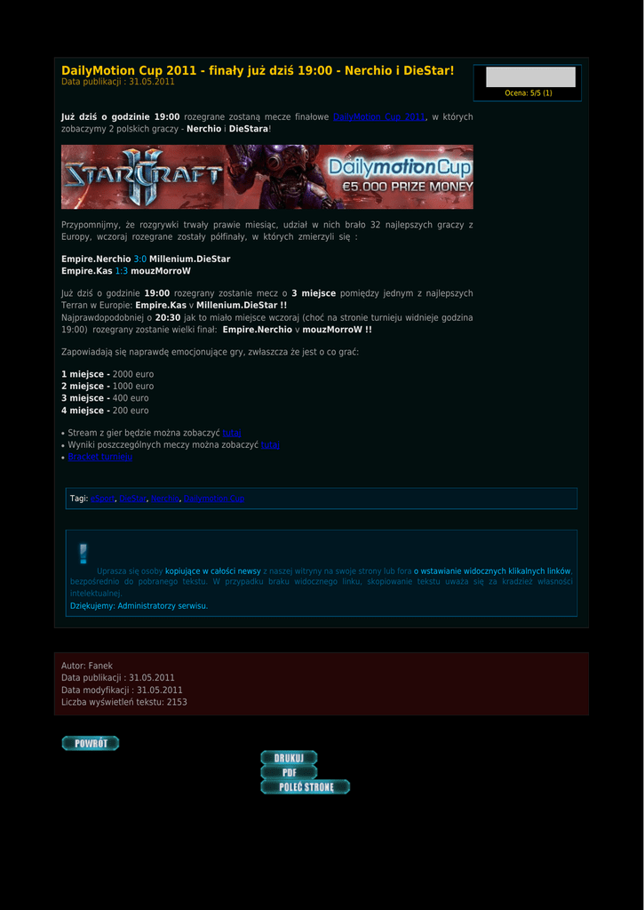 DailyMotion Cup 2011 - finały już dziś 19:00 - Nerchio i DieStar! Data publikacji : 31.05.2011 Ocena: 5/5 (1) Już dziś o godzinie 19:00 rozegrane zostaną mecze finałowe DailyMotion Cup 2011, w których zobaczymy 2 polskich graczy - Nerchio i DieStara! Przypomnijmy, że rozgrywki trwały prawie miesiąc, udział w nich brało 32 najlepszych graczy z Europy, wczoraj rozegrane zostały półfinały, w których zmierzyli się : Empire.Nerchio 3:0 Millenium.DieStar Empire.Kas 1:3 mouzMorroW Już dziś o godzinie 19:00 rozegrany zostanie mecz o 3 miejsce pomiędzy jednym z najlepszych Terran w Europie: Empire.Kas v Millenium.DieStar !! Najprawdopodobniej o 20:30 jak to miało miejsce wczoraj (choć na stronie turnieju widnieje godzina 19:00) rozegrany zostanie wielki finał: Empire.Nerchio v mouzMorroW !! Zapowiadają się naprawdę emocjonujące gry, zwłaszcza że jest o co grać: 1 2 3 4 ● ● ● miejsce miejsce miejsce miejsce - 2000 euro - 1000 euro - 400 euro - 200 euro Stream z gier będzie można zobaczyć tutaj Wyniki poszczególnych meczy można zobaczyć tutaj Bracket turnieju Tagi: eSport, DieStar, Nerchio, Dailymotion Cup Uprasza się osoby kopiujące w całości newsy z naszej witryny na swoje strony lub fora o wstawianie widocznych klikalnych linków, bezpośrednio do pobranego tekstu. W przypadku braku widocznego linku, skopiowanie tekstu uważa się za kradzież własności intelektualnej. Dziękujemy: Administratorzy serwisu. Autor: Fanek Data publikacji : 31.05.2011 Data modyfikacji : 31.05.2011 Liczba wyświetleń tekstu: 2153 Komentarz (12) dodaj komentarz Sory ale chyba mały fail z waszej strony finał odbył się wczoraj pisali o tym na TL komentował TotalBiscut i SOPILER !! wygrał Nerchio 3:0 po mega zaciętych grach ;]~Megidon 2011/05/31 15:43 wczoraj był półfinał, Nerchio 3:0 Diestar.~Fanek 2011/05/31 15:48 Gdzieś można zobaczyć restream?~Wael 2011/05/31 18:26 !!! Diestar vs Kas odwołane bo Kas nie może - przełożone na czwartek !!! Diestar napisał NiepoWiem gdzie :P~Sickstee 2011/05/31 19:25 @sicktee: NW?? :D~Arct 2011/05/31 19:39 live zaraz ruszają kogo obstawiacie ? ;) Morrow zdaje sei siedzi cały czas w pro house wiec może być ciężko.~Fanek 2011/05/31 20:39 ale nerchio z nim pojechał.... :)~borek87 2011/05/31 21:23 4-0 jak dziecko go zrobił ;d~Fanek 2011/05/31 21:25 brawo Nerchio! Całkiem przyjemna kaska zgarnięta :)~Vaxar 2011/05/31 21:28 pocisnal z calym pro hausem hihi~kug 2011/05/31 21:41 stream nie dziala~IgnisSolus 2011/05/31 21:42 jakiś link ma ktos gdzie mozna obczaic final? :)~Tbo 2011/06/01 14:08 dodaj komentarz 08.10.2015 Kampania "Szepty o zagładzie" dostępna za darmo (0 komentarzy) 27.09.2015 Kolejni bohaterowie w trybie Sprzymierzonych Dowódców (0 komentarzy) 22.09.2015 Cyfrowe gadżety za udział w BlizzCon 2015 (0 komentarzy) 15.07.2015 Legacy of the Void dostępne w przedsprzedaży! (0 komentarzy) 17.06.2015 Informacje z E3 - prolog kampanii Legacy of the Void (0 komentarzy) 30.05.2015 WCS Europe - sobota (30 maja) 18.00 grupa G - MaNa! (0 komentarzy) 07.05.2015 DreamHack Open France 2015 - już 8 maja - MaNa! (0 komentarzy) 03.05.2015 Na wesoło: postacie E-sportu 50 (0 komentarzy) 03.05.2015 IEM Katowice 2015 - jeszcze raz! (0 komentarzy) 03.05.2015 KeSPA Cup 2015 Season 1 - live! (0 komentarzy) 26.04.2015 Proleague - Top5 gier miesiąca (0 komentarzy) 26.04.2015 CJ Entus wygrywa 2 runde Proleague! (0 komentarzy) 18.04.2015 Wersja beta Legacy of the Void – aktualizacja 2.5.1 (0 komentarzy) 18.04.2015 WCS finals 2015 - galeria (0 komentarzy) 18.04.2015 Omówienie zmian w balansie Legacy of the Void (0 komentarzy) 11.04.2015 WCS Europe kwalifikacje z Polakami - dziś (sobota) 18.00 (0 komentarzy) 11.04.2015 Aktualizacja balansu Heart of the Swarm – 9 kwietnia (0 komentarzy) 11.04.2015 GSL Season1 2015 - galeria (0 komentarzy) 11.04.2015 Zbanowane konta w StarCraft II (0 komentarzy) 04.04.2015 Red Bull Battle Grounds powraca jesienią 2015 (0 komentarzy) (zobacz wszystkie)