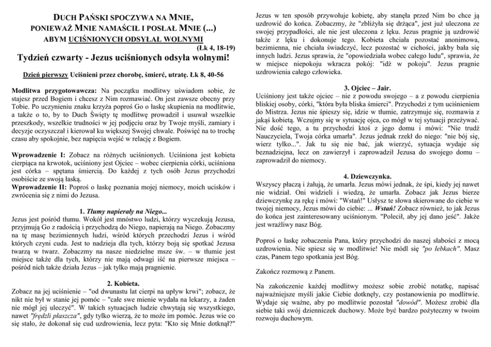 DUCH PAŃSKI SPOCZYWA NA MNIE, PONIEWAŻ MNIE NAMAŚCIŁ I POSŁAŁ MNIE (...) ABYM UCIŚNIONYCH ODSYŁAŁ WOLNYMI (Łk 4, 18-19) Tydzień czwarty - Jezus uciśnionych odsyła wolnymi! Dzień pierwszy Uciśnieni przez chorobę, śmierć, utratę. Łk 8, 40-56 Modlitwa przygotowawcza: Na początku modlitwy uświadom sobie, że stajesz przed Bogiem i chcesz z Nim rozmawiać. On jest zawsze obecny przy Tobie. Po uczynieniu znaku krzyża poproś Go o łaskę skupienia na modlitwie, a także o to, by to Duch Święty tę modlitwę prowadził i usuwał wszelkie przeszkody, wszelkie trudności w jej podjęciu oraz by Twoje myśli, zamiary i decyzje oczyszczał i kierował ku większej Swojej chwale. Poświęć na to trochę czasu aby spokojnie, bez napięcia wejść w relację z Bogiem. Wprowadzenie I: Zobacz na różnych uciśnionych. Uciśniona jest kobieta cierpiąca na krwotok, uciśniony jest Ojciec – wobec cierpienia córki, uciśniona jest córka – spętana śmiercią. Do każdej z tych osób Jezus przychodzi osobiście ze swoją łaską. Wprowadzenie II: Poproś o łaskę poznania mojej niemocy, moich ucisków i zwrócenia się z nimi do Jezusa. 1. Tłumy napierały na Niego... Jezus jest pośród tłumu. Wokół jest mnóstwo ludzi, którzy wyczekują Jezusa, przyjmują Go z radością i przychodzą do Niego, napierają na Niego. Zobaczmy na tę masę bezimiennych ludzi, wśród których przechodzi Jezus i wśród których czyni cuda. Jest to nadzieja dla tych, którzy boją się spotkać Jezusa twarzą w twarz. Zobaczmy na nasze niedzielne msze św. – w tłumie jest miejsce także dla tych, którzy nie mają odwagi iść na pierwsze miejsca – pośród nich także działa Jezus – jak tylko mają pragnienie. 2. Kobieta. Zobacz na jej uciśnienie – "od dwunastu lat cierpi na upływ krwi"; zobacz, że nikt nie był w stanie jej pomóc – "całe swe mienie wydała na lekarzy, a żaden nie mógł jej uleczyć". W takich sytuacjach ludzie chwytają się wszystkiego, nawet "frędzli płaszcza", gdy tylko wierzą, że to może im pomóc. Jezus wie co się stało, że dokonał się cud uzdrowienia, lecz pyta: "Kto się Mnie dotknął?" Jezus w ten sposób przywołuje kobietę, aby stanęła przed Nim bo chce ją uzdrowić do końca. Zobaczmy, że "zbliżyła się drżąca", jest już uleczona ze swojej przypadłości, ale nie jest uleczona z lęku. Jezus pragnie ją uzdrowić także z lęku i dokonuje tego. Kobieta chciała pozostać anonimowa, bezimienna, nie chciała świadczyć, lecz pozostać w cichości, jakby bała się innych ludzi. Jezus sprawia, że "opowiedziała wobec całego ludu", sprawia, że w miejsce niepokoju wkracza pokój: "idź w pokoju". Jezus pragnie uzdrowienia całego człowieka. 3. Ojciec – Jair. Uciśniony jest także ojciec – nie z powodu swojego – a z powodu cierpienia bliskiej osoby, córki, "która była bliska śmierci". Przychodzi z tym uciśnieniem do Mistrza. Jezus nie śpieszy się, idzie w tłumie, zatrzymuje się, rozmawia z jakąś kobietą. Wczujmy się w sytuację ojca, co mógł w tej sytuacji przeżywać. Nie dość tego, a tu przychodzi ktoś z jego domu i mówi: "Nie trudź Nauczyciela, Twoja córka umarła". Jezus jednak rzekł do niego: "nie bój się, wierz tylko...". Jak tu się nie bać, jak wierzyć, sytuacja wydaje się beznadziejna, lecz on zawierzył i zaprowadził Jezusa do swojego domu – zaprowadził do niemocy. 4. Dziewczynka. Wszyscy płaczą i żałują, że umarła. Jezus mówi jednak, że śpi, kiedy jej nawet nie widział. Oni widzieli i wiedzą, że umarła. Zobacz jak Jezus bierze dziewczynkę za rękę i mówi: "Wstań!" Usłysz te słowa skierowane do ciebie w twojej niemocy, Jezus mówi do ciebie: ... Wstań! Zobacz również, to jak Jezus do końca jest zainteresowany uciśnionym. "Polecił, aby jej dano jeść". Jakże jest wrażliwy nasz Bóg. Poproś o łaskę zobaczenia Pana, który przychodzi do naszej słabości z mocą uzdrowienia. Nie spiesz się w modlitwie! Nie módl się "po łebkach". Masz czas, Panem tego spotkania jest Bóg. Zakończ rozmową z Panem. Na zakończenie każdej modlitwy możesz sobie zrobić notatkę, napisać najważniejsze myśli jakie Ciebie dotknęły, czy postanowienia po modlitwie. Wydaje się ważne, aby po modlitwie pozostał "dowód". Możesz zrobić dla siebie taki swój dzienniczek duchowy. Może być bardzo pożyteczny w twoim rozwoju duchowym. Dzień drugi - UZDROWIENIE PARALITYKA. ŁK 5, 17-26 Modlitwa przygotowawcza: jak w pierwszym dniu. Wprowadzenie I: Zobacz scenę ewangeliczną: Jezus, który naucza, przemawia z mocą i ma moc by uzdrawiać. Wprowadzenie II: Poproś Go o łaskę zobaczenia swojego paraliżu – także paraliżu duchowego. 1. Nie mogąc z powodu tłumu... Zobacz wielki tłum wokół Jezusa tak wielki, że nie można się do Niego przedostać. Trzeba pokonać jakieś przeciwności – trud. Podobnie nieraz jest z naszym życiem modlitwy – ciężko przedostać się do Jezusa przez trud codziennych trosk, obowiązków, nawału spraw, ale On wtedy właśnie jest nam najbardziej potrzebny. 2. Paralityk. Człowiekowi przykutemu do łoża – paralitykowi tym trudniej jest dostać się do Jezusa. Wydaje się, że jest to niemożliwe bez pomocy innych ludzi. Pochylmy się chwilę nad człowiekiem sparaliżowanym. Zobaczmy, że jest on sparaliżowany nie tylko fizycznie, ale także duchowo. Sam nie jest on zdolnym do wyrażenia prośby przed Jezusem; grzech paraliżuje jego wiarę. 3. Jezus widząc ich wiarę... Jezus dokonuje cudu nie ze względu na wiarę paralityka, lecz ze względu na tych, którzy go do Niego przynoszą. "Widząc ich wiarę rzekł..." Zastanów się i podziękuj za tych, którzy Ciebie przynosili do Jezusa w czasie Twojej niemocy. A może ty byłeś (jesteś) tym, kto niesie innych do Jezusa? Rozejrzyj się dookoła może kogoś z Twoich bliskich trzeba "zanieść do Jezusa"? 4. Odpuszczają ci się twoje grzechy. Działanie Jezusa