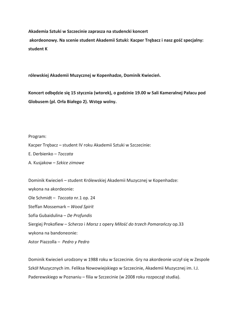 Akademia Sztuki w Szczecinie zaprasza na studencki koncert akordeonowy. Na scenie student Akademii Sztuki: Kacper Trębacz i nasz gość specjalny: student K rólewskiej Akademii Muzycznej w Kopenhadze, Dominik Kwiecień. Koncert odbędzie się 15 stycznia (wtorek), o godzinie 19.00 w Sali Kameralnej Pałacu pod Globusem (pl. Orła Białego 2). Wstęp wolny. Program: Kacper Trębacz – student IV roku Akademii Sztuki w Szczecinie: E. Derbienko – Toccata A. Kusjakow – Szkice zimowe Dominik Kwiecień – student Królewskiej Akademii Muzycznej w Kopenhadze: wykona na akordeonie: Ole Schmidt – Toccata nr.1 op. 24 Steffan Mossemark – Wood Spirit Sofia Gubaidulina – De Profundis Siergiej Prokofiew – Scherzo i Marsz z opery Miłość do trzech Pomarańczy op.33 wykona na bandoneonie: Astor Piazzolla – Pedro y Pedro Dominik Kwiecień urodzony w 1988 roku w Szczecinie. Gry na akordeonie uczył się w Zespole Szkół Muzycznych im. Feliksa Nowowiejskiego w Szczecinie, Akademii Muzycznej im. I.J. Paderewskiego w Poznaniu – filia w Szczecinie (w 2008 roku rozpoczął studia). Obecnie jest studentem Duńskiej Królewskiej Akademii Muzycznej w Kopenhadze w klasie akordeonu profesorów: Geira Draugsvolla i Andreasa Borregaard.