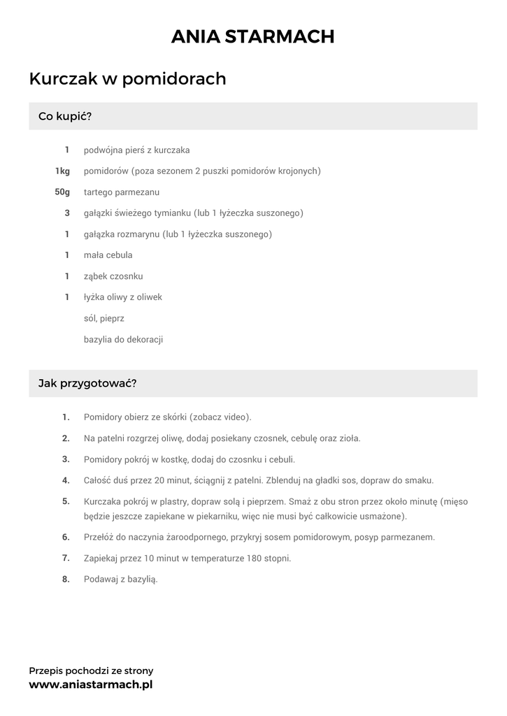 ANIA STARMACH Kurczak w pomidorach Co kupić? 1 podwójna pierś z kurczaka 1kg pomidorów (poza sezonem 2 puszki pomidorów krojonych) 50g tartego parmezanu 3 gałązki świeżego tymianku (lub 1 łyżeczka suszonego) 1 gałązka rozmarynu (lub 1 łyżeczka suszonego) 1 mała cebula 1 ząbek czosnku 1 łyżka oliwy z oliwek sól, pieprz bazylia do dekoracji Jak przygotować? 1. Pomidory obierz ze skórki (zobacz video). 2. Na patelni rozgrzej oliwę, dodaj posiekany czosnek, cebulę oraz zioła. 3. Pomidory pokrój w kostkę, dodaj do czosnku i cebuli. 4. Całość duś przez 20 minut, ściągnij z patelni. Zblenduj na gładki sos, dopraw do smaku. 5. Kurczaka pokrój w plastry, dopraw solą i pieprzem. Smaż z obu stron przez około minutę (mięso będzie jeszcze zapiekane w piekarniku, więc nie musi być całkowicie usmażone). 6. Przełóż do naczynia żaroodpornego, przykryj sosem pomidorowym, posyp parmezanem. 7. Zapiekaj przez 10 minut w temperaturze 180 stopni. 8. Podawaj z bazylią. Przepis pochodzi ze strony www.aniastarmach.pl