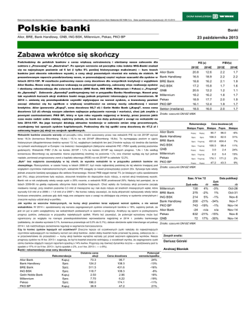 Rekomendacja dla klientów podlegających Regulaminowi świadczenia usług maklerskich przez Dom Maklerski BZ WBK S.A. Data opublikowania (dystrybucji): 25.10.2013 Polskie banki Banki Alior, BRE, Bank Handlowy, GNB, ING BSK, Millennium, Pekao, PKO BP 23 października 2013 Zabawa wkrótce się skończy Podchodzimy do polskich banków z coraz większą ostroŜnością i obniŜamy nasze zalecenie dla P/E (x) sektora z „PrzewaŜaj” na „Neutralne”. Po sporym wzroście od początku roku indeks WIG-Banki znalazł się na najwyŜszym poziomie od 6 lat (i tylko 9% poniŜej historycznego maksimum) — kurs trzech P/BV(x) 2013E 2014E 2013E 2014E banków jest obecnie rekordowo wysoki, a ceny akcji pozostałych równieŜ nie naleŜą do niskich. W Alior Bank 20.8 12.6 2.2 1.7 prezentowanym raporcie przedstawiamy nowe, w przewaŜającej części wyŜsze szacunki dla zysków w Bank Handlowy 16.5 18.9 2.2 2.2 latach 2013-15P. W rezultacie podnosimy nasze ceny docelowe dla wszystkich instytucji z wyjątkiem BRE Bank 18.8 16.2 2.1 1.9 Alior Banku. Nowe ceny docelowe wskazują na potencjał spadkowy, zalecamy więc realizację zysków ING BSK 17.2 15.8 1.7 1.6 GNB 20.5 12.2 1.2 1.1 tak wysokich kursach akcji niektóre banki mogą jednak przynieść interesujący zwrot inwestorom. W Millennium 18.2 16.2 1.8 1.7 2014 r. zmienią się prawdopodobnie czynniki wpływające na wzrost zysków, a inwestorzy powinni Pekao 18.9 17.7 2.0 1.9 zacząć skłaniać się ku spółkom o większej wraŜliwości na zmiany marŜy odsetkowej i wzrost PKO BP 16.1 12.4 1.9 1.7 kredytów. Alior (ponownie „Kupuj”, cena docelowa 90,7 zł) i Getin Noble Bank („Kupuj”, nowa cena Sektor (mediana) 18.5 16.0 2.0 1.7 i obniŜamy rekomendację dla czterech banków (BRE Bank, ING BSK, Millennium i Pekao) z „Trzymaj” do „Sprzedaj”. Zalecenie „Sprzedaj” podtrzymujemy teŜ w przypadku Banku Handlowego. Nawet przy docelowa 3,0 zł) oferują naszym zdaniem najlepsze połączenie rozwoju i wartości, choć jak zwykle z pewnymi zastrzeŜeniami. PKO BP, który w tym roku wypada najgorzej w branŜy, przez jeszcze jakiś Źródło: szacunki DM BZ WBK czas moŜe radzić sobie słabiej, sądzimy jednak, Ŝe bank ma duŜy potencjał z uwagi na wskaźniki na lata 2014-15P. Na jego korzyść działają aktualne tendencje w zakresie zmian stóp procentowych, Rekomendacja oczekujemy teŜ sporych zysków kapitałowych. Podnosimy dla tej spółki cenę docelową do 47,2 zł i zalecamy kupno jej akcji na sesjach spadkowych. Wskaźniki banków znacznie wzrosły od początku roku; średni szacowany przez nas wskaźnik P/E na rok 2013P wynosi teraz 18,3x (konsensus Bloomberg: 19,4x) i 15,1x na rok 2014P (Bloomberg: 16,6x). To wymagający poziom w ujęciu historycznym (długoterminowa średnia wynosi 13,1x), względnym (wskaźnik ten jest 2-krotnie wyŜszy niŜ średnia dla banków na rynkach wschodzących w Europie i na świecie) i bezwzględnym (faktyczne wskaźniki P/E i P/BV spadły poniŜej poziomów godziwych). Wskaźniki P/BV (1,9x na koniec 2013P i 1,7x na koniec 2014P wg naszych prognoz, 1,9x i 1,8x według konsensusu Bloomberg) są wprawdzie równe pięcioletniej średniej na poziomie 1,7x, one równieŜ wydają się być jednak napięte, poniewaŜ prognozowany zwrot z kapitału własnego (ROE) na rok 2014P to zaledwie 12,2%. „Byki” bez wątpienia zauwaŜyłyby w tej chwili, Ŝe wysokie wskaźniki to w przypadku polskich banków nic niezwykłego. Rzeczywiście, w czasie hossy w latach 2006-07, być moŜe najbardziej podobnej do tej właśnie trwającej pod względem czynników makroekonomicznych, wskaźniki P/E osiągały (a nawet przewyŜszały) poziom 20x. Sytuacja była wtedy Cena docelowa (zł) BieŜąca Poprz. BieŜąca Poprz. Alior Bank Bank Handlowy BRE Bank ING BSK GNB Millennium Pekao PKO BP BieŜąca Kupuj Kupuj 90.7 96.0 -6% Sprz. Sprz. 108.3 82.5 31% Sprz. Trzymaj 431.6 404.4 7% Sprz. Trzymaj 109.3 98.4 11% Kupuj 3.0 2.4 24% Sprz. Trzymaj 6.2 5.4 15% Sprz. Trzymaj 174.1 171.2 2% 47.2 43.3 9% Kupuj Kupuj Kupuj Źródło: szacunki DM BZ WBK jednak znacznie bardziej sprzyjająca dla sektora finansowego. Wzrost PKB sięgał niemal 7% (w bieŜącym cyklu spodziewane jest 3%), stopy procentowe były wyŜsze, stosunek kredytów do depozytów duŜo niŜszy, a wzrost akcji kredytowej wysoki. Szac. IV kw.’12 Banki rok w rok zwiększały wtedy swoje zyski o 20% rocznie, a wskaźnik ROE przekraczał 20%. NaleŜy teŜ pamiętać, Ŝe w latach 2006-08 na giełdę napływały olbrzymie ilości środków krajowych. Choć wpłaty do funduszy akcji ponownie zaczęły niedawno rosnąć, przy średnim poziomie 0,3 mld zł miesięcznie są i tak duŜo niŜsze od średnich miesięcznych wpłat, które wynosiły 0,9 mld zł w 2006 r. i 1,9 mld zł w 2007 r. Na koniec naleŜy zauwaŜyć, Ŝe duŜą aktywność wykazywały wtedy takŜe fundusze emerytalne, podczas gdy dziś mają one związane ręce z uwagi na zbliŜające się zmiany w systemie emerytalnym i znacznie wyŜszy udział akcji w portfelu. Jak wynika ze wzorców historycznych, na kursy akcji powinien teraz wpływać wzrost zysków, a nie wzrost wskaźników. W 2014 r. spodziewamy się wzrostu zagregowanych zysków omawianych banków o 18%, sądzimy jednak, Ŝe jest on juŜ w pełni uwzględniony we wskaźnikach podawanych w oparciu o prognozy. Analitycy są oporni w podwyŜszaniu prognoz zysków, zwłaszcza w przypadku największych spółek. Warto teŜ zauwaŜyć, Ŝe potencjał wzrostowy moŜe być ograniczony ze względu na rosnące prawdopodobieństwo wprowadzenia najpóźniej w 2014 r. podatku bankowego (zakładamy, Ŝe stawka wyniesie 0,1%, konsensus przewiduje od 0,0% do 0,1%), dalsze obniŜenie opłat interchange od połowy Źródło: szacunki DM BZ WBK 2014 r. lub nadchodzące zacieśnienie regulacji w segmencie bancassurance. Czy to koniec zysków lepszych od oczekiwań? Znaczne lepsze od oczekiwanych zyski naleŜały do najwaŜniejszych czynników wpływający