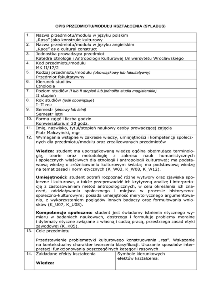 OPIS PRZEDMIOTU/MODUŁU KSZTAŁCENIA (SYLABUS) 1. Nazwa przedmiotu/modułu w języku polskim „Rasa” jako konstrukt kulturowy 2. Nazwa przedmiotu/modułu w języku angielskim „Race” as a cultural construct 3. Jednostka prowadząca przedmiot Katedra Etnologii i Antropologii Kulturowej Uniwersytetu Wrocławskiego 4. Kod przedmiotu/modułu MK II/17/2 5. Rodzaj przedmiotu/modułu (obowiązkowy lub fakultatywny) Przedmiot fakultatywny 6. Kierunek studiów Etnologia 7. Poziom studiów (I lub II stopień lub jednolite studia magisterskie) II stopień 8. Rok studiów (jeśli obowiązuje) I–II rok 9. Semestr (zimowy lub letni) Semestr letni 10. Forma zajęć i liczba godzin Konwersatorium 30 godz. 11. Imię, nazwisko, tytuł/stopień naukowy osoby prowadzącej zajęcia Piotr Małczyński, mgr 12. Wymagania wstępne w zakresie wiedzy, umiejętności i kompetencji społecznych dla przedmiotu/modułu oraz zrealizowanych przedmiotów Wiedza: student ma uporządkowaną wiedzę ogólną obejmującą terminologię, teorie oraz metodologię z zakresu nauk humanistycznych i społecznych właściwych dla etnologii i antropologii kulturowej; ma podstawową wiedzę o zróżnicowaniu kulturowym świata; ma podstawową wiedzę na temat zasad i norm etycznych (K_W03, K_W08, K_W12). Umiejętności: student potrafi rozpoznać różne wytwory oraz zjawiska społeczne i kulturowe, a także przeprowadzić ich krytyczną analizę i interpretację z zastosowaniem metod antropologicznych, w celu określenia ich znaczeń, oddziaływania społecznego i miejsca w procesie historycznospołeczno-kulturowym; posiada umiejętność merytorycznego argumentowania, z wykorzystaniem poglądów innych badaczy oraz formułowania wniosków (K_U07, K_U08). Kompetencje społeczne: student jest świadomy istnienia etycznego wymiaru w badaniach naukowych, dostrzega i formułuje problemy moralne i dylematy etyczne związane z własną i cudzą pracą, przestrzega zasad etyki zawodowej (K_K05). 13. Cele przedmiotu Przedstawienie problematyki kulturowego konstruowania „ras”. Wskazanie na kontekstualny charakter tworzenia klasyfikacji. Ukazanie sposobów interpretacji funkcjonowania poszczególnych kategorii rasowych. 14. Zakładane efekty kształcenia Symbole kierunkowych efektów kształcenia: Wiedza: student ma uporządkowaną, pogłę- K_W03 bioną wiedzę dotyczącą studiów nad „rasą”, obejmującą terminologię, teorie i metodologię z zakresu nauk humanistycznych i społecznych właściwych dla etnologii i antropologii kulturowej; zna współczesne koncepcje „rasy” K_W04 w naukach biologicznych, humanistycznych i społecznych; ma pogłębioną wiedzę o relacjach K_W05 między strukturami i instytucjami społecznymi a ich wpływem na wykształcenie koncepcji rasowych w różnych kulturach świata; ma uporządkowaną, pogłębioną wieK_W08 dzę o człowieku jako twórcy koncepcji rasowych; ma szczegółową wiedzę na temat K_W10 współczesnych nurtów myśli antropologicznej i ich wpływu na studia nad „rasą”; ma uporządkowaną wiedzę na temat K_W12 zasad i norm etycznych istotnych w badaniu zagadnienia „rasy”. Umiejętności: student posiada umiejętność wykorzystywania, integrowania oraz zastosowania wiedzy z zakresu etnologii i antropologii kulturowej w powiązaniu z dyscyplinami zajmującymi się biologią człowieka; K_U05 posiada umiejętność merytorycznego K_U07 argumentowania, z wykorzystaniem własnych poglądów oraz poglądów badaczy różnych nurtów w ramach studiów nad „rasą”; potrafi dokonać samodzielnej, pogłęK_U08 bionej analizy konkretnych koncepcji rasowych; posiada rozwinięte umiejętności K_U10 w zakresie komunikacji interpersonalnej, potrafi używać języka specjalistycznego i porozumiewać się w sposób precyzyjny i spójny przy użyciu różnych kanałów i technik komunikacyjnych ze specjalistami w zakresie etnologii i antropologii kulturowej oraz dyscyplin pokrewnych, jak również z przedstawicielami biologicznych nauk o człowieku; potrafi w sposób precyzyjny i spójny K_U12 przygotowywać wystąpienia w języku polskimi i języku obcym uznawanym za podstawowy dla nauk humanistycznych. w obszarach leżących na pograniczu humanistycznych i przyrodniczych dyscyplin naukowych. Kompetencje społeczne: student ma świadomość poziomu K_K01 swojej wiedzy i umiejętności, rozumie potrzebę ciągłego dokształcania się zawodowego i indywidualnego rozwoju, dokonuje samooceny własnych kompetencji i doskonali umiejętności, wyznacza kierunki własnego rozwoju i kształcenia, potrafi inspirować i organizować proces uczenia się innych osób zainteresowanych problematyką z zakresu różnorodności człowieka; jest świadomy istnienia etycznego K_K05 wymiaru studiów nad „rasą”, dostrzega i formułuje problemy moralne i dylematy etyczne związane z badaniem różnorodności człowieka; jest przygotowany do aktywnego K_K07 działania w organizacjach oraz instytucjach społecznych i kulturalnych, zajmujących się problemem rasizmu. 15. Treści programowe • • • • • • • • • • • Kontrowersje związane z badaniem biologicznej różnorodności człowieka. Koncepcje „rasy” w biologii (dawniej i dziś). „Rasa” w naukach społecznych. Dawne koncepcje rasowe – próba interpretacji. Współczesne klasyfikacje rasowe i ich lokalny kontekst. „Rasa” jako kasta. „Rasa” jako klasa. „Rasa” w wybranych koncepcjach religijnych. Zjawisko urasowienia. Stereotypy rasowe. Rasizm kulturowy. • Negritude i czarny rasizm. 16. Zalecana literatura (podręczniki) • Béteille A., Rasa, kasta i płeć kulturowa, tłum. A. Bereza [w:] Badanie kultury. Elementy teorii antropologicznej. Kontynuacje, Kempny M., Nowicka E. (red.), Warszawa 2005, s. 312–328. • Ostrowski Ł., Mowa o rasizmie. Pojęcie rasizmu we współczesnej polskiej prasie antyfaszystowskiej i skrajnie nacjonalistycznej, Warszawa 2009. • Peck A., W poszukiwaniu toż