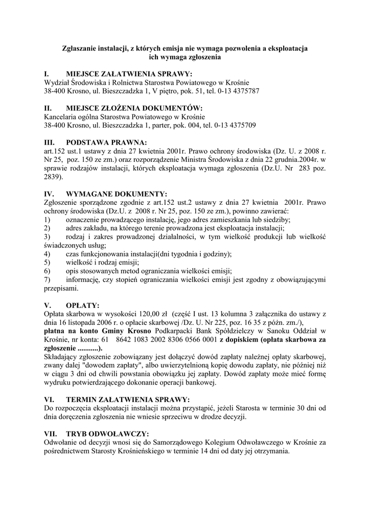 Zgłaszanie instalacji, z których emisja nie wymaga pozwolenia a eksploatacja ich wymaga zgłoszenia I. MIEJSCE ZAŁATWIENIA SPRAWY: Wydział Środowiska i Rolnictwa Starostwa Powiatowego w Krośnie 38-400 Krosno, ul. Bieszczadzka 1, V piętro, pok. 51, tel. 0-13 4375787 II. MIEJSCE ZŁOśENIA DOKUMENTÓW: Kancelaria ogólna Starostwa Powiatowego w Krośnie 38-400 Krosno, ul. Bieszczadzka 1, parter, pok. 004, tel. 0-13 4375709 III. PODSTAWA PRAWNA: art.152 ust.1 ustawy z dnia 27 kwietnia 2001r. Prawo ochrony środowiska (Dz. U. z 2008 r. Nr 25, poz. 150 ze zm.) oraz rozporządzenie Ministra Środowiska z dnia 22 grudnia.2004r. w sprawie rodzajów instalacji, których eksploatacja wymaga zgłoszenia (Dz.U. Nr 283 poz. 2839). IV. WYMAGANE DOKUMENTY: Zgłoszenie sporządzone zgodnie z art.152 ust.2 ustawy z dnia 27 kwietnia 2001r. Prawo ochrony środowiska (Dz.U. z 2008 r. Nr 25, poz. 150 ze zm.), powinno zawierać: 1) oznaczenie prowadzącego instalację, jego adres zamieszkania lub siedziby; 2) adres zakładu, na którego terenie prowadzona jest eksploatacja instalacji; 3) rodzaj i zakres prowadzonej działalności, w tym wielkość produkcji lub wielkość świadczonych usług; 4) czas funkcjonowania instalacji(dni tygodnia i godziny); 5) wielkość i rodzaj emisji; 6) opis stosowanych metod ograniczania wielkości emisji; 7) informację, czy stopień ograniczania wielkości emisji jest zgodny z obowiązującymi przepisami. V. OPŁATY: Opłata skarbowa w wysokości 120,00 zł (część I ust. 13 kolumna 3 załącznika do ustawy z dnia 16 listopada 2006 r. o opłacie skarbowej /Dz. U. Nr 225, poz. 16 35 z póŜn. zm./), płatna na konto Gminy Krosno Podkarpacki Bank Spółdzielczy w Sanoku Oddział w Krośnie, nr konta: 61 8642 1083 2002 8306 0566 0001 z dopiskiem (opłata skarbowa za zgłoszenie ...........). Składający zgłoszenie zobowiązany jest dołączyć dowód zapłaty naleŜnej opłaty skarbowej, zwany dalej "dowodem zapłaty", albo uwierzytelnioną kopię dowodu zapłaty, nie później niŜ w ciągu 3 dni od chwili powstania obowiązku jej zapłaty. Dowód zapłaty moŜe mieć formę wydruku potwierdzającego dokonanie operacji bankowej. VI. TERMIN ZAŁATWIENIA SPRAWY: Do rozpoczęcia eksploatacji instalacji moŜna przystąpić, jeŜeli Starosta w terminie 30 dni od dnia doręczenia zgłoszenia nie wniesie sprzeciwu w drodze decyzji. VII. TRYB ODWOŁAWCZY: Odwołanie od decyzji wnosi się do Samorządowego Kolegium Odwoławczego w Krośnie za pośrednictwem Starosty Krośnieńskiego w terminie 14 dni od daty jej otrzymania. VIII. UWAGI: 1) Instalację objętą obowiązkiem zgłoszenia w okresie, gdy jest juŜ ona eksploatowana, prowadzący ją jest obowiązany zgłosić w terminie 6 miesięcy od dnia, w którym została ona objęta tym obowiązkiem. 2) Prowadzący instalację jest obowiązany przedłoŜyć organowi właściwemu do przyjęcia zgłoszenia informacje o: a) rezygnacji z rozpoczęcia albo zakończenia eksploatacji instalacji; b) zmianie danych dot. instalacji. 3) Zgłoszenia naleŜy dokonać w terminie 14 dni od dnia rezygnacji z podjęcia działalności albo zaprzestania działalności lub zmiany danych. RODZAJE INSTALACJI, Z KTÓRYCH EMISJA NIE WYMAGA POZWOLENIA, A KTÓRYCH EKSPLOATACJA WYMAGA ZGŁOSZENIA TABELA A Lp. Instalacje niewymagające pozwolenia na wprowadzanie gazów lub pyłów do powietrza, których eksploatacja wymaga zgłoszenia z uwagi na wprowadzanie gazów lub pyłów do powietrza1): 1 2 1. energetyczne2) o nominalnej mocy cieplnej3) od 1 MW do: - 5 MW - opalane węglem kamiennym, - 10 MW - opalane koksem, drewnem, słomą, olejem napędowym, olejem opałowym, benzyną lub węglem kamiennym i koksem, drewnem, słomą, olejem napędowym, olejem opałowym, benzyną, jeŜeli nominalna moc cieplna3) wprowadzona w węglu kamiennym nie przekracza 5 MW, - 15 MW - opalane paliwem gazowym4) lub opalane paliwem gazowym4) oraz węglem kamiennym, koksem, drewnem, słomą, olejem napędowym, olejem opałowym, benzyną, jeŜeli nominalna moc cieplna3) wprowadzona w węglu kamiennym nie przekracza 5 MW, a nominalna moc cieplna3) wprowadzona w węglu kamiennym, koksie, drewnie, słomie, oleju napędowym, oleju opałowym, benzynie nie przekracza 10 MW 2. inne niŜ energetyczne o nominalnej mocy cieplnej3) od 0,5 MW do 1 MW, opalane węglem kamiennym, koksem, drewnem, słomą, olejem napędowym, olejem opałowym, benzyną, paliwem gazowym4), z których: 1) wprowadzane do powietrza gazy lub pyły pochodzą wyłącznie ze spalania tych paliw lub 2) wprowadzane do powietrza gazy lub pyły pochodzące z prowadzonych w tych instalacjach procesów innych niŜ spalanie paliw nie powodują przekroczenia 10% dopuszczalnych poziomów substancji w powietrzu albo 10% wartości odniesienia 3. do produkcji węgla drzewnego 4. do suszenia zboŜa, innych płodów rolnych lub leśnych o wydajności większej niŜ 30 Mg na godzinę 5. do przechowywania zboŜa lub innych płodów rolnych lub leśnych w ilości większej niŜ 50 Mg 6. do przesyłu, przeładunku lub magazynowania paliw płynnych 7. do chowu lub hodowli zwierząt, zaliczane do przedsięwzięć mogących znacząco oddziaływać na środowisko, o których mowa w art. 51 ust. 1 pkt 2 ustawy z dnia 27 kwietnia 2001 r. - Prawo ochrony środowiska 8. do produkcji szkła o wydajności mniejszej niŜ 1 Mg na dobę 9. do suszenia, brykietowania lub mielenia węgla, o mocy przerobowej mniejszej niŜ 30 Mg surowca na godzinę 10. do produkcji wapna palonego o wydajności mniejszej niŜ 10 Mg na dobę 11. do lakierowania lub malowania, zuŜywające mniej niŜ 1 Mg w ciągu roku wyrobów lakierowych o wysokiej zawartości cząstek stałych lub wyrobów lakierowych wodorozcieńczalnych 12. stosowane w gastronomii przystosowanej do obsługi więcej niŜ 500 osób na dobę 13. stosowane w przechowalniach owoców lub warzyw, przystosowanych jednoczesnego przechowywania owoców lub warzyw w ilości większej niŜ 50 Mg 14. stosowane w