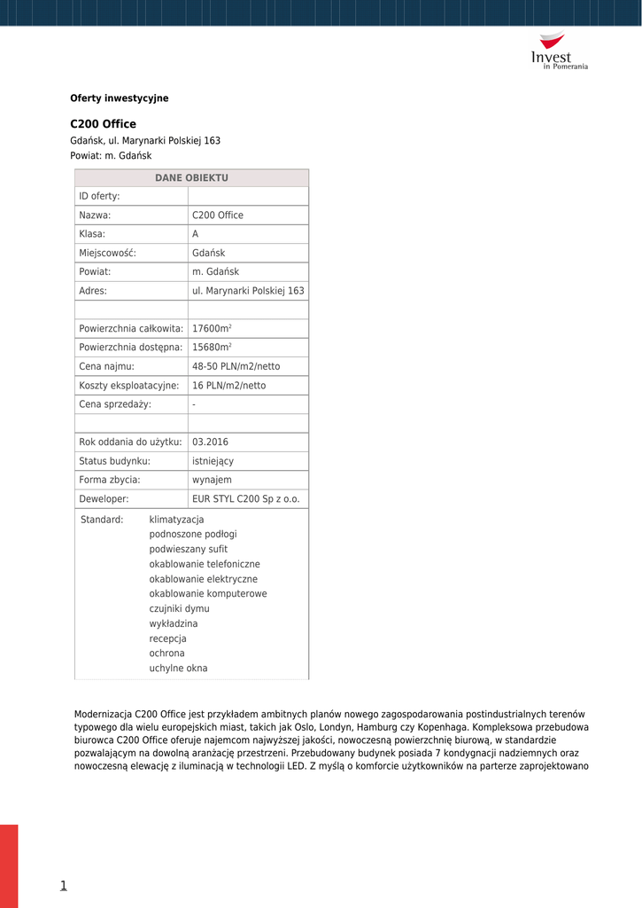 Oferty inwestycyjne C200 Office Gdańsk, ul. Marynarki Polskiej 163 Powiat: m. Gdańsk DANE OBIEKTU ID oferty: Nazwa: C200 Office Klasa: A Miejscowość: Gdańsk Powiat: m. Gdańsk Adres: ul. Marynarki Polskiej 163 Powierzchnia całkowita: 17600m2 Powierzchnia dostępna: 15680m2 Cena najmu: 48-50 PLN/m2/netto Koszty eksploatacyjne: 16 PLN/m2/netto Cena sprzedaży: - Rok oddania do użytku: 03.2016 Status budynku: istniejący Forma zbycia: wynajem Deweloper: EUR STYL C200 Sp z o.o. Standard: klimatyzacja podnoszone podłogi podwieszany sufit okablowanie telefoniczne okablowanie elektryczne okablowanie komputerowe czujniki dymu wykładzina recepcja ochrona uchylne okna Modernizacja C200 Office jest przykładem ambitnych planów nowego zagospodarowania postindustrialnych terenów typowego dla wielu europejskich miast, takich jak Oslo, Londyn, Hamburg czy Kopenhaga. Kompleksowa przebudowa biurowca C200 Office oferuje najemcom najwyższej jakości, nowoczesną powierzchnię biurową, w standardzie pozwalającym na dowolną aranżację przestrzeni. Przebudowany budynek posiada 7 kondygnacji nadziemnych oraz nowoczesną elewację z iluminacją w technologii LED. Z myślą o komforcie użytkowników na parterze zaprojektowano 1 eleganckie, przestronne lobby, wygodną kantynę, sklep, salę konferencyjną oraz klub fitness. W hali garażowej znajdują się miejsca parkingowe, rowerownia wraz z szatniami i prysznicami dla cyklistów oraz pomieszczenia magazynowe. Na zewnątrz budynku zrealizowano duży parking naziemny. W celu uzyskania szczegółowych informacji prosimy o kontakt: Anton Koval, tel.: +48 58 32 33 240, email: [email protected] Ostatnia aktualizacja: lipiec, 2016 Galeria zdjęć: 2