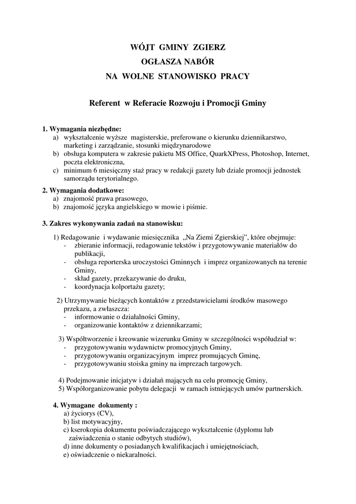 WÓJT GMINY ZGIERZ OGŁASZA NABÓR NA WOLNE STANOWISKO PRACY Referent w Referacie Rozwoju i Promocji Gminy 1. Wymagania niezbędne: a) wykształcenie wyższe magisterskie, preferowane o kierunku dziennikarstwo, marketing i zarządzanie, stosunki międzynarodowe b) obsługa komputera w zakresie pakietu MS Office, QuarkXPress, Photoshop, Internet, poczta elektroniczna, c) minimum 6 miesięczny staż pracy w redakcji gazety lub dziale promocji jednostek samorządu terytorialnego. 2. Wymagania dodatkowe: a) znajomość prawa prasowego, b) znajomość języka angielskiego w mowie i piśmie. 3. Zakres wykonywania zadań na stanowisku: 1) Redagowanie i wydawanie miesięcznika „Na Ziemi Zgierskiej”, które obejmuje: - zbieranie informacji, redagowanie tekstów i przygotowywanie materiałów do publikacji, - obsługa reporterska uroczystości Gminnych i imprez organizowanych na terenie Gminy, - skład gazety, przekazywanie do druku, - koordynacja kolportażu gazety; 2) Utrzymywanie bieżących kontaktów z przedstawicielami środków masowego przekazu, a zwłaszcza: - informowanie o działalności Gminy, - organizowanie kontaktów z dziennikarzami; 3) Współtworzenie i kreowanie wizerunku Gminy w szczególności współudział w: - przygotowywaniu wydawnictw promocyjnych Gminy, - przygotowywaniu organizacyjnym imprez promujących Gminę, - przygotowywaniu stoiska gminy na imprezach targowych. 4) Podejmowanie inicjatyw i działań mających na celu promocję Gminy, 5) Współorganizowanie pobytu delegacji w ramach istniejących umów partnerskich. 4. Wymagane dokumenty : a) życiorys (CV), b) list motywacyjny, c) kserokopia dokumentu poświadczającego wykształcenie (dyplomu lub zaświadczenia o stanie odbytych studiów), d) inne dokumenty o posiadanych kwalifikacjach i umiejętnościach, e) oświadczenie o niekaralności. Wymagane dokumenty aplikacyjne należy składać osobiście w Kancelarii Urzędu Gminy Zgierz w Zgierzu ul .Łęczycka 4 pok.2 lub pocztą na adres Urzędu z dopiskiem dotyczy naboru na stanowisko Referent w Referacie Rozwoju i Promocji Gminy w terminie do dnia 28 marca 2007 r. Aplikacje , które wpłyną do Urzędu po upływie wyżej określonego terminu nie będą rozpatrywane. Informacja o wyniku naboru będzie umieszczona na stronie internetowej Biuletynu Informacji Publicznej ( www.e-samorząd.pl/bip/gmina_zgierz) oraz na tablicy informacyjnej w siedzibie Urzędu Gminy Zgierz w Zgierzu ul. Łęczycka 4. Wymagane dokumenty aplikacyjne: list motywacyjny, CV powinny być opatrzone klauzulą : wyrażam zgodę na przetwarzanie moich danych osobowych zawartych w ofercie pracy dla potrzeb niezbędnych do realizacji procesu rekrutacji zgodnie z ustawą z dnia 29 sierpnia 1997 roku o ochronie danych osobowych (Dz .U. z 2002 r. nr 101 poz.926 ze zmianami) oraz ustawą z dnia 22 marca 1990 roku o pracownikach samorządowych (Dz.U. z 2001 nr 142, poz.1593 ze zmianami). Wójt Gminy Zgierz (-) mgr inż. Zdzisław Rembisz