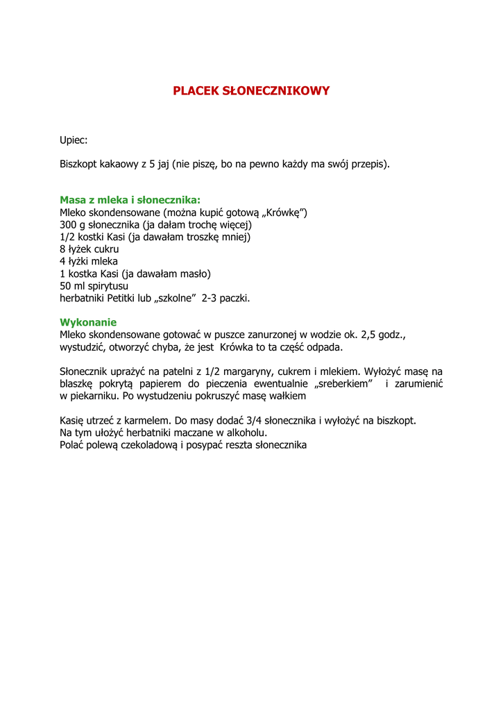 PLACEK SŁONECZNIKOWY Upiec: Biszkopt kakaowy z 5 jaj (nie piszę, bo na pewno każdy ma swój przepis). Masa z mleka i słonecznika: Mleko skondensowane (można kupić gotową „Krówkę”) 300 g słonecznika (ja dałam trochę więcej) 1/2 kostki Kasi (ja dawałam troszkę mniej) 8 łyżek cukru 4 łyżki mleka 1 kostka Kasi (ja dawałam masło) 50 ml spirytusu herbatniki Petitki lub „szkolne” 2-3 paczki. Wykonanie Mleko skondensowane gotować w puszce zanurzonej w wodzie ok. 2,5 godz., wystudzić, otworzyć chyba, że jest Krówka to ta część odpada. Słonecznik uprażyć na patelni z 1/2 margaryny, cukrem i mlekiem. Wyłożyć masę na blaszkę pokrytą papierem do pieczenia ewentualnie „sreberkiem” i zarumienić w piekarniku. Po wystudzeniu pokruszyć masę wałkiem Kasię utrzeć z karmelem. Do masy dodać 3/4 słonecznika i wyłożyć na biszkopt. Na tym ułożyć herbatniki maczane w alkoholu. Polać polewą czekoladową i posypać reszta słonecznika