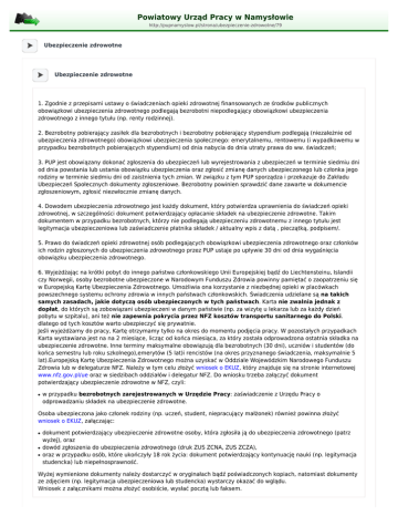 Powiatowy Urząd Pracy w Namysłowie http://pupnamyslow.pl/strona/ubezpieczenie-zdrowotne/79 Ubezpieczenie zdrowotne Ubezpieczenie zdrowotne 1. Zgodnie z przepisami ustawy o świadczeniach opieki zdrowotnej finansowanych ze środków publicznych obowiązkowi ubezpieczenia zdrowotnego podlegają bezrobotni niepodlegający obowiązkowi ubezpieczenia zdrowotnego z innego tytułu (np. renty rodzinnej). 2. Bezrobotny pobierający zasiłek dla bezrobotnych i bezrobotny pobierający stypendium podlegają (niezależnie od ubezpieczenia zdrowotnego) obowiązkowi ubezpieczenia społecznego: emerytalnemu, rentowemu (i wypadkowemu w przypadku bezrobotnych pobierających stypendium) od dnia nabycia do dnia utraty prawa do ww. świadczeń; 3. PUP jest obowiązany dokonać zgłoszenia do ubezpieczeń lub wyrejestrowania z ubezpieczeń w terminie siedmiu dni od dnia powstania lub ustania obowiązku ubezpieczenia oraz zgłosić zmianę danych ubezpieczonego lub członka jego rodziny w terminie siedmiu dni od zaistnienia tych zmian. W związku z tym PUP sporządza i przekazuje do Zakładu Ubezpieczeń Społecznych dokumenty zgłoszeniowe. Bezrobotny powinien sprawdzić dane zawarte w dokumencie zgłoszeniowym, zgłosić niezwłocznie zmianę danych. 4. Dowodem ubezpieczenia zdrowotnego jest każdy dokument, który potwierdza uprawnienia do świadczeń opieki zdrowotnej, w szczególności dokument potwierdzający opłacanie składek na ubezpieczenie zdrowotne. Takim dokumentem w przypadku bezrobotnych, którzy nie podlegają ubezpieczeniu zdrowotnemu z innego tytułu jest legitymacja ubezpieczeniowa lub zaświadczenie płatnika składek / aktualny wpis z datą , pieczątką, podpisem/. 5. Prawo do świadczeń opieki zdrowotnej osób podlegających obowiązkowi ubezpieczenia zdrowotnego oraz członków ich rodzin zgłoszonych do ubezpieczenia zdrowotnego przez PUP ustaje po upływie 30 dni od dnia wygaśnięcia obowiązku ubezpieczenia zdrowotnego. 6. Wyjeżdżając na krótki pobyt do innego państwa członkowskiego Unii Europejskiej bądź do Liechtensteinu, Islandii czy Norwegii, osoby bezrobotne ubezpieczone w Narodowym Funduszu Zdrowia powinny pamiętać o zaopatrzeniu się w Europejską Kartę Ubezpieczenia Zdrowotnego. Umożliwia ona korzystanie z niezbędnej opieki w placówkach powszechnego systemu ochrony zdrowia w innych państwach członkowskich. Świadczenia udzielane są na takich samych zasadach, jakie dotyczą osób ubezpieczonych w tych państwach. Karta nie zwalnia jednak z dopłat, do których są zobowiązani ubezpieczeni w danym państwie (np. za wizytę u lekarza lub za każdy dzień pobytu w szpitalu), ani też nie zapewnia pokrycia przez NFZ kosztów transportu sanitarnego do Polski. dlatego od tych kosztów warto ubezpieczyć się prywatnie. Jeśli wyjeżdżamy do pracy, Kartę otrzymamy tylko na okres do momentu podjęcia pracy. W pozostałych przypadkach Karta wystawiana jest na na 2 miesiące, licząc od końca miesiąca, za który została odprowadzona ostatnia składka na ubezpieczenie zdrowotne. Inne terminy maksymalne obowiązują dla bezrobotnych (30 dni), uczniów i studentów (do końca semestru lub roku szkolnego),emerytów (5 lat)i rencistów (na okres przyznanego świadczenia, maksymalnie 5 lat).Europejską Kartę Ubezpieczenia Zdrowotnego można uzyskać w Oddziale Wojewódzkim Narodowego Funduszu Zdrowia lub w delegaturze NFZ. Należy w tym celu złożyć wniosek o EKUZ, który znajduje się na stronie internetowej www.nfz.gov.pl/ue oraz w siedzibach oddziałów i delegatur NFZ. Do wniosku trzeba załączyć dokument potwierdzający ubezpieczenie zdrowotne w NFZ, czyli: ● w przypadku bezrobotnych zarejestrowanych w Urzędzie Pracy: zaświadczenie z Urzędu Pracy o odprowadzaniu składek na ubezpieczenie zdrowotne. Osoba ubezpieczona jako członek rodziny (np. uczeń, student, niepracujący małżonek) również powinna złożyć wniosek o EKUZ, załączając: ● ● ● dokument potwierdzający ubezpieczenie zdrowotne osoby, która zgłosiła ją do ubezpieczenia zdrowotnego (patrz wyżej), oraz dowód zgłoszenia do ubezpieczenia zdrowotnego (druk ZUS ZCNA, ZUS ZCZA), oraz w przypadku osób, które ukończyły 18 rok życia: dokument potwierdzający kontynuację nauki (np. legitymacja studencka) lub niepełnosprawność. Wyżej wymienione dokumenty należy dostarczyć w oryginałach bądź poświadczonych kopiach, natomiast dokumenty ze zdjęciem (np. legitymacja ubezpieczeniowa lub studencka) wystarczy okazać do wglądu. Wniosek z załącznikami można złożyć osobiście, wysłać pocztą lub faksem.