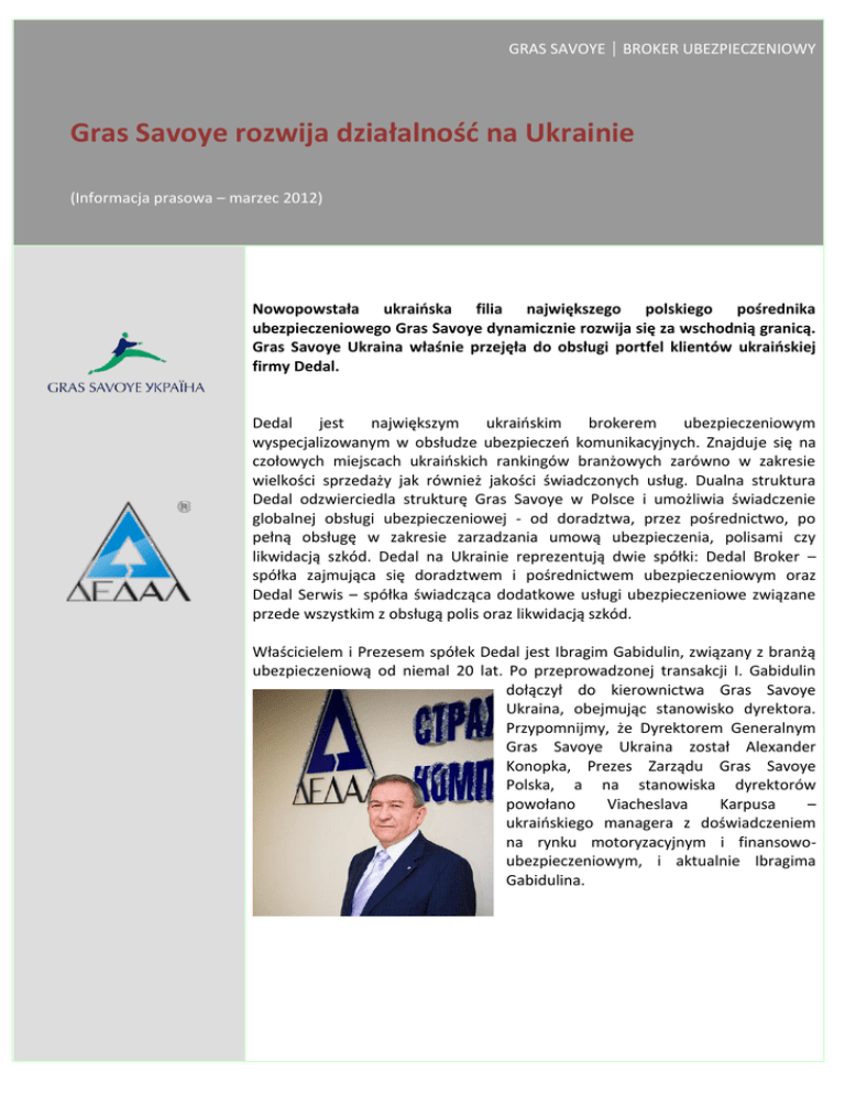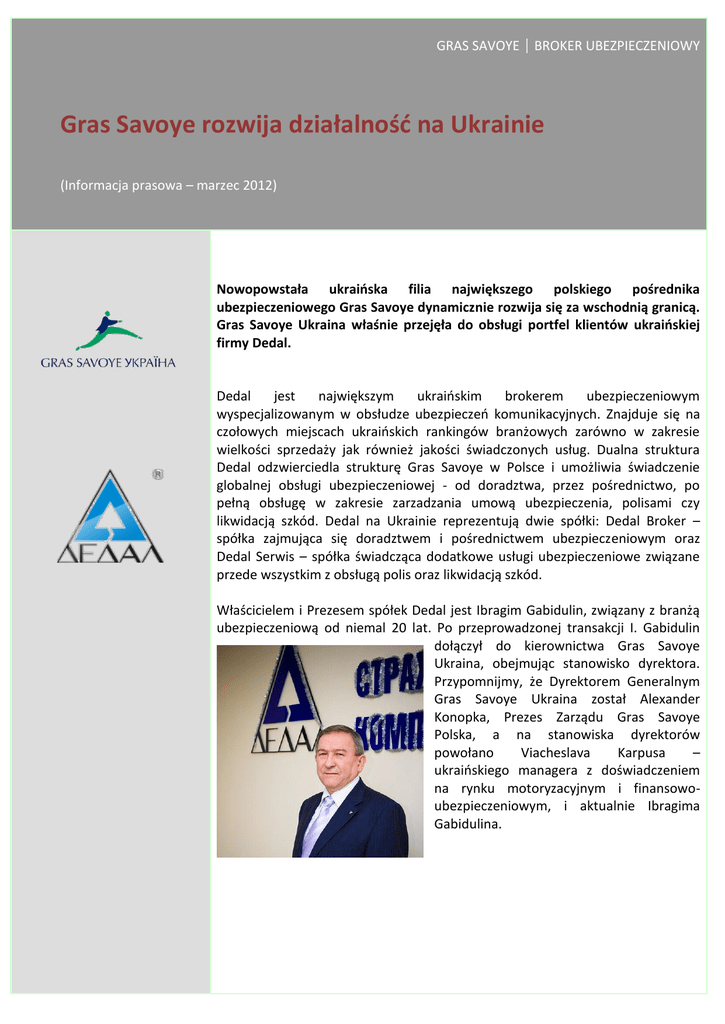 GRAS SAVOYEBROKER UBEZPIECZENIOWY Gras Savoye rozwija działalność na Ukrainie (Informacja prasowa – marzec 2012) Nowopowstała ukraińska filia największego polskiego pośrednika ubezpieczeniowego Gras Savoye dynamicznie rozwija się za wschodnią granicą. Gras Savoye Ukraina właśnie przejęła do obsługi portfel klientów ukraińskiej firmy Dedal. Dedal jest największym ukraińskim brokerem ubezpieczeniowym wyspecjalizowanym w obsłudze ubezpieczeń komunikacyjnych. Znajduje się na czołowych miejscach ukraińskich rankingów branżowych zarówno w zakresie wielkości sprzedaży jak również jakości świadczonych usług. Dualna struktura Dedal odzwierciedla strukturę Gras Savoye w Polsce i umożliwia świadczenie globalnej obsługi ubezpieczeniowej - od doradztwa, przez pośrednictwo, po pełną obsługę w zakresie zarzadzania umową ubezpieczenia, polisami czy likwidacją szkód. Dedal na Ukrainie reprezentują dwie spółki: Dedal Broker – spółka zajmująca się doradztwem i pośrednictwem ubezpieczeniowym oraz Dedal Serwis – spółka świadcząca dodatkowe usługi ubezpieczeniowe związane przede wszystkim z obsługą polis oraz likwidacją szkód. Właścicielem i Prezesem spółek Dedal jest Ibragim Gabidulin, związany z branżą ubezpieczeniową od niemal 20 lat. Po przeprowadzonej transakcji I. Gabidulin dołączył do kierownictwa Gras Savoye Ukraina, obejmując stanowisko dyrektora. Przypomnijmy, że Dyrektorem Generalnym Gras Savoye Ukraina został Alexander Konopka, Prezes Zarządu Gras Savoye Polska, a na stanowiska dyrektorów powołano Viacheslava Karpusa – ukraińskiego managera z doświadczeniem na rynku motoryzacyjnym i finansowoubezpieczeniowym, i aktualnie Ibragima Gabidulina. - Bardzo cieszę się ze współpracy z Dedal i z wdrożenia takiego rozwiązania. Jest to owoc kilku lat współpracy, między innymi w obszarze obsługi klientów zarówno korporacyjnych jak i indywidualnych. Tego rodzaju transakcje wśród firm pośrednictwa ubezpieczeniowego implikują zazwyczaj złożone procesy. W tym przypadku sama transakcja, dzięki temu, że była poprzedzona długim okresem współpracy, przebiegłą bardzo sprawnie. Nowy schemat obsługi to wartość dodana dla naszych klientów i dla nas. Każda ze spółek wnosi to, w czym jest najbardziej konkurencyjna na swoim rynku. Gras Savoye to efektywne narzędzia obsługowe IT, międzynarodowe know-how oraz autorskie modele obsługi i sprawdzone rozwiązania w zakresie ubezpieczeń komunikacyjnych. Dedal oddaje do dyspozycji Klientów swoją bardzo obszerną wiedzę w zakresie ubezpieczeń komunikacyjnych na rynku ukraińskim, swój dynamiczny zespół pracowników oraz sieć obsługi obejmującą kilkadziesiąt przedstawicielstw na terenie całej Ukrainy. – komentuje Przemysław Konopka Vice Prezes Gras Savoye Polska odpowiedzialny za tę transakcję. Jedną z silnych specjalizacji Gras Savoye w Polsce jest obsługa ubezpieczeń komunikacyjnych. Za pośrednictwem tej czołowej grupy brokerskiej ubezpieczane są samochody największych firm leasingowych, pojazdy sprzedawane przez czołowych importerów samochodowych oraz floty samochodowe wielu firm transportowych. Dzięki transakcji z Dedal, podobne portfolio zyskała ukraińska filia Gras Savoye. Gras Savoye niezmiennie od 1992 roku zajmuje pierwszą pozycję w rankingach brokerów ubezpieczeniowych we Francji, a od 2004 w Polsce. Firma Gras Savoye została założona w 1907 w Lille na północy Francji. Obecnie grupa Gras Savoye zatrudnia ponad 3600 osób, a jej sieć obejmuje około 100 placówek w różnych częściach świata. Grupa działa w Polsce w ramach dwóch spółek Gras Savoye Polska – broker ubezpieczeniowy i reasekuracyjny Pol-Assistance – spółka serwisowa Gras Savoye w Polsce, z 300 osobowym zespołem i obrotami przekraczającymi 130 mln PLN zapewnia obsługę wszystkich linii ubezpieczeniowych takich jak ubezpieczenia majątkowe, komunikacyjne, odpowiedzialności cywilnej, osobowe oraz specjalistyczne produkty usługi takie jak na przykład ubezpieczenia pogodowe czy ubezpieczenie budowlane wad ukrytych. Usługi Gras Savoye kierowane są dużych międzynarodowych firm oraz do średnich przedsiębiorstw ze wszystkich branż. Grupa specjalizuje się w szczególności w obsłudze sektora budowlanego i nieruchomości, energetycznego, finansowego i motoryzacyjnego oraz podmiotów publicznych. W ramach jej struktur istnieje dedykowany departament obsługi klientów francuskich. Grupa świadczy ponadto usługi w zakresie masowej dystrybucji ubezpieczeń, bancassurance, risk manegement, reasekuracji, likwidacji szkód oraz assistance. Spółki Gras Savoye są sześciokrotną Gazelą Biznesu. Znalazły się również w zaszczytnym gronie Diamentów Forbes oraz otrzymały od Dun&Bradstreet certyfikat Przejrzysta Firma oraz Certyfikat Wiarygodności Biznesowej. KONTAKT Joanna Suszczyk Tel. 691 015 025 E-mail: [email protected]