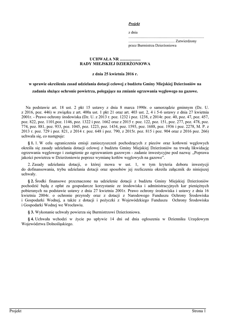 Projekt z dnia ................................................................................ ................................................. Zatwierdzony przez Burmistrza Dzierżoniowa UCHWAŁA NR .................... RADY MIEJSKIEJ DZIERŻONIOWA z dnia 25 kwietnia 2016 r. w sprawie określenia zasad udzielania dotacji celowej z budżetu Gminy Miejskiej Dzierżoniów na zadania służące ochronie powietrza, polegające na zmianie ogrzewania węglowego na gazowe. Na podstawie art. 18 ust. 2 pkt 15 ustawy z dnia 8 marca 1990r. o samorządzie gminnym (Dz. U. z 2016, poz. 446) w związku z art. 400a ust. 1 pkt 21 oraz art. 403 ust. 2, 4 i 5-6 ustawy z dnia 27 kwietnia 2001r. - Prawo ochrony środowiska (Dz. U. z 2013 r. poz. 1232 i poz. 1238, z 2014r. poz. 40, poz. 47, poz. 457, poz. 822, poz. 1101,poz. 1146, poz. 1322 i poz. 1662 oraz z 2015 r. poz. 122, poz. 151, poz. 277, poz. 478, poz. 774, poz. 881, poz. 933, poz. 1045, poz. 1223, poz. 1434, poz. 1593, poz. 1688, poz. 1936 i poz. 2278, M. P. z 2013 r. poz. 729 i poz. 821, z 2014 r. poz. 648 i poz. 790, z 2015r. poz. 815 i poz. 904 oraz z 2016 poz. 266) uchwala się, co następuje: § 1. 1. W celu ograniczenia emisji zanieczyszczeń pochodzących z pieców oraz kotłowni węglowych określa się zasady udzielania dotacji celowej z budżetu Gminy Miejskiej Dzierżoniów na trwałą likwidację ogrzewania węglowego i zastąpienie go ogrzewaniem gazowym - zadanie inwestycyjne pod nazwą: „Poprawa jakości powietrza w Dzierżoniowie poprzez wymianę kotłów węglowych na gazowe”. 2. Zasady udzielania dotacji, o której mowa w ust. 1, w tym kryteria doboru inwestycji do dofinansowania, trybu udzielania dotacji oraz sposobów jej rozliczenia określa załącznik do niniejszej uchwały. § 2. Środki finansowe przeznaczone na udzielenie dotacji z budżetu Gminy Miejskiej Dzierżoniów pochodzić będą z opłat za gospodarcze korzystanie ze środowiska i administracyjnych kar pieniężnych pobieranych na podstawie ustawy z dnia 27 kwietnia 2001r. Prawo ochrony środowiska i ustawy z dnia 16 kwietnia 2004r. o ochronie przyrody oraz z dotacji z Narodowego Funduszu Ochrony Środowiska i Gospodarki Wodnej, a także z dotacji i pożyczki z Wojewódzkiego Funduszu Ochrony Środowiska i Gospodarki Wodnej we Wrocławiu. § 3. Wykonanie uchwały powierza się Burmistrzowi Dzierżoniowa. § 4. Uchwała wchodzi w życie po upływie 14 dni od dnia ogłoszenia w Dzienniku Urzędowym Województwa Dolnośląskiego. Projekt Strona 1 Załącznik do Uchwały Nr .................... Rady Miejskiej Dzierżoniowa z dnia 25 kwietnia 2016 r. Zasady udzielania dotacji celowej na trwałą likwidację ogrzewania węglowego i zastąpienie go ogrzewaniem gazowym. Rozdział 1. Postanowienia ogólne § 1. 1. Niniejsze zasady określają sposób udzielania dotacji celowej z budżetu Gminy Miejskiej Dzierżoniów, zwanej dalej "dotacją", na realizację zadań z zakresu ochrony środowiska obejmujących trwałą likwidację systemu ogrzewania opartego na paliwie węglowym i jego zamianę na ogrzewanie gazowe, w ramach zadania „Poprawa jakości powietrza w Dzierżoniowie poprzez wymianę kotłów węglowych na gazowe”. 2. Przez trwałą likwidację ogrzewania opartego na paliwie węglowym rozumie się usunięcie z nieruchomości pieca/kotła węglowego. 3. Beneficjent zobowiązany jest do utrzymania systemu ogrzewania objętego dotacją przez okres co najmniej 5 lat, licząc od dnia otrzymania dotacji. Rozdział 2. Ogólne zasady udzielania dotacji i wysokość dofinansowania § 2. 1. Beneficjentami dotacji mogą być osoby fizyczne będące właścicielami lokalu mieszkalnego lub domu jednorodzinnego położonego na terenie Gminy Miejskiej Dzierżoniów oraz ich najemcy, za zgodą właścicieli nieruchomości. 2. Dotacja dla danego Beneficjenta na daną nieruchomość może być udzielona jednokrotnie. § 3. Dotacja udzielana jest wyłącznie na dofinansowanie niezbędnych kosztów realizacji zadania, w szczególności: 1) koszt demontażu palenisk węglowych, 2) koszt zakupu i montażu nowego źródła ciepła, 3) koszt zakupu i montażu armatury niezbędnej do wykonania nowego systemu ogrzewania, w szczególności: rury, zawory, pompy, izolacje rurociągów, grzejniki, system odprowadzania spalin, itp. § 4. Dotacja nie może być wykorzystana na: 1) ) sfinansowanie dokumentacji sporządzonej w ramach przygotowania zadania, np. projekt budowlany, projekt wykonawczy, uzgodnienia itp., 2) zakup urządzeń grzewczych nie stanowiących trwałego wyposażenia mieszkań, 3) zadania, których realizacja nie gwarantuje trwałego efektu ekologicznego, rozumianego jako likwidacja pieców/kotłów węglowych, 4) refundację wydatków poniesionych przed datą zawarcia umowy dotacyjnej. § 5. Dotacją objęte są wyłącznie urządzenia fabrycznie nowe i zamontowane po raz pierwszy, spełniające normy i dopuszczone do użytkowania na terenie Polski. § 6. 1. Dotacje udzielane są do wysokości środków finansowych zarezerwowanych na ten cel w budżecie Gminy Miejskiej Dzierżoniów. 2. Wysokość środków finansowych, o których mowa w ust. 1, podawana będzie corocznie w ogłoszeniu o naborze wniosków, po przyjęciu uchwały budżetowej przez Radę Miejską Dzierżoniowa. Projekt Strona 1 3. W ogłoszeniu o naborze, internetowej www.dzierzoniow.pl wskazane będą : które opublikowane będzie na stronie 1) termin składania wniosków, 2) miejsce i forma składania wniosków, 3) wzory wniosków i formularzy niezbędnych do udzielenia i rozliczenia dotacji, 4) wykaz dokumentów niezbędnych do udzielenia i rozliczenia dotacji. § 7. Dotacja nie może pokrywać wydatków przeznaczonych na ten cel sfinansowanych z innych bezzwrotnych źródeł (zakaz tzw. podwójnego dofinansowania). Rozdział 3. Wysokość dofinansowania i tryb postępowania § 8. Dotacja będzie udzielana w wysokości do 60% poniesionych kosztów kwalifikowanych, o których mowa w §3, ale nie więcej