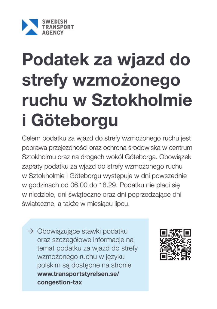 Podatek za wjazd do strefy wzmożonego ruchu w Sztokholmie i Göteborgu Celem podatku za wjazd do strefy wzmożonego ruchu jest poprawa przejezdności oraz ochrona środowiska w centrum Sztokholmu oraz na drogach wokół Göteborga. Obowiązek zapłaty podatku za wjazd do strefy wzmożonego ruchu w Sztokholmie i Göteborgu występuje w dni powszednie w godzinach od 06.00 do 18.29. Podatku nie płaci się w niedziele, dni świąteczne oraz dni poprzedzające dni świąteczne, a także w miesiącu lipcu. Ò Obowiązujące stawki podatku oraz szczegółowe informacje na temat podatku za wjazd do strefy wzmożonego ruchu w języku polskim są dostępne na stronie www.transportstyrelsen.se/ congestion-tax