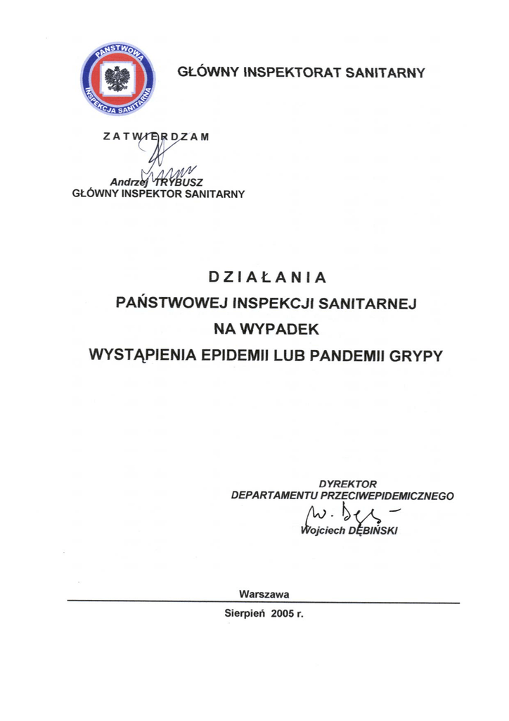 GŁÓWNY INSPEKTORAT SANITARNY ZATWIERDZAM ANDRZEJ TRYBUSZ GŁÓWNY INSPEKTOR SANITARNY DZIAŁANIA PAŃSTWOWEJ INSPEKCJI SANITARNEJ NA WYPADEK WYSTĄPIENIA EPIDEMII (LUB PANDEMII) GRYPY DYREKTOR DEPARTAMENTU PRZECIWEPIDEMICZNEGO Wojciech DĘBIŃSKI Warszawa Sierpień 2005 r. I. Grypa i nadzór nad nią Grypa (influenza) – choroba wirusowa wywołana przez RNA – Myxovirusy (Typy A, B, C, liczne podtypy), jest jednym z najpoważniejszych problemów zdrowotnych świata z uwagi na: • łatwość szerzenia się drogą kropelkową w skali państw, kontynentów i świata; • ogromną zmienność wirusów w wyniku ich zmian antygenowych, przełamujących barierę obronną człowieka, co powoduje powstawanie epidemii co kilka – kilkanaście lat. Duże zmiany antygenowe mogą powodować pandemię z wysoką śmiertelnością. Nie można wykluczyć, że w najbliższym czasie może dojść do takiej pandemii, wywołanej wirusem A (H5N1) – tzw. „ptasiej grypy”, który od kilku lat przełamuje barierę międzygatunkową w krajach Azji Płd. – Wsch., powodując zachorowania z wysoką śmiertelnością (rzędu 50%). Światowa Organizacja Zdrowia (WHO) opracowała w 1999 roku plan działań na wypadek pandemii grypy (Influenza Pandemic Prepardness Plan), który jest stale aktualizowany, oraz poleciła sporządzenie planów krajowych. Biorąc to pod uwagę, zarządzeniem Ministra Zdrowia z dnia 25.03.2005 r., powołano Krajowy Komitet do Spraw Pandemii Grypy, w którego składzie znaleźli się przedstawiciele instytucji (MON, MSWiA, MSZ, MZ) zaangażowanych w realizację zadań związanych z ochroną ludności przed skutkami pandemii grypy. Zadaniem Krajowego Komitetu ds. Pandemii Grypy jest w szczególności: • monitorowanie światowej i krajowej sytuacji epidemicznej grypy, zarówno w okresie międzypandemicznym, jak i w sytuacji pandemii grypy – we współpracy z organizacjami międzynarodowymi i Państwowym Zakładem Higieny (Krajowym Ośrodkiem ds. Grypy); • opracowywanie standardów i procedur dla podejmowanych działań profilaktycznych, diagnostycznych, leczniczych i organizacyjnych; • koordynowanie działań w razie zagrożenia pandemią i po jej wystąpieniu w tym: ¾ dokonywanie oceny zagrożenia, 2 ¾ określanie zadań dla poszczególnych jednostek i służb oraz zakresu ich odpowiedzialności, przy maksymalnym wykorzystaniu istniejących struktur działających w sytuacjach kryzysowych; ¾ spełnianie roli krajowego centrum konsultacyjnego i decyzyjnego odnośnie wszystkich zagadnień związanych z grypą. Komitet opracował, zgodnie z wymogami WHO, Krajowy Plan działania na wypadek wystąpienia pandemii grypy, który Minister Zdrowia w dniu 10 sierpnia br. zatwierdził. Dokument ten jest narzędziem, które określa działania niezbędne do przygotowania kraju na wystąpienie kolejnej pandemii grypy, jak również działania w okresie międzypandemicznym, alarmu pandemicznego, pandemii i okresu postpandemicznego i będzie modyfikowany zgodnie z postępem wiedzy oraz zaleceniami WHO i Komisji Europejskiej. Sytuacja epidemiologiczna w Polsce - od kilku lat nie było w kraju wielkiej epidemii grypy. W roku 2004 – wystąpiło 336.919 zachorowań (zapadalność 992,44/100 tys. ludzi). W roku 2003 – wystąpiło 1.216.285 zachorowań (zapadalność 3.184,39/100 tys.). Większość z tych przypadków zdiagnozowano klinicznie, co powoduje ich stosunkowo niską wiarygodność etiologiczną. Diagnostykę wirusologiczną – niezbędną w szybkiej i pewnej diagnostyce choroby wykonuje praktycznie tylko Krajowy Ośrodek Grypy (hodowle tkankowe, badania IF). Ilość tych badań jest mała. W sezonie 2003/2004 z terenu całego kraju nadesłano 153 próbki (w 14 izolowano grypę). W sezonie 2004/2005 Ośrodek potwierdził 23 przypadki zakażeń wirusami grypy. Państwowa Inspekcja Sanitarna w ramach swoich kompetencji przewidzianych w ustawie z dnia 6 września 2001 r. o chorobach zakaźnych i zakażeniach (Dz. U. Nr 126, poz. 1384 z późn. zm.) oraz ustawie z dnia 14 marca 1985 r. o Państwowej Inspekcji Sanitarnej (Dz. U. z 1998 r., Nr 90, poz. 575 z późn. zm.) sprawuje nadzór epidemiologiczny nad zachorowaniami na choroby zakaźne, w tym nad grypą. Zgodnie z ustawą o chorobach zakaźnych i zakażeniach w przypadku podejrzenia zakażenia lub zachorowania na grypę (art. 20 ust. 3) istnieje obowiązek nałożony na lekarza stawiającego diagnozę zgłoszenia tego faktu w ciągu 24 godzin do właściwego ze względu na miejsce zachorowania państwowego powiatowego inspektora sanitarnego. Z kolei państwowy powiatowy inspektor sanitarny sporządza zbiorcze raporty zawierające dane liczbowe o wystąpieniu zachorowań na choroby zakaźne podlegające zgłoszeniu oraz o dodatnich wynikach badań laboratoryjnych i przekazuje je właściwemu wojewódzkiemu inspektorowi sanitarnemu. Zestawienia zbiorcze z obszaru województwa 3 przekazywane są przez państwowych wojewódzkich inspektorów sanitarnych do Państwowego Zakładu Higieny, który na zlecenie Głównego Inspektora Sanitarnego wykonuje analizy na poziomie krajowym. Sprawozdawczość o zachorowaniach na grypę odbywa się na drukach MZ-56 (dwutygodniowe, kwartalne, roczne sprawozdania o zachorowaniach na choroby zakaźne i zatrucia związkami chemicznymi) i MZ-55 (dwutygodniowy, tygodniowy, dzienny meldunek o zachorowaniach na grypę lub podejrzeniach za dzień, okres). Pracownicy laboratoriów WSSE są przeszkoleni i przygotowani do realizacji nadzoru epidemiologicznego i wirusologicznego nad grypą w systemie SENTINEL. Ten rodzaj nadzoru polega na wytypowaniu części jednostek ochrony zdrowia (szpitali, poradni, gabinetów lekarskich), w których dokonywane jest oprócz rejestracji przypadków także pobieranie od chorych materiału do badań wirusologicznych (wymazy z gardła i nosa). Na podstawie wyników badań w ramach tego systemu można wykryć wirusa, wcześnie rozpoznać sytuację ekspozycji lub jego transmis