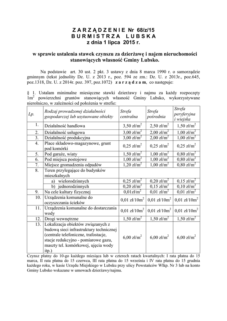 Z A R Z Ą D Z E N I E Nr 68/z/15 BURMISTRZA LUBSKA z dnia 1 lipca 2015 r. w sprawie ustalenia stawek czynszu za dzierżawę i najem nieruchomości stanowiących własność Gminy Lubsko. Na podstawie art. 30 ust. 2 pkt. 3 ustawy z dnia 8 marca 1990 r. o samorządzie gminnym (tekst jednolity Dz. U. z 2013 r., poz. 594 ze zm.: Dz. U. z 2013r., poz.645, poz.1318, Dz. U. z 2014r. poz. 397, poz.1072) z a r z ą d z a m, co następuje: § 1. Ustalam minimalne miesięczne stawki dzierżawy i najmu za każdy rozpoczęty 1m2 powierzchni gruntów stanowiących własność Gminy Lubsko, wykorzystywane nierolniczo, w zależności od położenia w strefie: Strefa Rodzaj prowadzonej działalności Strefa Strefa Lp. peryferyjna gospodarczej lub usytuowane obiekty centralna pośrednia i wiejska 2 2 1. Działalność handlowa 3,50 zł/m 2,50 zł/m 1,50 zł/m2 2. Działalność usługowa 3,00 zł/m2 2,00 zł/m2 1,00 zł/m2 3. Działalność produkcyjna 3,00 zł/m2 2,00 zł/m2 1,00 zł/m2 4. Place składowo-magazynowe, grunt 0,25 zł/m2 0,25 zł/m2 0,25 zł/m2 pod komórki 5. Pod garaże, wiaty 1,50 zł/m2 1,00 zł/m2 0,80 zł/m2 6. Pod miejsca postojowe 1,00 zł/m2 1,00 zł/m2 0,80 zł/m2 2 2 7. Miejsce gromadzenia odpadów 1,20 zł/m 1,00 zł/m 0,80 zł/m2 8. Teren przylegające do budynków mieszkalnych a) wielorodzinnych 0,25 zł/m2 0,20 zł/m2 0,15 zł/m2 2 2 b) jednorodzinnych 0,20 zł/m 0,15 zł/m 0,10 zł/m2 9. Na cele kultury fizycznej 0,01zł/m2 0,01 zł/m2 0,01 zł/m2 10. Urządzenia komunalne do 0,01 zł/10m2 0,01 zł/10m2 0,01 zł/10m2 oczyszczania ścieków 11. Urządzenia komunalne do dostarczania 0,01 zł/10m2 0,01 zł/10m2 0,01 zł/10m2 wody 12. Drogi wewnętrzne 1,50 zł/m2 1,50 zł/m2 1,50 zł/m2 13. Lokalizacja obiektów związanych z budową sieci infrastruktury technicznej (centrale telefoniczne, trafostacje, 6,00 zł/m2 6,00 zł/m2 6,00 zł/m2 stacje redukcyjno - pomiarowe gazu, maszty tel. komórkowej, ujęcia wody itp.) Czynsz płatny do 10-go każdego miesiąca lub w czterech ratach kwartalnych: I rata płatna do 15 marca, II rata płatna do 15 czerwca, III rata płatna do 15 września i IV rata płatna do 15 grudnia każdego roku, w kasie Urzędu Miejskiego w Lubsku przy ulicy Powstańców Wlkp. Nr 3 lub na konto Gminy Lubsko wskazane w umowach dzierżawy/najmu. § 2. Ustalam minimalne miesięczne stawki czynszu najmu lokali użytkowych za 1m2 powierzchni w budynkach stanowiących własność Gminy Lubsko, w zależności od położenia w strefie: Strefa miejska ( strefa centralna i pośrednia wg załącznika) 10,00 zł/m2 10,00 zł/m2 10,00 zł/m2 10,00 zł/m2 5,50 zł/m2 6,00 zł/m2 0,50 zł/m2 Rodzaj lokalu i prowadzonej działalności gospodarczej Lp. 1. 2. 3. 4. 5. 6. 7. Lokale handlowe Lokale usługowe Lokale użytkowe Lokale biurowe Magazyny Garaże Lokale dla organizacji i stowarzyszeń społecznych 8. Budynki gospodarcze na cele komunalne (komórki) 9. Budynki użytkowane na cele: a) komunalne oczyszczanie ścieków b) dostarczanie wody Strefa peryferyjna i wiejska 5,00 zł/m2 5,00 zł/m2 4,00 zł/m2 4,00 zł/m2 3,00 zł/m2 5,00 zł/m2 0,50 zł/m2 0,50 zł/m2 0,50 zł/m2 0,01 zł/m2 0,01 zł/m2 0,01 zł/m2 0,01 zł/m2 Czynsz płatny do 10-go każdego miesiąca lub w czterech ratach kwartalnych: I rata płatna do 15 marca, II rata płatna do 15 czerwca, III rata płatna do 15 września i IV rata płatna do 15 grudnia każdego roku, w kasie Urzędu Miejskiego w Lubsku przy ulicy Powstańców Wlkp. Nr 3 lub na konto Gminy Lubsko wskazane w umowach najmu. § 3. Ustalam minimalne stawki czynszu wynikającego z wynajmu pomieszczeń w budynkach stanowiących własność Gminy Lubsko na cele szkoleniowe, konferencje, zebrania: a) w Baszcie – 105,00 zł/dzień, lub 15,00 zł za godzinę i za każdą następną rozpoczętą, b) w pozostałych budynkach – 56,00 zł/dzień, lub 8,00 zł za godzinę i za każdą następną rozpoczętą. Opłata wnoszona po wystawieniu faktury w terminie 14 dni w kasie Urzędu Miejskiego w Lubsku przy ulicy Powstańców Wlkp. Nr 3 lub na konto Gminy Lubsko wskazane w fakturze. § 4. Ustalam minimalną stawkę czynszu dzierżawy/najmu gruntów zabudowanych i niezabudowanych jak niżej: 1) cele rozrywkowe - 150,00 zł/dzień 2) kontenery na ubrania - 5,00 zł/ sztuka miesięcznie 3) grunty nad zbiornikami wodnymi - 30 zł/m2 miesięcznie 4) reklama- w zależności od wielkości powierzchni reklamowej : a) tablice reklamowe o pow. do 5m2 b) tablice reklamowe o pow. >5m2 - 20zł/m2 15zł/m2 Czynsz płatny do 10-go każdego miesiąca lub w czterech ratach kwartalnych: I rata płatna do 15 marca, II rata płatna do 15 czerwca, III rata płatna do 15 września i IV rata płatna do 15 grudnia każdego roku, w kasie Urzędu Miejskiego w Lubsku przy ulicy Powstańców Wlkp. Nr 3 lub na konto Gminy Lubsko wskazane w umowach dzierżawy/najmu. § 5. Ustalam minimalne roczne stawki czynszu dzierżawnego za grunty użytkowane na cele rolnicze stanowiące własność Gminy Lubsko: Lp. Rodzaj wykorzystywania gruntu minimalna stawka dzierżawy gruntu w zł/m2 0,10 zł/m2 0,09 zł/m2 1. Uprawa warzyw (ogródki przydomowe do 500 m2) 2. Uprawa warzyw (ogródki przydomowe od 500m2-1000m2) 3. Uprawy rolnicze w zależności od klasy ziemi (powyżej 1000 m2): a) klasa III 0,08 zł/m2 b) klasa IV 0,07 zł/m2 c) klasa V 0,06 zł/m2 d) klasa VI i nieużytki 0,05 zł/m2 e) grunty okresowo zalewane (podtapiane) 0,04 zł/m2 4. Hodowla ryb 0,10 zł/m2 5. Hodowla pszczół 0,10 zł/m2 6. Hodowla inna niż określona w pkt 3 i pkt 4 0,10 zł/m2 7. Zbiorniki wodne wykorzystywane na cele wędkarskie (z obowiązkiem zarybiania) 100,00 zł/ha Czynsz płatny rocznie do 31 stycznia każdego roku lub w dwóch jednakowych ratach: I rata płatna do 31 stycznia, II rata płatna do 31 lipca każdego roku, w kasie Urzędu Miejskiego w Lubsku przy ulicy Powstańców Wlkp. Nr 3 lub na konto Gminy Lubsko wskazane w umowach dzierżawy. § 6. Ustalone minimalne stawki czynszu podane są jako kwoty