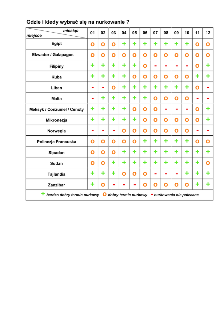 Gdzie i kiedy wybrać się na nurkowanie ? miesiąc miejsce Egipt Ekwador / Galapagos Filipiny 01 02 03 04 05 06 07 08 09 10 11 12 o o o + + + + + + + o o o o o o o o o o o o o o + + + + + o - - - - o + Kuba + + + + o o o o o o + + Liban - - Malta - + + + + + o o o o Meksyk / Conzumel / Cenoty Mikronezja Norwegia o + + + + + + + o + + + + o o o - - - - - o + + + + + + o o o o o o + - - - o o o o o o o - - Polinezja Francuska o o o o o + + + + + o o Sipadan o o o + + + + + + + + + Sudan o o + + + + + + + + + o Tajlandia + + + o o o - - - + + + + o - - - o o o o o + + + bardzo dobry termin nurkowy o dobry termin nurkowy - nurkowania nie polecane Zanzibar