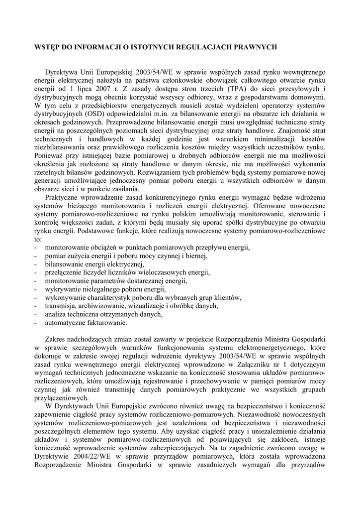 WSTĘP DO INFORMACJI O ISTOTNYCH REGULACJACH PRAWNYCH Dyrektywa Unii Europejskiej 2003/54/WE w sprawie wspólnych zasad rynku wewnętrznego energii elektrycznej nałożyła na państwa członkowskie obowiązek całkowitego otwarcie rynku energii od 1 lipca 2007 r. Z zasady dostępu stron trzecich (TPA) do sieci przesyłowych i dystrybucyjnych mogą obecnie korzystać wszyscy odbiorcy, wraz z gospodarstwami domowymi. W tym celu z przedsiębiorstw energetycznych musieli zostać wydzieleni operatorzy systemów dystrybucyjnych (OSD) odpowiedzialni m.in. za bilansowanie energii na obszarze ich działania w okresach godzinowych. Przeprowadzone bilansowanie energii musi uwzględniać techniczne straty energii na poszczególnych poziomach sieci dystrybucyjnej oraz straty handlowe. Znajomość strat technicznych i handlowych w każdej godzinie jest warunkiem minimalizacji kosztów niezbilansowania oraz prawidłowego rozliczenia kosztów między wszystkich uczestników rynku. Ponieważ przy istniejącej bazie pomiarowej u drobnych odbiorców energii nie ma możliwości określenia jak rozłożone są straty handlowe w danym okresie, nie ma możliwości wykonania rzetelnych bilansów godzinowych. Rozwiązaniem tych problemów będą systemy pomiarowe nowej generacji umożliwiające jednoczesny pomiar poboru energii u wszystkich odbiorców w danym obszarze sieci i w punkcie zasilania. Praktyczne wprowadzenie zasad konkurencyjnego rynku energii wymagać będzie wdrożenia systemów bieżącego monitorowania i rozliczeń energii elektrycznej. Oferowane nowoczesne systemy pomiarowo-rozliczeniowe na rynku polskim umożliwiają monitorowanie, sterowanie i kontrolę większości zadań, z którymi będą musiały się uporać spółki dystrybucyjne po otwarciu rynku energii. Podstawowe funkcje, które realizują nowoczesne systemy pomiarowo-rozliczeniowe to: - monitorowanie obciążeń w punktach pomiarowych przepływu energii, - pomiar zużycia energii i poboru mocy czynnej i biernej, - bilansowanie energii elektrycznej, - przełączenie liczydeł liczników wieloczasowych energii, - monitorowanie parametrów dostarczanej energii, - wykrywanie nielegalnego poboru energii, - wykonywanie charakterystyk poboru dla wybranych grup klientów, - transmisja, archiwizowanie, wizualizacje i obróbkę danych, - analiza techniczna otrzymanych danych, - automatyczne fakturowanie. Zakres nadchodzących zmian został zawarty w projekcie Rozporządzenia Ministra Gospodarki w sprawie szczegółowych warunków funkcjonowania systemu elektroenergetycznego, które dokonuje w zakresie swojej regulacji wdrożenie dyrektywy 2003/54/WE w sprawie wspólnych zasad rynku wewnętrznego energii elektrycznej wprowadzono w Załączniku nr 1 dotyczącym wymagań technicznych jednoznaczne wskazanie na konieczność stosowania układów pomiaroworozliczeniowych, które umożliwiają rejestrowanie i przechowywanie w pamięci pomiarów mocy czynnej jak również transmisję danych pomiarowych praktycznie we wszystkich grupach przyłączeniowych. W Dyrektywach Unii Europejskie zwrócono również uwagę na bezpieczeństwo i konieczność zapewnienie ciągłość pracy systemów rozliczeniowo-pomiarowych. Niezawodność nowoczesnych systemów rozliczeniowo-pomiarowych jest uzależniona od bezpieczeństwa i niezawodności poszczególnych elementów tego systemu. Aby uzyskać ciągłość pracy i uniezależnienie działania układów i systemów pomiarowo-rozliczeniowych od pojawiających się zakłóceń, istnieje konieczność wprowadzenie systemów zabezpieczających. Na to zagadnienie zwrócono uwagę w Dyrektywie 2004/22/WE w sprawie przyrządów pomiarowych, która została wprowadzona Rozporządzenie Ministra Gospodarki w sprawie zasadniczych wymagań dla przyrządów pomiarowych w Dzienniku Ustaw nr 3, 2007 r., poz 27. W Rozporządzeniu zamieszczono zasadnicze wymagania dla liczników energii elektrycznej czynnej wskazując, iż „licznik powinien być zabezpieczony przed zmianą charakterystyk metrologicznych z powodu wystąpienia wyładowań atmosferycznych, jeżeli istnieje ryzyko ich wystąpienia lub gdy przeważające są napowietrzne linie zasilające”. Takie zapisy wskazują na konieczność tworzenia bezpiecznego środowiska dla licznika energii elektrycznej czynnej w miejscu jego instalacji. Przekazujemy w Państwa ręce obszerny materiał dotyczący szczegółowych rozwiązań dla wymagań stawianych przez dyrektywy Unii Europejskiej wdrażane na rynku polskim przez poszczególne rozporządzenia Ministra Gospodarki. ISTOTNE REGULACJE PRAWNE W poniższej części publikacji przedstawimy wyciąg z istotnych zapisów Dyrektyw Parlamentu Europejskiego i Rady 2003/54/WE dotyczącej Wspólnych zasad rynku wewnętrznego energii elektrycznej i 2004/22/WE w sprawie przyrządów pomiarowych oraz Rozporządzeń Ministra Gospodarki wdrażających poszczególne dyrektywy. I. Wspólne zasady rynku wewnętrznego energii elektrycznej Część A: Wyciąg z zapisów Dyrektywy 2003/54/WE DYREKTYWA 2003/54/WE PARLAMENTU EUROPEJSKIEGO I RADY z dnia 26 czerwca 2003 r. dotycząca wspólnych zasad rynku wewnętrznego energii elektrycznej i uchylająca dyrektywę 96/92/WE (20) Odbiorcy energii elektrycznej powinni mieć prawo swobodnego wyboru swego dostawcy. Tym niemniej, dla całkowitego osiągnięcia rynku wewnętrznego energii elektrycznej powinno się przyjąć podejście etapowe, dla umożliwienia dostosowania się przemysłu i zapewnienia istnienia właściwych środków i systemów ochrony interesów odbiorców oraz zapewnienia im rzeczywistego i skutecznego prawa wyboru ich dostawcy. (21) Stopniowe otwieranie rynku na rzecz pełnej konkurencji powinno jak najszybciej usuwać różnice między Państwami Członkowskimi. Należy zapewnić przejrzystość i pewność stosowania niniejszej dyrektywy. ROZDZIAŁ II OGÓLNE REGUŁY ORGANIZACJI SEKTORA Artykuł 5 Reguły techniczne Państwa Członkowskie zapewniają zdefiniowanie kryteriów bezpi