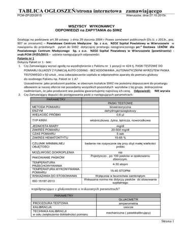 TABLICA OGŁOSZEŃ/strona internetowa zamawiającego Wieruszów, dnia 27.10.2015r. PCM-ZP/2D/2015 WSZYSCY WYKONAWCY ODPOWIEDZI na ZAPYTANIA do SIWZ Działając na podstawie art.38 ustawy z dnia 29 stycznia 2004 r Prawo zamówień publicznych (Dz.U. z 2013r., poz. 907 ze zmianami) – Powiatowe Centrum Medyczne Sp. z o.o. NZOZ Szpital Powiatowy w Wieruszowie w nawiązaniu do przesłanych pytań do SIWZ dotyczącej przetargu nieograniczonego pn:” Dostawa LEKÓW dla Powiatowego Centrum Medycznego Sp. z o.o. NZOZ Szpital Powiatowy w Wieruszowie (powtórzenie) znak:PCM-ZP/2D/2015 – udziela następujących odpowiedzi: Pytanie nr 1 Dotyczy Pakiet nr 1 - leki: 1. Czy Zamawiający wyrazi zgodę na wyodrębnienie z Pakietu nr 1 pozycji nr 424 tj. PASKI TESTOWE DO POMIARU GLUKOZY Z FUNKCJĄ AUTO CODING - BEZ KODOWANIA ,AUTOMATYCZNYM WYRZUTEM PASKA TESTOWEGO x 50 sztuk , oraz zabezpieczenie szpitala w odpowiednie aparaty do pomiaru glukozy do osobnego Pakietu np. Pakiet nr 1 A? Uzasadnienie: jako producent pasków, w obecnym kształcie SIWZ nie jesteśmy dopuszczeni do przetargu albowiem w naszej ofercie nie posiadamy wszystkich pozostałych wyrobów z tej grupy. Jednocześnie nadmieniam, że jako producent ww pasków gwarantujemy najniższą ich cenę. Odpowiedź: NIE wyraża 2. Czy Zamawiający dopuści do postępowania paski o następujących parametrach: PARAMETRY PASKI TESTOWE biosensoryczna dehydrogenazaglukozy 0,6 µl METODA POMIARU ENZYM WIELKOŚĆ PRÓBKI włośniczkowa, żylna, tętnicza, noworodkowa TYP KRWI JEDNOSTA MIARY ZAKRES POMIARU CZAS POMIARU ZAKRES HEMATOKTYTU CZUJNIK MINIMALNEJ OBJĘTOŚCI mg/dl 20-500 mg/dl 5 sek 15-65 % badanie nie rozpocznie się przy zbyt małej wielkości próbki MOŻLIWOŚĆ DOKROPLENIA nie Pojedynczo , po 100 pasków w opakowaniu zbiorczym. PAKOWANIE PASKÓW TEMPERATURA PRZECHOWYWANIA TEMPERATURA WYKONYWANIA POMIARU WSKAZANIA DO STOSOWANIA ISO 15197-2013 4-30 stopni 15-40 STOPNI Wyłącznie w lecznictwie zamkniętym Wskazana norma nie dotyczy pasków do stosowania szpitalnego współpracujące z glukometrem o wskazanych parametrach? PARAMETRY PROCEDURA TESTOWA KALIBRACJA TECHNIKA KALIBRACJI w celu zwiększenia dokładności pomiaru GLUKOMETR amperometria osocze mechaniczna ( pasekkalibrujący) Strona 1 WYŚWIETLACZ PAMIĘĆ ZASILANIE ILOŚĆ POMIARÓW PRZY 1 BATERII AUTOMATYCZNE WYŁACZENIE WAGA TEMPERATURA PRZECHOWYWANIA TEMPERATURA WYKONYWANIA POMIARU KOMUNIKATY WSKAZANIA DO STOSOWANIA ISO 15197-2013 CYFRY 1,9 CM 1000 wyników 2 baterie CR 2032 3000 po 120 sek 33-37 gramów OD -20 DO 60 STOPNI 10-50 STOPNI LO, HI, KETONES Wyłącznie w lecznictwie zamkniętym Wskazana norma nie dotyczy pasków do stosowania szpitalnego Odpowiedź: NIE dopuszcza 3. Czy Zamawiający wyrazi zgodę na wyłączenie dla pozycji nr 424 pakietu nr 1, zapisu SIWZ, rozdział XIV pkt 1, według którego termin dostaw w trybie „cito” jest jednym z kryteriów oceny oferty, z uwagi na fakt, że paski diagnostyczne nie są produktami dostarczanymi na ratunek? Odpowiedź: Zamawiający wyraża zgodę i zezwala na utworzenie WYKONAWCY z pozycji 424 pakietu nr 1 odrębnego pakietu, który będzie oznaczony : Pakiet nr 1A ( z pozycji 424). Dla tego Pakietu nr 1A obowiązywać będzie kryterium – Cena=100% . Pytanie nr 2 Zapytanie 1: Czy Zamawiający wymaga, aby w pakiecie Nr 1 poz. 95 i 96 (BUDESONIDUM 0,125 i 0,25 mg/ml zaw. do inh. z nebuliz.) posiadał zarejestrowane wskazanie u pacjentów z zespołem krupu- ostrym zapaleniem krtani, tchawicy i oskrzeli-niezależnie od etiologii ? Odpowiedź: TAK wymaga Zapytanie 2: Czy w pakiecie Nr 1 poz. 95, 96 i 97 (BUDESONIDUM 0,125; 0,25 i 0,5 mg/ml zaw. do inh. z nebuliz.) Zamawiający wymaga produktu, po którego zastosowaniu poprawa stanu klinicznego może nastąpić już w ciągu kilku godzin od rozpoczęcia leczenia? Odpowiedź: TAK wymaga Zapytanie 3: Czy Zamawiający w pakiecie Nr 1 poz. 96 (BUDESONIDUM 0,25 mg/ml zaw. do inh. z nebuliz.) wyraża zgodę na wycenę leku, którego zawartości po otwarciu pojemnika nie można, zgodnie z obowiązującą Charakterystyką Produktu Leczniczego, przechowywać do 12 godzin? Odpowiedź: TAK wyraża Zapytanie 4: Czy Zamawiajacy w pakiecie Nr 1 poz. 95, 96 i 97 (BUDESONIDUM 0,125; 0,25 i 0,5 mg/ml zaw. do inh. z nebuliz.) wymaga, aby leki o tej samej nazwie międzynarodowej lecz w różnych dawkach pochodziły od tego samego producenta ? Odpowiedź: TAK wymaga Zapytanie 5: Czy Zamawiający w pakiecie Nr 1 poz. 351 i 352 (METOPROLOLUM SUCCINAS 100 i 50 mg x 28 tabl.) wymaga, aby preparat posiadał zarejestrowane wskazanie w leczeniu zaburzeń rytmu serca takich jak: tachykardie nadkomorowe, ekstrasystolie pochodzenia komorowego i migotanie przedsionków? Odpowiedź: TAK wymaga Zapytanie 6: Czy Zamawiający w pakiecie Nr 1 poz. 100 (BUPIVACAINI H/CHLORIDUM 5mg/ml 4ml x 5amp.) wymaga zaoferowania produktu pakowanego w jałowe blistry? Odpowiedź: NIE wymaga Pytanie nr 3 1. Czy Zamawiający w Pakiecie nr 1 w Poz. 424 wymaga, aby cena za aparaty do pomiaru glukozy była wliczona w cenę zakupu pasków? Jeśli tak prosimy o określenie ilości aparatów potrzebnych Zamawiającemu. ? Odpowiedź: Tak wymaga min 20 szt. 2. Czy Zamawiający w Pakiecie nr 1 w Poz. 424 wymaga, aby zgodnie z instrukcją obsługi,zestaw do monitorowania stężenia glukozy we krwi zawierał – obok glukometru – także płyn kontrolny(co potwierdzone jest w instrukcji obsługi)? Odpowiedź: TAK wymaga 3. Czy Zamawiający w Pakiecie nr 1 w Poz. 424 wymaga dostarczenia do oferty dokumentów (instrukcja obsługi pasków, glukometrów), które to dokumenty pozwalają jednoznacznie potwierdzić spełnianie parametrów oczekiwanych przez Zamawiającego i zawartych w SIWZ? Odpowiedź: TAK wymaga 4. Czy Zamawiający w Pakiecie nr 1 w Poz. 424 dopuści do postępowania paski w przypadku których kapilara do zasysania krwi umiejscowiona jest w przedniej części paska nieco poniżej szczytu (nie na czubku paska)? Odpowiedź: Nie do