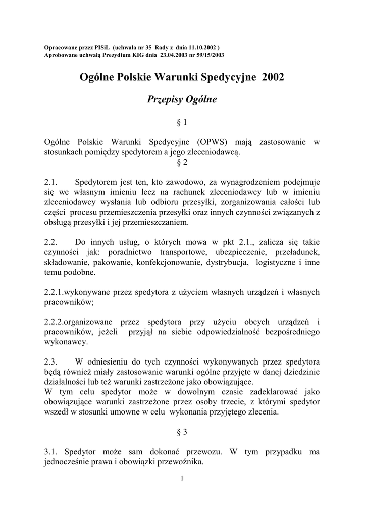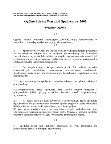 Opracowane przez PISiL (uchwała nr 35 Rady z dnia 11.10.2002 ) Aprobowane uchwałą Prezydium KIG dnia 23.04.2003 nr 59/15/2003 Ogólne Polskie Warunki Spedycyjne 2002 Przepisy Ogólne §1 Ogólne Polskie Warunki Spedycyjne (OPWS) mają zastosowanie w stosunkach pomiędzy spedytorem a jego zleceniodawcą. §2 2.1. Spedytorem jest ten, kto zawodowo, za wynagrodzeniem podejmuje się we własnym imieniu lecz na rachunek zleceniodawcy lub w imieniu zleceniodawcy wysłania lub odbioru przesyłki, zorganizowania całości lub części procesu przemieszczenia przesyłki oraz innych czynności związanych z obsługą przesyłki i jej przemieszczaniem. 2.2. Do innych usług, o których mowa w pkt 2.1., zalicza się takie czynności jak: poradnictwo transportowe, ubezpieczenie, przeładunek, składowanie, pakowanie, konfekcjonowanie, dystrybucja, logistyczne i inne temu podobne. 2.2.1.wykonywane przez spedytora z uŜyciem własnych urządzeń i własnych pracowników; 2.2.2.organizowane przez spedytora przy uŜyciu obcych urządzeń i pracowników, jeŜeli przyjął na siebie odpowiedzialność bezpośredniego wykonawcy. 2.3. W odniesieniu do tych czynności wykonywanych przez spedytora będą równieŜ miały zastosowanie warunki ogólne przyjęte w danej dziedzinie działalności lub teŜ warunki zastrzeŜone jako obowiązujące. W tym celu spedytor moŜe w dowolnym czasie zadeklarować jako obowiązujące warunki zastrzeŜone przez osoby trzecie, z którymi spedytor wszedł w stosunki umowne w celu wykonania przyjętego zlecenia. §3 3.1. Spedytor moŜe sam dokonać przewozu. W tym przypadku ma jednocześnie prawa i obowiązki przewoźnika. 1 3.2. Spedytor nabywa prawa i obowiązki przewoźnika w przypadku gdy: 3.2.1. dokonuje przewozu własnym taborem i wystawia przewozowy; dokument 3.2.2. występuje jako przewoźnik morski lub operator transportu multimodalnego wystawiając własny konosament lub konosament FIATA, zwany Negotiable FIATA Multimodal Transport Bill of Lading; 3.2.3. dokonuje przewozu taborem obcym lecz wystawia dokument przewozowy (przewoźnik umowny); 3.2.4. przyjmuje zlecenie transportowe. §4 Zleceniodawcą w rozumieniu niniejszych warunków jest osoba/strona zawierająca umowę ze spedytorem, zlecająca mu realizację zadań i czynności lub wstępująca w prawa tejŜe strony. §5 Postanowienia niniejszych warunków nie mają zastosowania do spedycji pieniędzy, papierów wartościowych, dokumentów, kosztowności i innych przedmiotów szczególnie cennych. Oferty §6 ZłoŜona przez spedytora oferta obejmuje tylko te czynności, które są w niej wymienione i zachowuje waŜność w określonym terminie. 6.1. Oferta spedytora i uzgodnienia dotyczące stawek i usług (własnych lub osób trzecich) odnoszą się tylko do towarów określonych w zleceniu oraz zakładają typowe, nie zakłócone warunki jej realizacji. 6.2. W przypadku braku innych uzgodnień, kaŜda oferta lub kwotowanie zachowuje waŜność w przypadku ich niezwłocznego potwierdzenia przez zleceniodawcę i tylko wtedy, kiedy zlecenie do nich nawiązuje. 2 6.3. W przypadku zmiany któregokolwiek elementu oferty, zaistniałej z przyczyn zewnętrznych, niezaleŜnych od spedytora, podane lub uzgodnione ceny będą odpowiednio korygowane wstecz do momentu, gdy zmiana ta wystąpiła. Korekta oferty wynikająca ze zmiany któregokolwiek jej elementu z przyczyn leŜących po stronie spedytora, wymaga zgody drugiej strony, tj. zleceniodawcy. 6.4. JeŜeli spedytor, zaleŜnie od sytuacji stosuje stawki zryczałtowane, rozumie się Ŝe w przypadku braku innych uzgodnień stawki te zawierają wszystkie koszty ponoszone przez spedytora podczas nie zakłóconego przebiegu procesu spedycyjnego. Umowa spedycji §7 7.1. Przez umowę spedycji spedytor zobowiązuje się za wynagrodzeniem, w zakresie działalności swego przedsiębiorstwa do wysłania lub odbioru przesyłki albo do dokonania innych usług związanych z jej przewozem. 7.2. Umowę spedycji uwaŜa się za zawartą w chwili otrzymania przez spedytora zlecenia, chyba Ŝe spedytor bez zwłoki zawiadomi dającego zlecenie o odmowie jego przyjęcia. Zlecenie spedycyjne §8 8.1. Spedytor wykonuje czynności na podstawie zlecenia . 8.2. Zlecenie dla jego waŜności nie wymaga formy pisemnej, jednakŜe dla uniknięcia nieporozumień i nieprawidłowości w jego realizacji zaleca się by wystawione zostało lub potwierdzone w formie pisemnej lub podobnej (fax, email). 8.2.1. Spedytor nie jest odpowiedzialny za następstwa błędów i nieporozumień wynikłych w związku z otrzymaniem zlecenia ustnie lub telefonicznie. 8.2.2. Spedytor nie jest odpowiedzialny za skutki dodatkowych instrukcji udzielanych przez zleceniodawcę bezpośrednio innym stronom uczestniczącym w realizacji spedycji. 3 8.3. Zlecenie powinno zawierać wszystkie niezbędne informacje o przesyłce i o jej właściwościach, znaki i numery poszczególnych sztuk (opakowań), ich liczbę, cięŜar, wymiary, kubaturę, a takŜe określać zakres zlecanej usługi oraz wszelkie inne dane i dokumenty potrzebne dla prawidłowego wykonania zlecenia. 8.4. Zleceniodawca ma obowiązek udzielenia zlecenia kompletnego i prawidłowego. Zleceniodawcę obciąŜają konsekwencje zaistniałe wobec spedytora i osób trzecich w następstwie podania w zleceniu niedokładnych, niekompletnych i nieprawidłowych danych przy czym odnosi się to równieŜ do danych zawartych w dokumentach, korespondencji oraz podanych na przesyłce informacji co do ilości, wagi, wymiarów i właściwości, a takŜe wadliwego opakowania przesyłki, itp., nawet wtedy gdy niedokładność, niekompletność, względnie nieprawidłowość powstały bez jego winy. 8.5. Spedytor nie ma obowiązku, lecz jest uprawniony do sprawdzenia, czy przedstawione mu w zleceniu dane są poprawne i wyczerpujące. 8.6. Spedytor ma prawo, ale nie obowiązek sprawdzenia prawdziwości podpisów i uprawnień osób podpisanych na zleceniach, zawiadomieniach, przelewach, przek