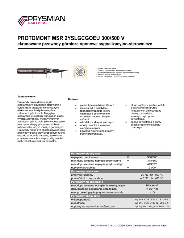 PROTOMONT MSR 2YSLGCGOEU 300/500 V ekranowane przewody górnicze oponowe sygnalizacyjno-sterownicze -1 giętka żyła miedziana -2 izolacja z polietylenu termoplastycznego -3 powłoka wewnętrzna z gumy polichloroprenowej -4 ekran z drutów miedzianych -5 opona zenętrzna z gumy polichloroprenowej Zastosowanie: Budowa: Przewody przewidziane są do stosowania w obwodach sterowania i sygnalizacji urządzeń elektrycznych i elektronicznych użytkowanych w zakładach górniczych. Mogą być stosowane w ciężkich warunkach pracy, występujących np. w odkrywkowych zakładach górniczych, jako wyposażenie maszyn urabiających, przenośników taśmowych i innych maszyn górniczych. Przewody mogą być eksploatowane jako przewody giętkie przy swobodnym ruchu oraz do układania na stałe; zarówno w pomieszczeniach suchych, wilgotnych i mokrych jak również na zewnątrz. • • • • • giętka żyła miedziana klasy 5 izolacja żył z polietylenu termoplastycznego koloru czarnego z cechowaniem w postaci nadruku białymi cyframi, ośrodek ze skrętek parowych, obwój ośrodka z włókniny niehigroskopijnej, powłoka wewnętrzna z gumy polichloroprenowej, • • Parametry elektryczne napięcie znamionowe V max dopuszczalne napięcie przemienne V max dopuszczalne napięcie prądu stałego napięcie probiercze V Parametry termiczne przewód ruchomy przewód ułożony na stale Parametry mechaniczne max dopuszczalne obciążenie rozciągające dopuszczalne obciążenia skręcające min. promień gięcia przy ułożeniu na stale Parametry chemiczne olejoodporność niepalność odporny na warunki atmosferyczne ekran ogólny w postaci oplotu z ocynowanych drutów miedzianych umieszczony pomiędzy powłoką wewnętrzną i oponą zewnętrzną, opona zewnętrzna z gumy polichloroprenowej koloru czarnego. 300/500 318/550 413/825 2 000 -25 °C bis +60 °C -40 °C bis +80 °C 15 N/mm² +/- 25° / m 4xD wg DIN VDE 0473 cz. 811-2-1 wg DIN VDE 0482 cz. 265-2-1 odporny na ozon, promienie UV PROTOMONT 2YSLCGCOEU 500 V Dane techniczne Wersja 3.doc PROTOMONT MSR 2YSLGCGOEU 300/500 Dane techniczne Liczba i przekrój znamionowy żył roboczych nxmm2 2x2x1 5x2x1 10x2x1 20x2x1 średnica zewnętrzna min. mm 11,0 16,0 20,0 25,5 średnica zewnętrzna max. mm 13,0 19,0 23,0 29,0 masa jednostkowa kg/km 245 440 700 1040 max. dopuszczalna siła rozciągająca N 60 150 300 600 min. promień gięcia mm 52 76 92 116 rezystancja żyły w temp. 20 °C Ω/km 19,5 19,5 19,5 19,5 rezystancja żyły w temp. 60 °C Ω/km 22,6 22,6 22,6 22,6 pojemność robocza nF/km 65,0 65,0 65,0 65,0 tłumienność przy 800 Hz dB/km 1,0 1,0 1,0 1,0 tłumienność przy 100 Hz dB/km 3,0(+0,5) 3,0(+0,5) 3,0(+0,5) 3,0(+0,5) obciążalność prądowa przy 30 °C A 12,0 8,5 6,5 5,0 obciążalność prądowa przy 25 °C A 13,0 9,2 7,0 5,4 dopuszczalny prąd zwarciowy (1 sek.) kA 3,05 4,27 6,10 8,54 Budowa przewodu żyła robocza cienkodrutowa żyła miedziana izolacja z polietylenu termoplastycznego skrętka parowa element wypełniający obwój tekstylny powłoka wewnętrzna z gumy polichloroprenowej ekran z ocynowanych drutów miedzianych opona zewnętrzna z gumy polichloroprenowej