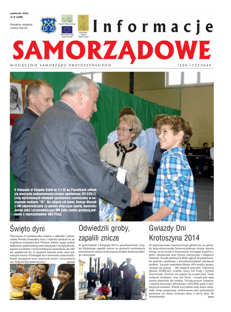 paŸdziernik 2013r. www.is.krotoszyn.pl nr 9 (128) 9 (128) Redaktor wydania: Izabela Bartoœ MIESIĘCZNIK SAMORZĄDU KROTOSZYŃSKIEGO I S S N 1 7 3 2 -2 0 4 9 fot. archiwum Wieczorem 24 października rodzice z oddziału I przedszkola Wesoła Gromadka wraz z dziećmi spotkali się na wspólnym wycinaniu dyń. Wszyscy dobrze znają symbol Halloween, podświetloną świeczką dynię z wyciętymi trójkątami oczodołów i wyszczerbionym uśmiechem, ale nikt nie spodziewał się, że dyniowa latarnia może mieć tyle różnych twarzy. Prześcigali się w tworzeniu zmarszczek i bruzd, posępnych oczu, krzywych nosów i krzyczących ust. Zabawa była fantastyczna! (przed) Odwiedzili groby, zapalili znicze Gwiazdy Dni Krotoszyna 2014 W poniedziałek 4 listopada 2013 r. przedstawiciele Urzędu Miejskiego zapalili znicze na grobach zasłużonych mieszkańców miasta i byłych pracowników krotoszyńskiego samorządu. Po podsumowaniu internetowego plebiscytu na gwiazdy przyszłorocznego krotoszyńskiego święta miasta wiemy, że na scenie w Krotoszynie wystąpią: zespół LemON, Afromental oraz Sylwia Grzeszczak i Zbigniew Wodecki. Wyniki plebiscytu KOK ogłosił 22 października podczas spotkania z przedstawicielami lokalnych mediów. Łącznie nadesłano blisko 160 e-maili z propozycjami na ponad… 100 różnych artystów. Najwięcej głosów ZEBRAŁY: LemOn, Enej, Ich Troje i Sylwia Grzeszczak. Niestety, nie pojawi się zespół Enej - brak wolnych terminów, oraz Ich Troje - zespół pod taką nazwą właściwie nie istnieje. Trwają jeszcze rozmowy z innymi artystami, informację o nich KOK poda w późniejszym terminie. Wśród wszystkich osób, które nadesłały swoje propozycje, rozlosowano pięć podwójnych karnetów na cztery wybrane filmy z oferty kina 3D Przedwiośnie. (kok) 1 fot. Jacek Kêpa Œwiêto dyni fot. Izabela Bartoœ 5 listopada w Zespole Szkó³ nr 2 z OI na Parcelkach odby³o siê uroczyste podsumowanie sezonu sportowego 2012/2013. Listê wyró¿nionych m³odych sportowców zamieœcimy w nastêpnym wydaniu "IS". Na zdjêciu od lewej: Roman Wosiek z UM odpowiedzialny za sprawy dotycz¹ce sportu, burmistrz Julian Jokœ i przewodnicz¹ca RM Zofia Jamka gratuluj¹ jednemu z reprezentantów UKS Piast. 9 (128) Obecnoœæ obowi¹zkowa www.is.krotoszyn.pl Tajwan na fotografii 10 listopada - powiatowo-gminne obchody Narodowego Œwiêta Niepodleg³oœci w Krotoszynie: godz. 17.30 Rynek - ceremonia podniesienie flagi pañstwowej na Ratuszu, przemarsz uczestników na pl. Jana Paw³a II, z³o¿enie wi¹zanek kwiatów pod pomnikiem Wolnoœci; godz. 18.00 koœció³ pw. œw. Aposto³ów Piotra i Paw³a msza œw. w intencji Ojczyzny; godz. 19.30 kino Przedwioœnie - koncert patriotyczny Zespo³u Tañca Ludowego Krotoszanie. 16 paŸdziernika w Galerii Krotoszyñskiej odby³ siê wernisa¿ wystawy fotograficznej „Niezwyk³y Tajwan”, ze zbiorów Biura Gospodarczego i Kulturalnego Tajpej w Warszawie. szyna: starosta Leszek Kulka, burmistrz Julian Jokś i jego zastępca Ryszard Czuszke. Potem w wyparzanych naczynkach mogli spróbować herbaty inni uczestnicy wernisażu. Do oglądania niecodziennych fotografii zachęcali krotoszynian organizatorzy przedsięwzięcia: 11 listopada o godz. 17.00 w auli I LO w Krotoszynie odbêdzie siê koncert z cyklu In Regenerationem. Na wystêp zespo³u The Sunday Singers zaprasza Stowarzyszenie Mi³oœników Muzyki. Do 15 listopada w galerii Refektarz na Ma³ym Rynku mo¿na ogl¹daæ wystawê ceramiki Beaty Ulbrych i Cezarego Grendy. Do 3 grudnia w krotoszyñskim Muzeum Regionalnym mo¿na ogl¹daæ wystawê „Wrzesieñ 1939”. Uwaga! Roboty drogowe na przejeŸdzie kolejowym na KoŸmiñskiej. Od 13 listopada godz. 9.00 do 18 listopada godz. 22.00 przejazd bêdzie CA£KOWICIE zamkniêty. Trasa objazdu od strony Poznania: od ronda na ul. KoŸmiñskiej – ulica Wiejska, Œciegiennego - Osadnicza - szosa Benicka - skrzy¿owania z Grudzielskiego – Kobyliñska – Mickiewicza - do skrzy¿owania z Sienkiewicza. Trasa objazdu w drug¹ stronê wiedzie tymi samymi ulicami. Objazd z Ostrowa Wielkopolskiego do Poznania: od ronda na skrzy¿owaniu ulic Raszkowskiej, KoŸmiñskiej i Mickiewicza - Mickiewicza - dalej jak objazd z Wroc³awia do Poznania. na guzhengu, starodawnym chińskim instrumencie przypominającym cytrę, oraz pokaz parzenia herbaty, oba wykonane przez przybyłą specjalnie na tę okazję z Warszawy Annę Krysztofiak. W pierwszej trójce do kosztowania trunku stanęli włodarze Kroto- Kurze kr¹g³oœci w Refektarzu Stowarzyszenie Miłośników Muzyki zaprasza na koncert z cyklu In Regenerationem. 11 listopada br. o godz. 17.00 w auli I Liceum Ogólnokształcącego wystapi zespół The Sunday Singers. Koncert finansowany jest ze środków pozyskanych z otwartego konkursu ofert burmistrza Krotoszyna dla organizacji pozarządowych. Stra¿ Miejska 725 725 722 722 722 722 722 42 34 74 74 74 74 74 01 36 58 14 51 07 57 Burmistrz Julian Jokœ przyjmuje interesantów we wtorki w godz. 15.30 – 16.30. Przewodnicz¹ca Rady Miejskiej Zofia Jamka przyjmuje interesantów we wtorki w godz. 14.00 – 15.00. Starostwo Powiatowe (62) 725 42 56 (62) 725 42 57 Powiatowy Urz¹d Pracy (62) 725 36 84 (62) 725 44 56 Komenda Powiatowa Policji w Krotoszynie (62) 725 52 00 Komenda Powiatowa Pañstwowej Stra¿y Po¿arnej (62) 725 29 21 (62) 725 29 22 Miejsko-Gminny Oœrodek Pomocy Spo³ecznej (62) 725 36 68 (62) 725 39 96 Urz¹d Skarbowy 2 Kilkadziesiąt osób pojawiło się 12 października w galerii Refektarz na wernisażu wystawy ceramiki Beaty Ulbrych (szefowej galerii) i jej męża Cezarego Grendy. Po raz pierwszy Beata wystąpiła w galerii w roli gospodyni spotkania i zarazem gościa, co było dla niej sytuacją niecodzienną. Cezary, na co dzień nauczyciel i trener karate, również po raz pierwszy zaprezentował swoją pasję szerszej publiczności. Oboje przyznali, że glina pozytywnie ich uzależniła i szczerze polecają innym spróbowania swoich sił w ce